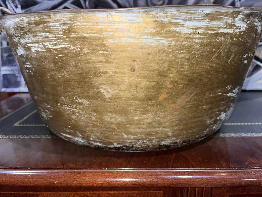 Olla fabricada en cobre de buena calidad de tamaño mediano. Se trata de una olla de cobre que cuenta con un asa para poder cogerla y manipularla con mayor facilidad. Es una olla ideal para tenerla en la cocina del hogar para hervir agua o cocinar cualquier cosa en el día a día. Como se puede observar en las fotografías se encuentra algo desgastada por el uso.