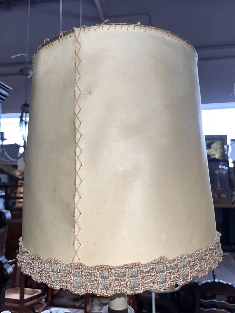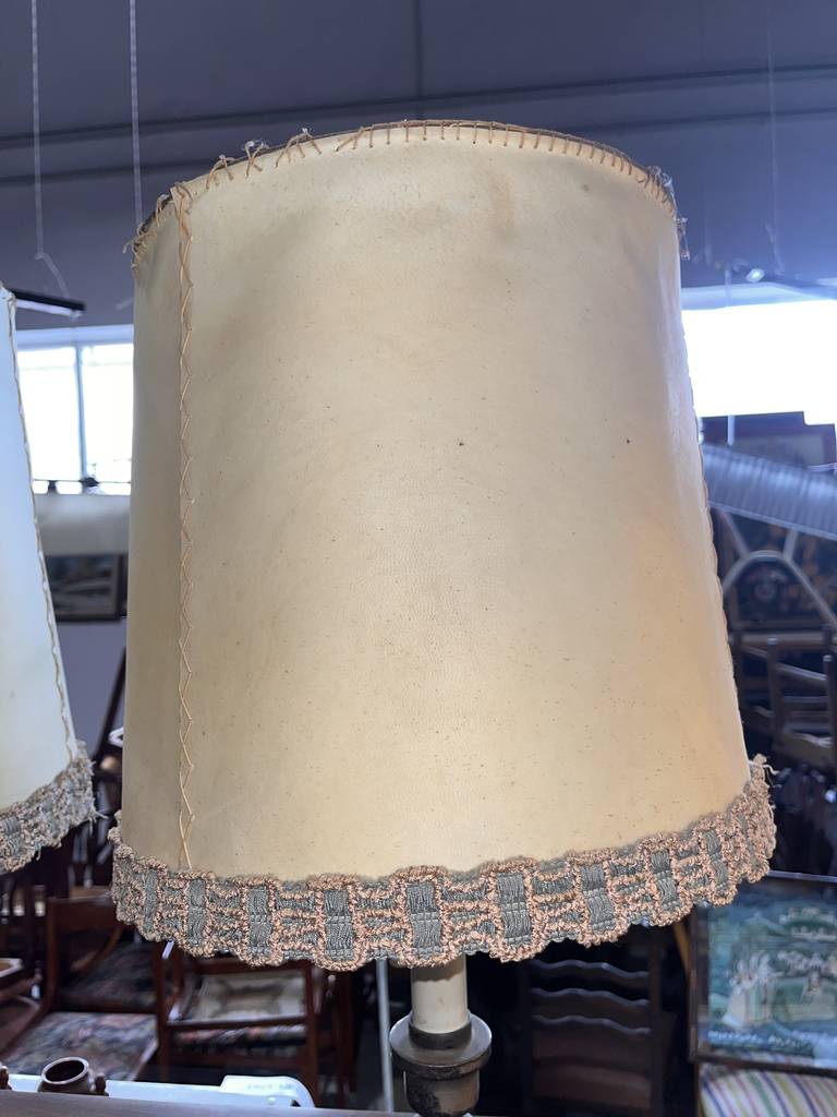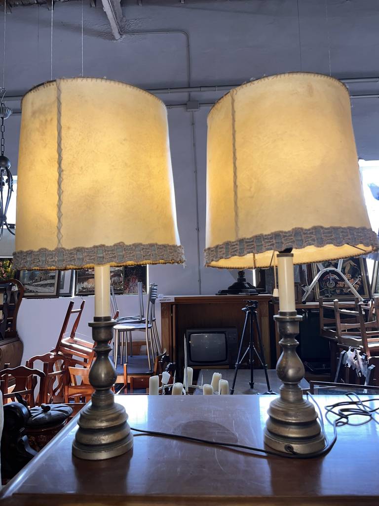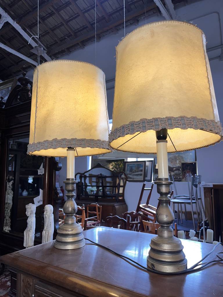 Pareja de lámparas a juego de estilo vintage que se componen de un pie de metal oscuro y en la parte superior un punto de luz rodeado por una tulipa alta con un bonito detalle en el bordado. Son unas lámparas ideales para colocar en un dormitorio al lado de nuestra cama. Como podemos observar en las fotografías se encuentran para restaurar.