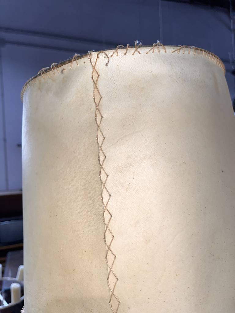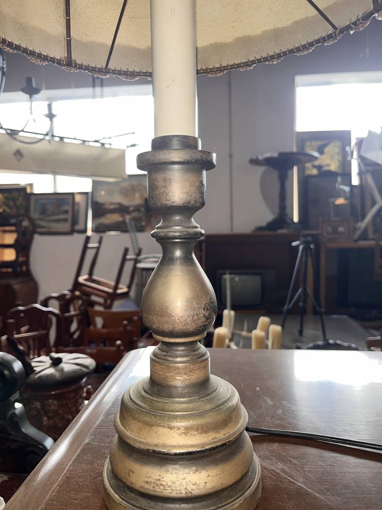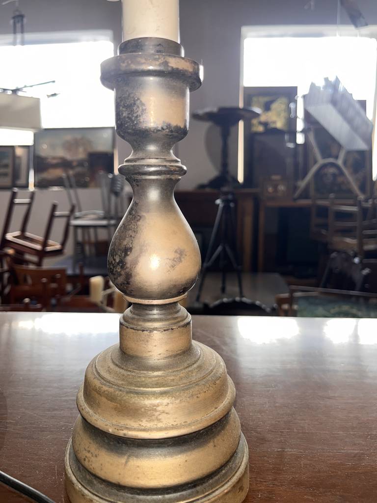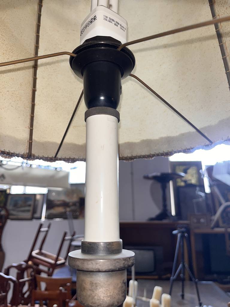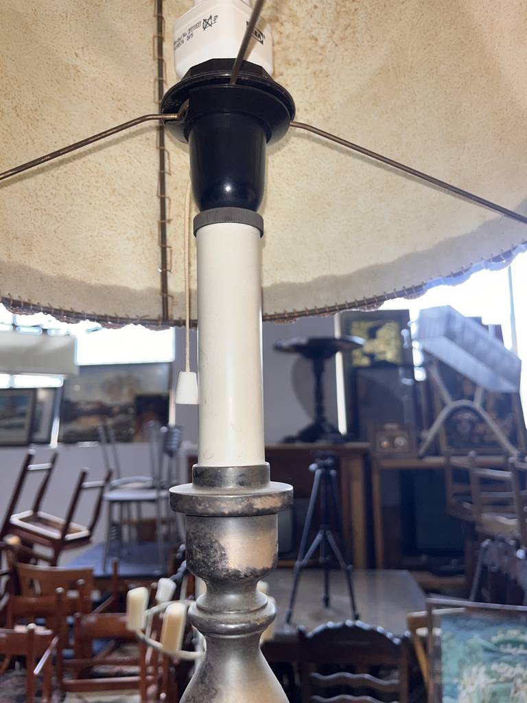 Pareja de lámparas a juego de estilo vintage que se componen de un pie de metal oscuro y en la parte superior un punto de luz rodeado por una tulipa alta con un bonito detalle en el bordado. Son unas lámparas ideales para colocar en un dormitorio al lado de nuestra cama. Como podemos observar en las fotografías se encuentran para restaurar.