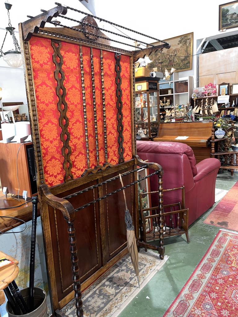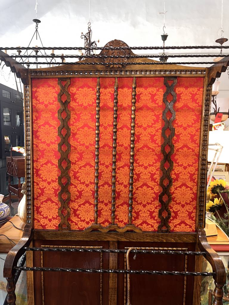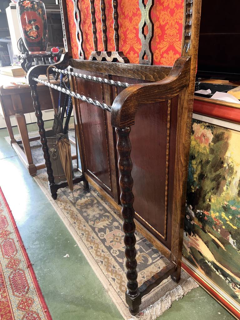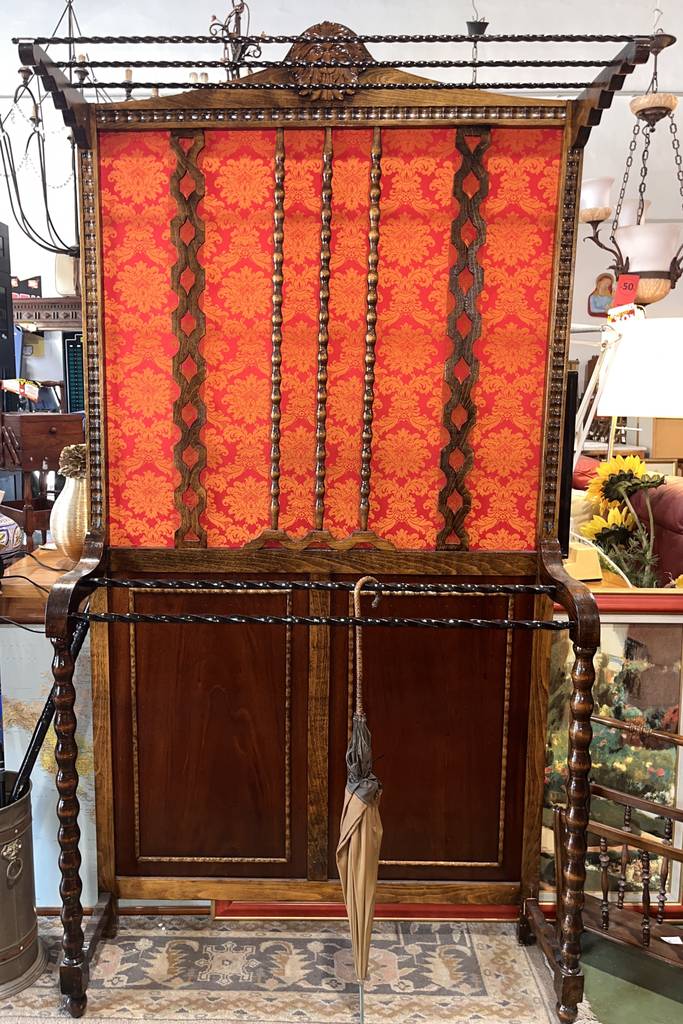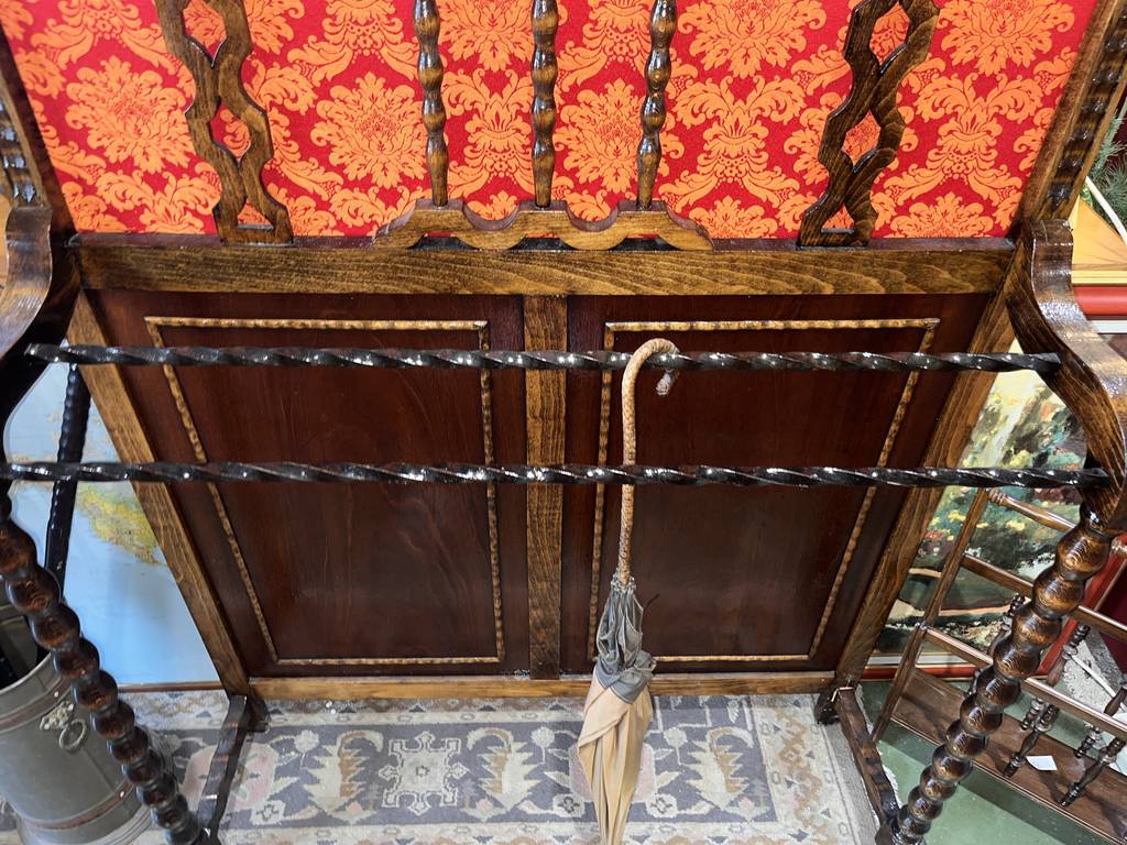 Perchero y paragüero de estilo vintage fabricado en madera de buena calidad de color marrón oscuro con detalles en rojo. Se trata de un mueble clásico que está restaurado y sirve tanto como perchero para colgar prendas de ropa como paragüero para sujetar paraguas. Es un mueble perfecto para colocarlo en la entrada de un hogar clásico. Como se puede observar en las fotografías se encuentra en buenas condiciones.