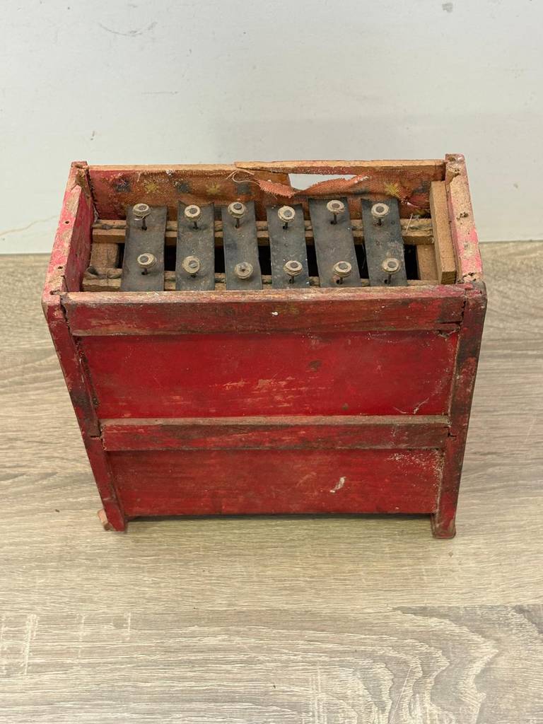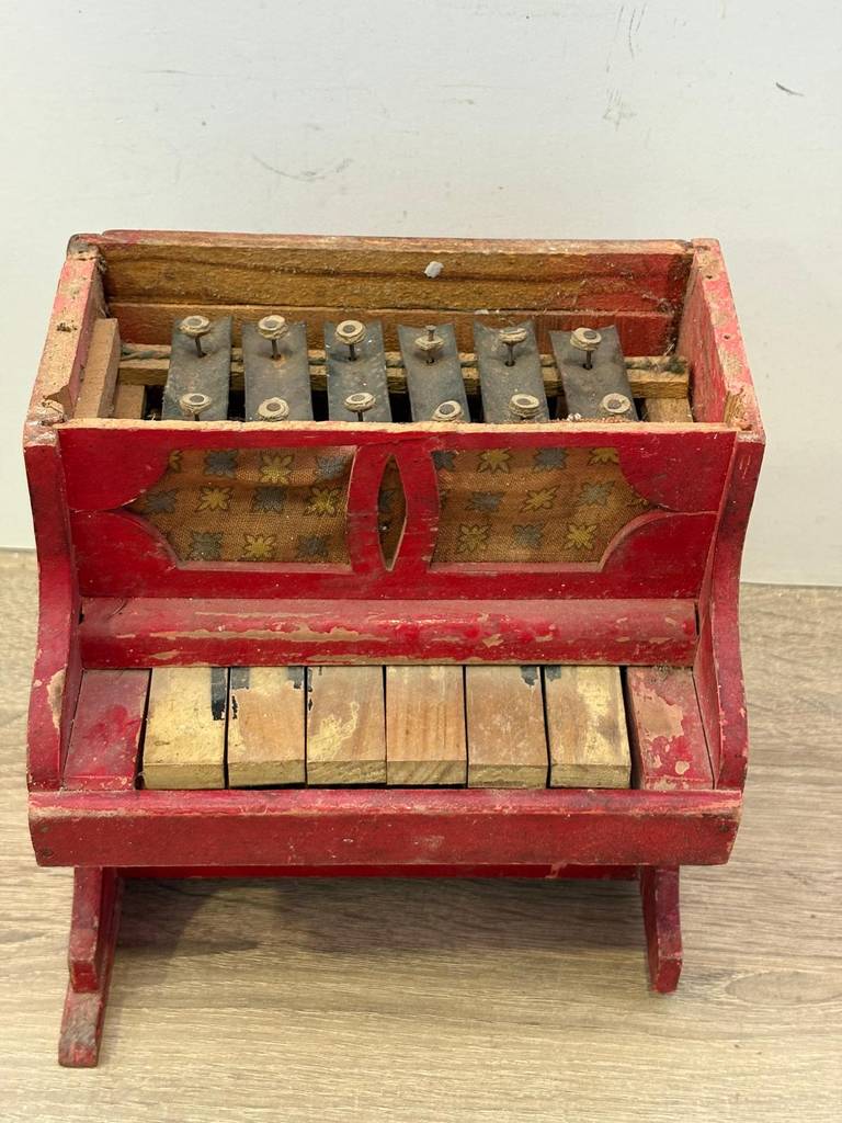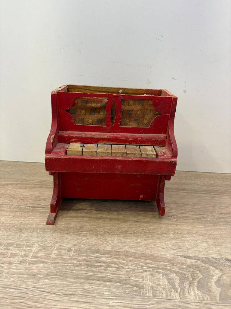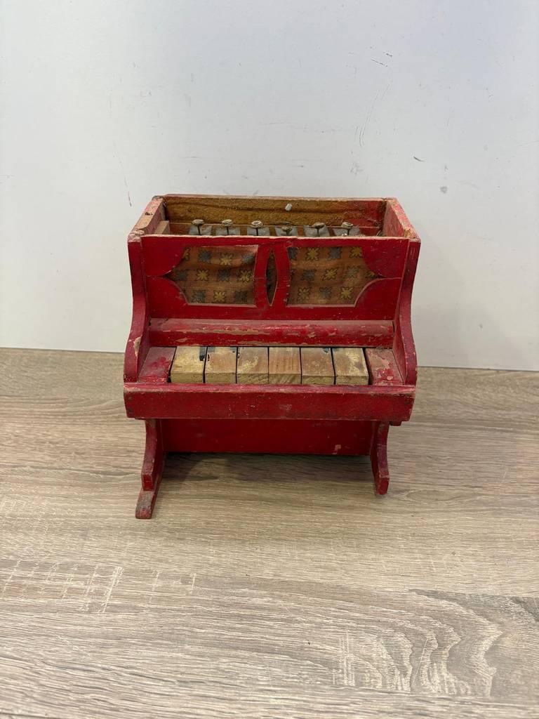 Piano de juguete antiguo de estilo vintage muy coqueto y original. Es una replica de un piano ideal como pieza decorativa muy original. Se ha realizado con madera y detallado con mucha precisión. Como podemos observar en las fotografías presenta desperfectos y funcionan todas las teclas menos dos.