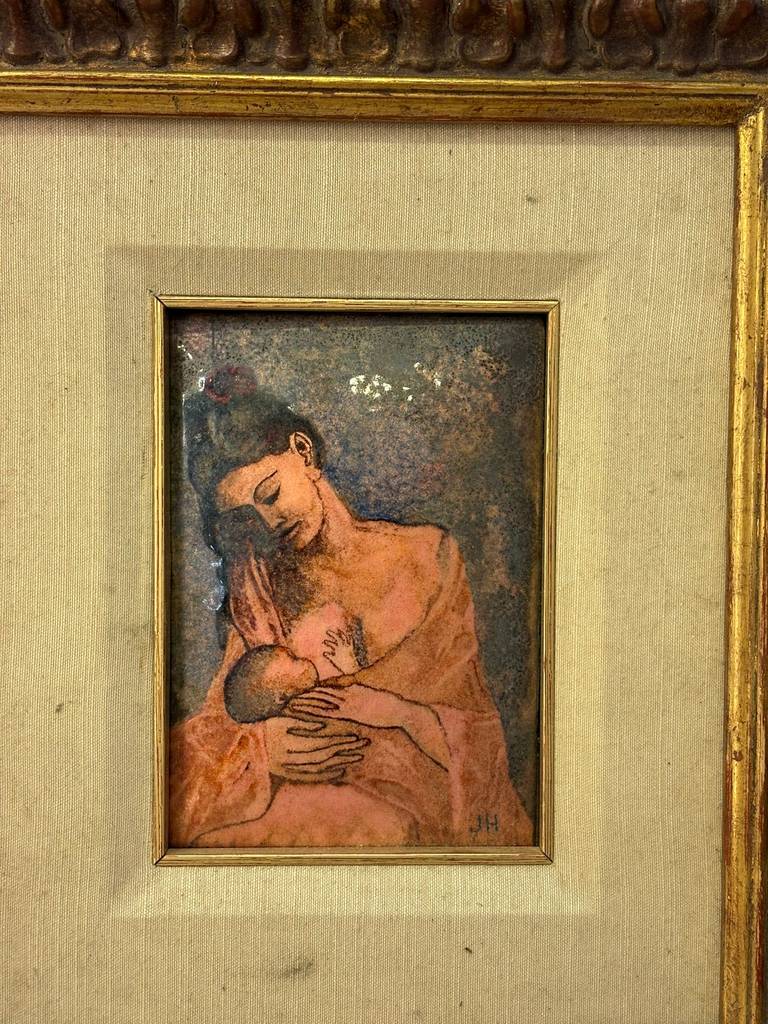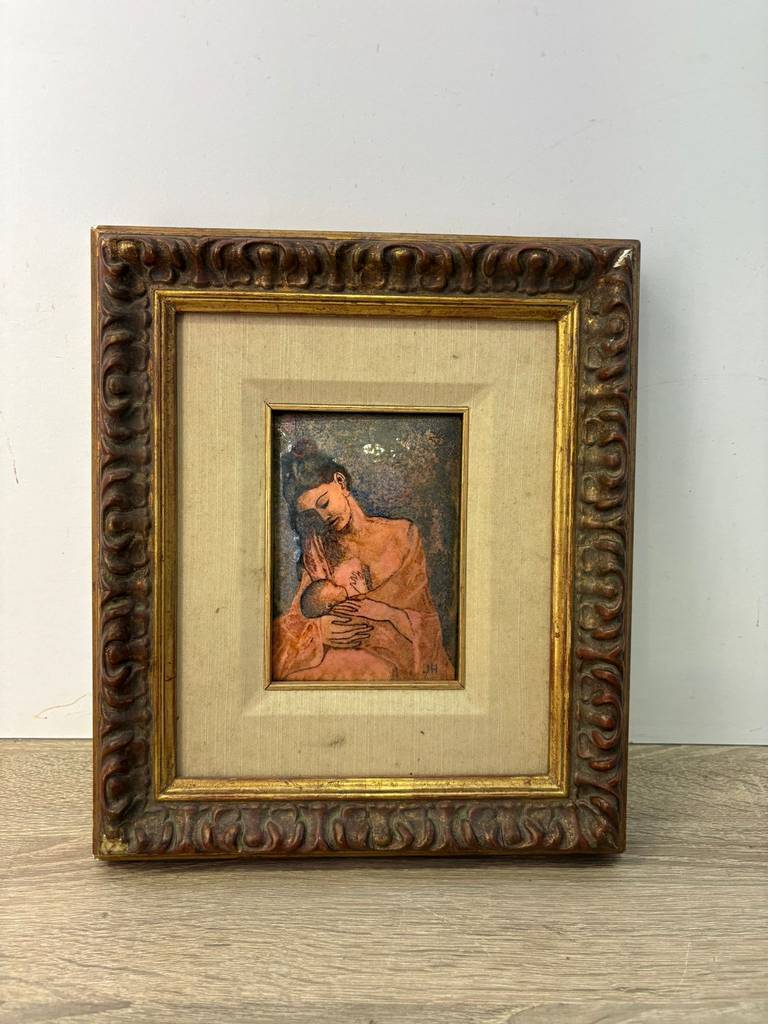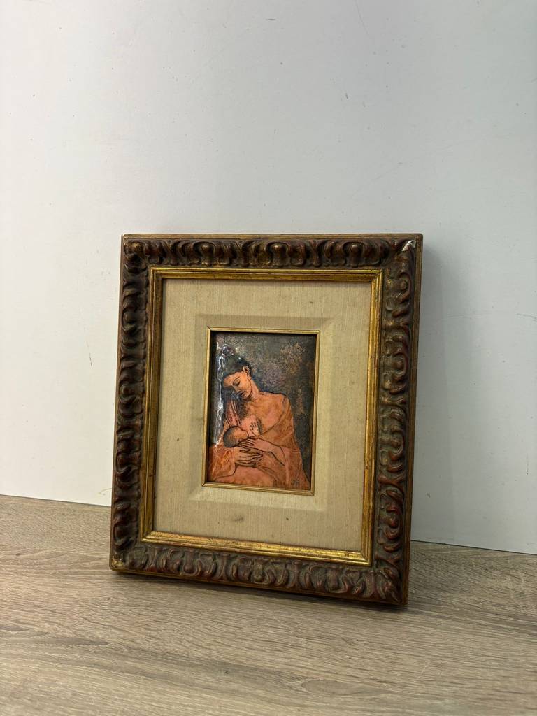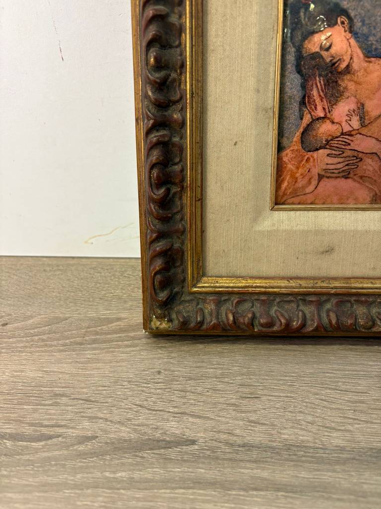 Cuadro muy coqueto y original en el que podemos observar una pintura de una mujer con su bebé a los brazos comiendo de su pecho que ha sido realizado con mucha precisión y detalle. Es ideal para exponer en un salón comedor o en un pasillo de nuestra casa. Está enmarcado con un bonito marco de madera de buena calidad y robusta. Como podemos observar en las fotografías presenta desperfectos.