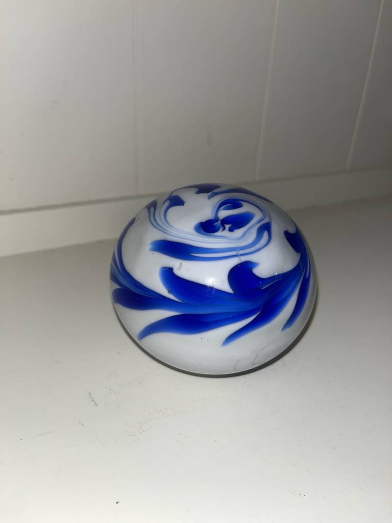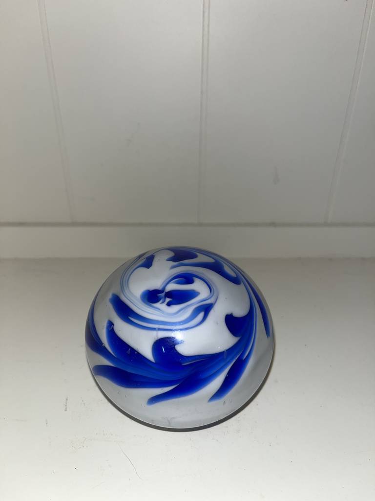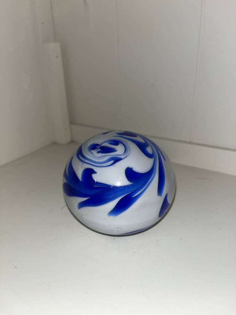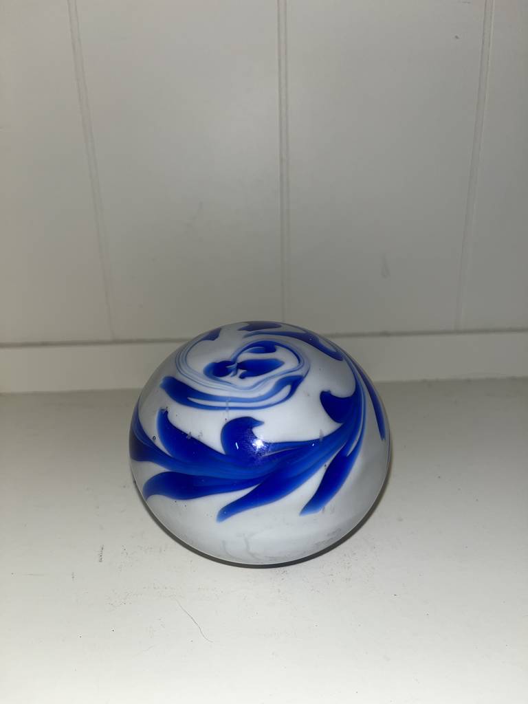 Pisapapeles fabricado en la reconocida isla veneciana de Murano en los años setenta del pasado siglo. Se trata de un pisapapeles que tiene una forma de una esfera de colores claros como el azul y el blanco. Es un objeto de muy buena calidad que resulta ideal para utilizarlo como pisapapeles o como figura decorativa. Como se puede observar en las fotografías se encuentra en buenas condiciones.
