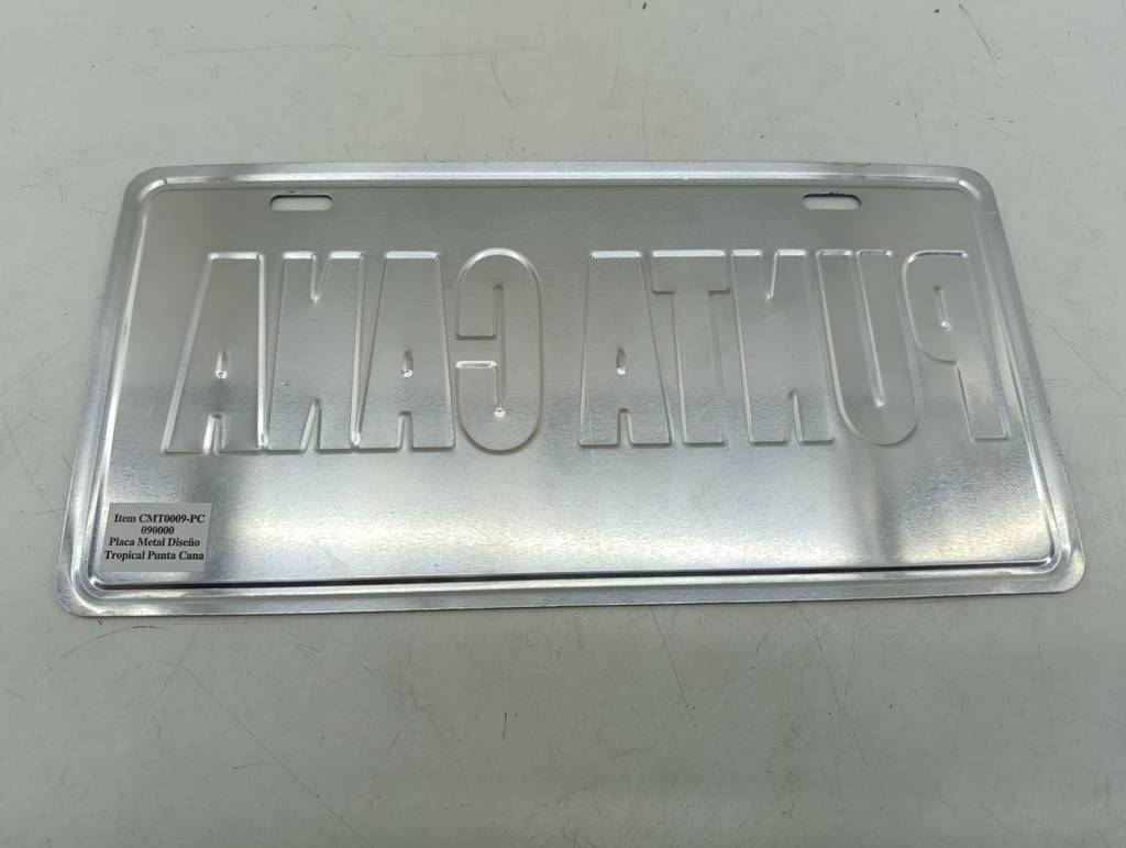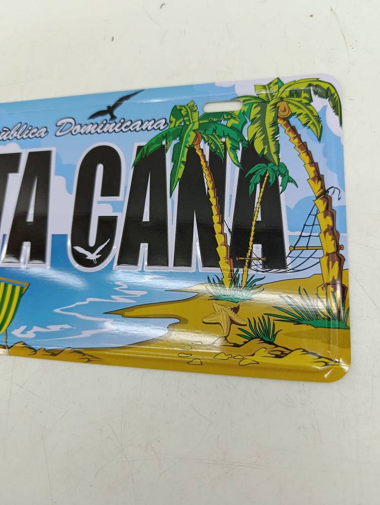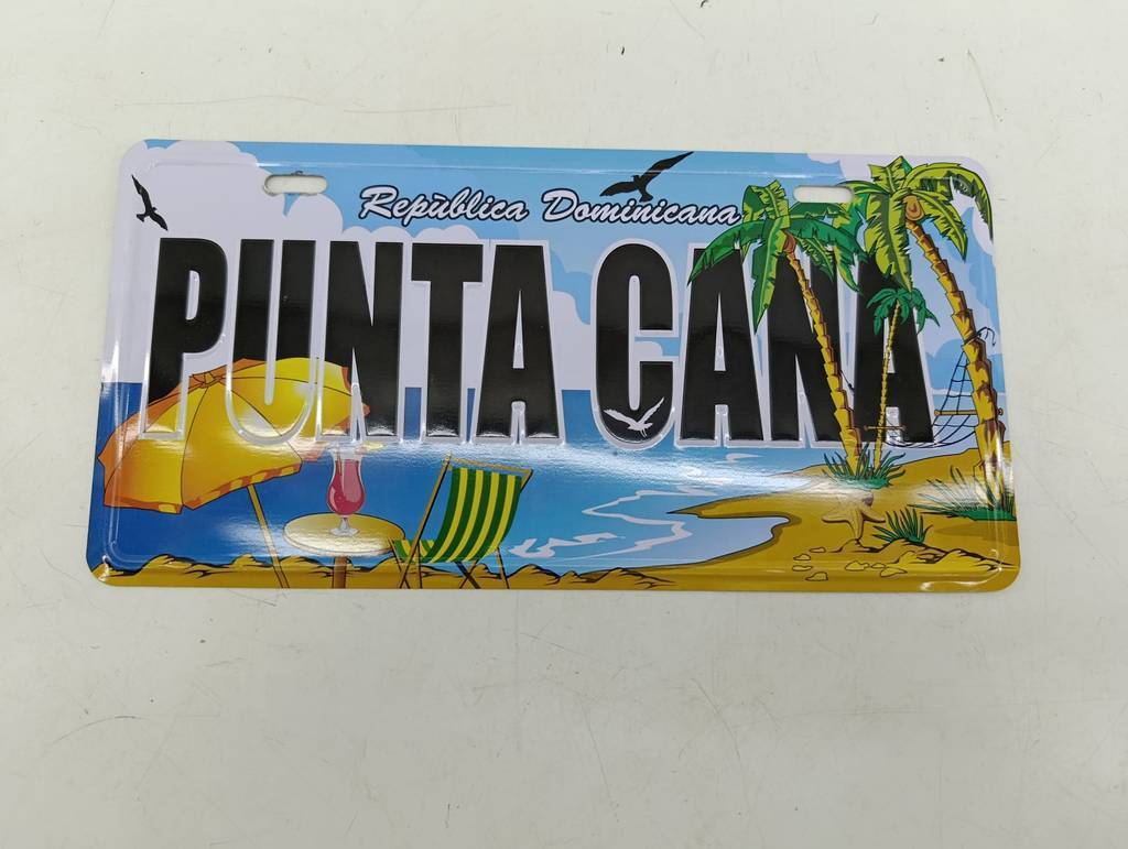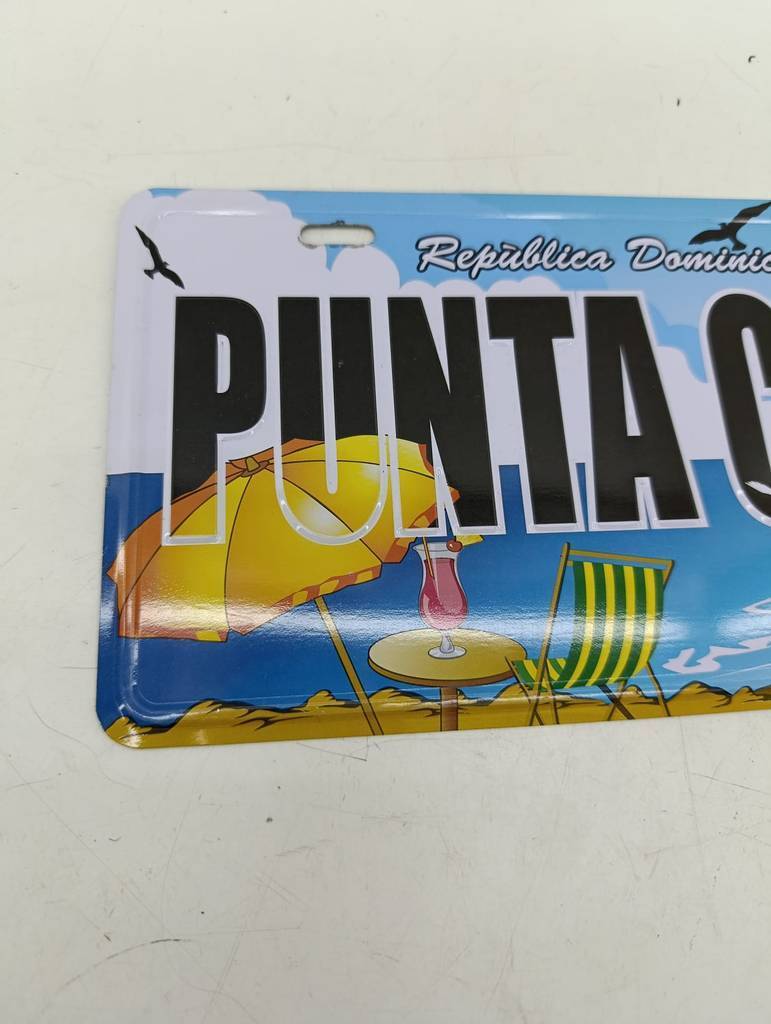 Placa metálica decorativa en la que se puede leer el mensaje República Dominicana Punta Cana. Se trata de una original placa decorativa que tiene una forma rectangular y cuenta con un bonito dibujo de una playa con palmeras, una mesa con una silla y una sombrilla. Es una placa muy bonita para utilizar como elemento decorativo. Como se puede observar en las fotografías se encuentra en buenas condiciones.