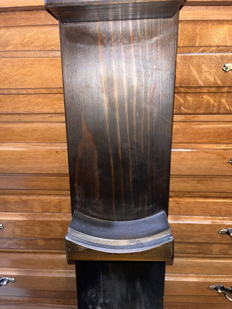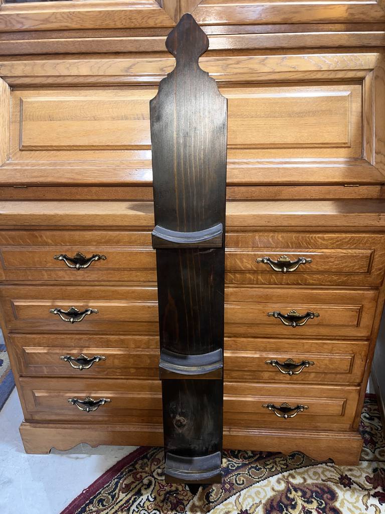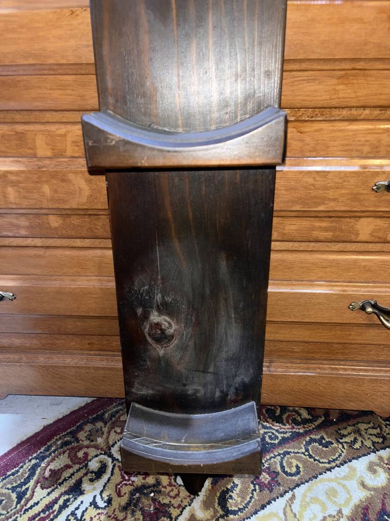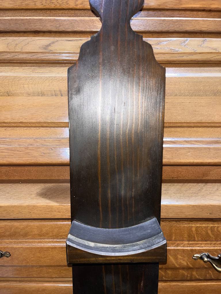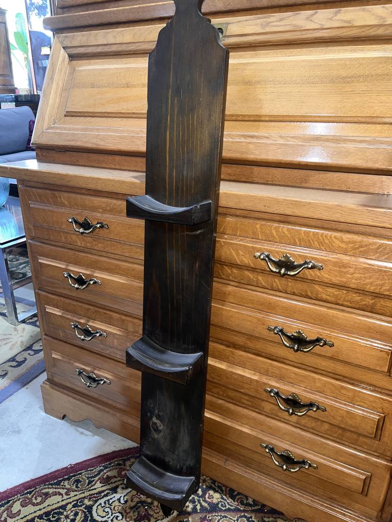 Platera fabricada en madera de buena calidad de color marrón oscuro. Se trata de una platera que tiene una forma alargada y cuenta con tres soportes para colocar o sujetar platos o botellas. Es una platera de estilo clásico que resulta perfecta para colocarla en una cocina o en un salón comedor de estilo vintage. Como se puede observar en las fotografías se encuentra en buenas condiciones.