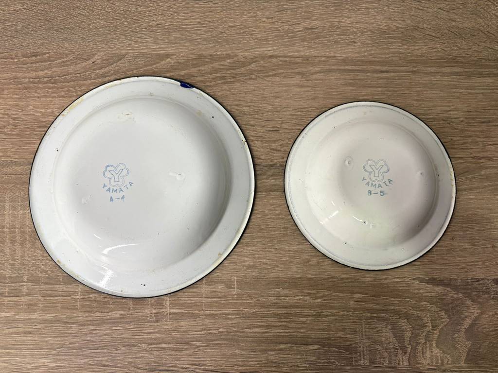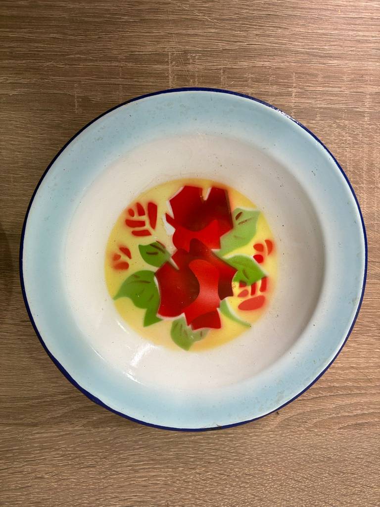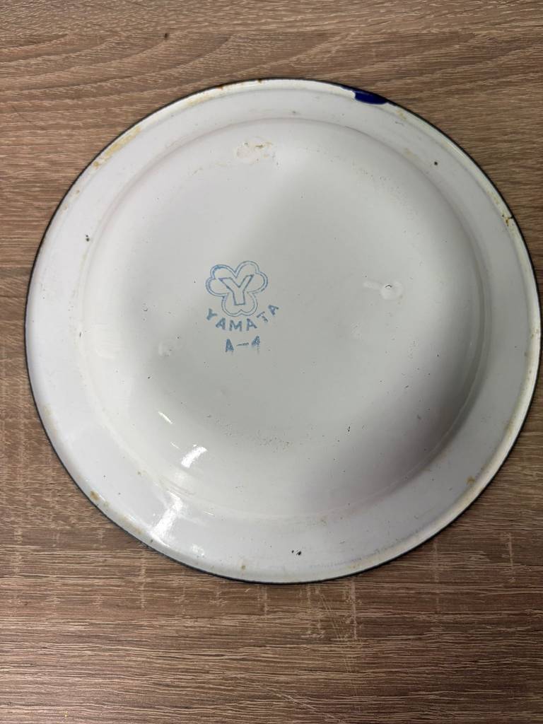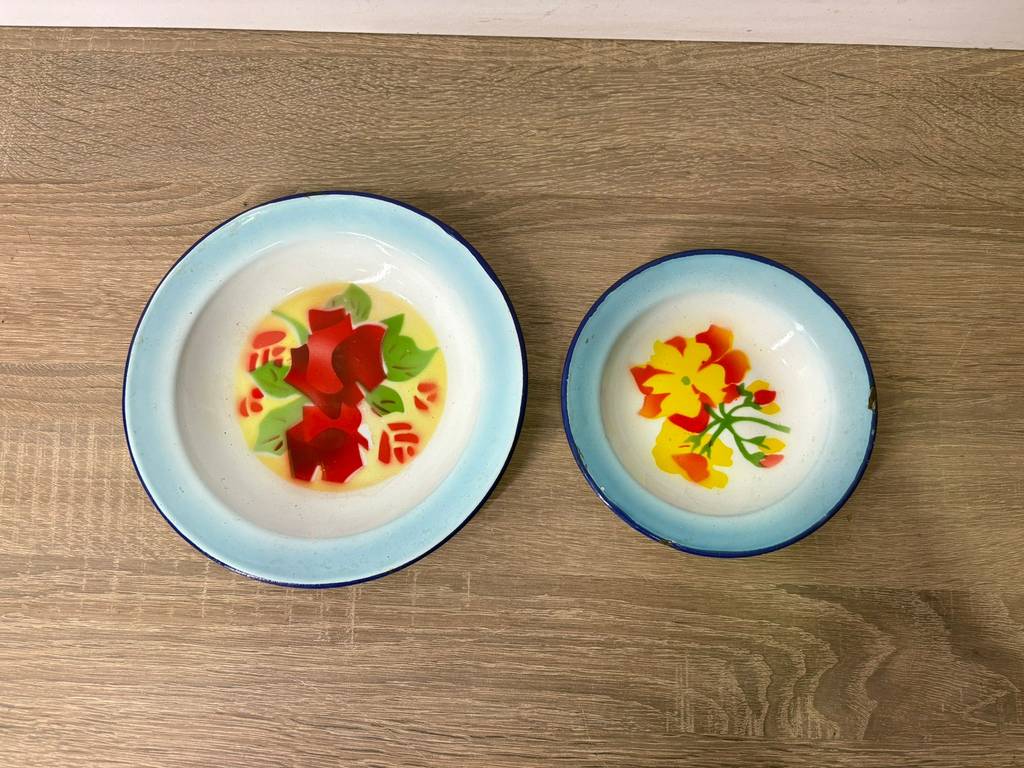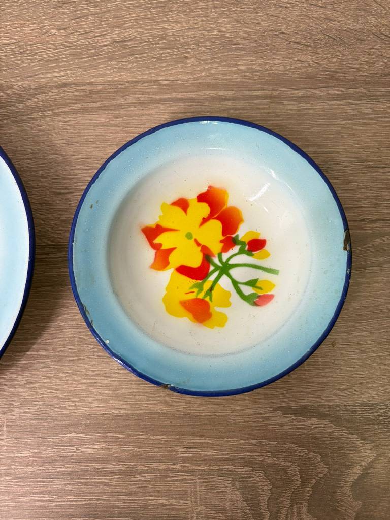 Platos de esmalte muy bonitos y originales que han sido pintados a mano con unas bonitas flores multicolor y un borde azulado. Se trata de unos platos fabricados con materiales de buena calidad que se pueden usar como elemento decorativo en un salón comedor, cocina o recibidor. Como se puede observar en las fotografías presentan un ligero desgaste.