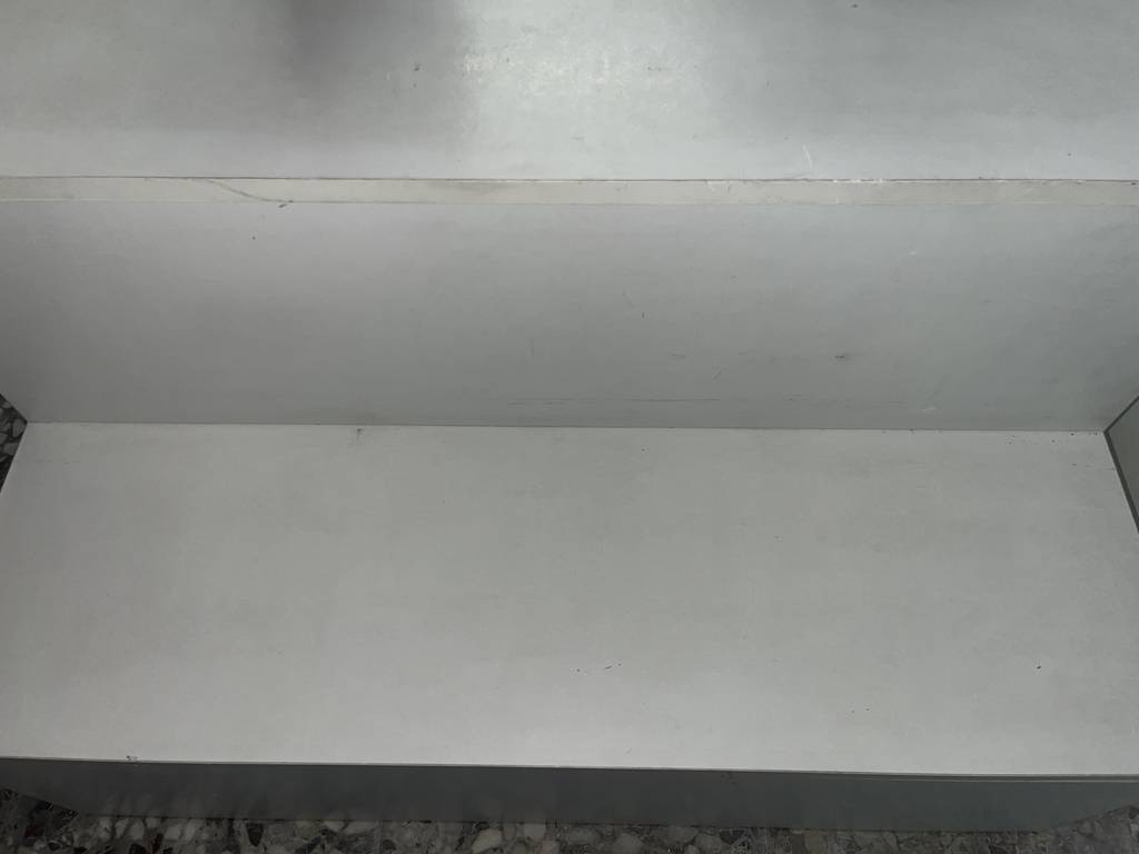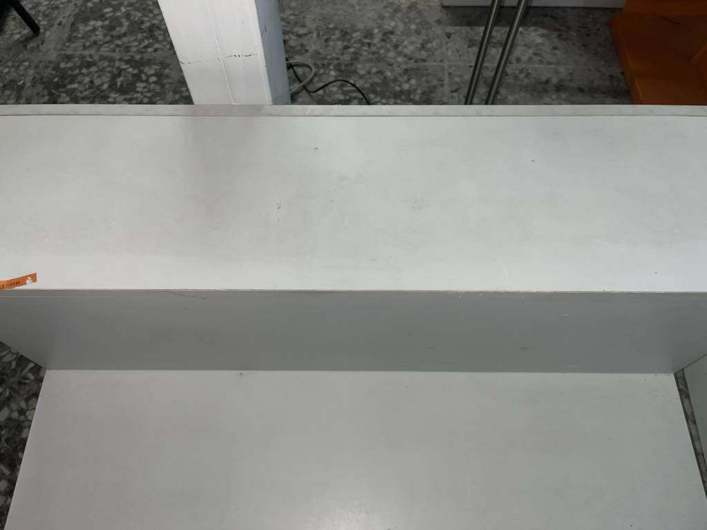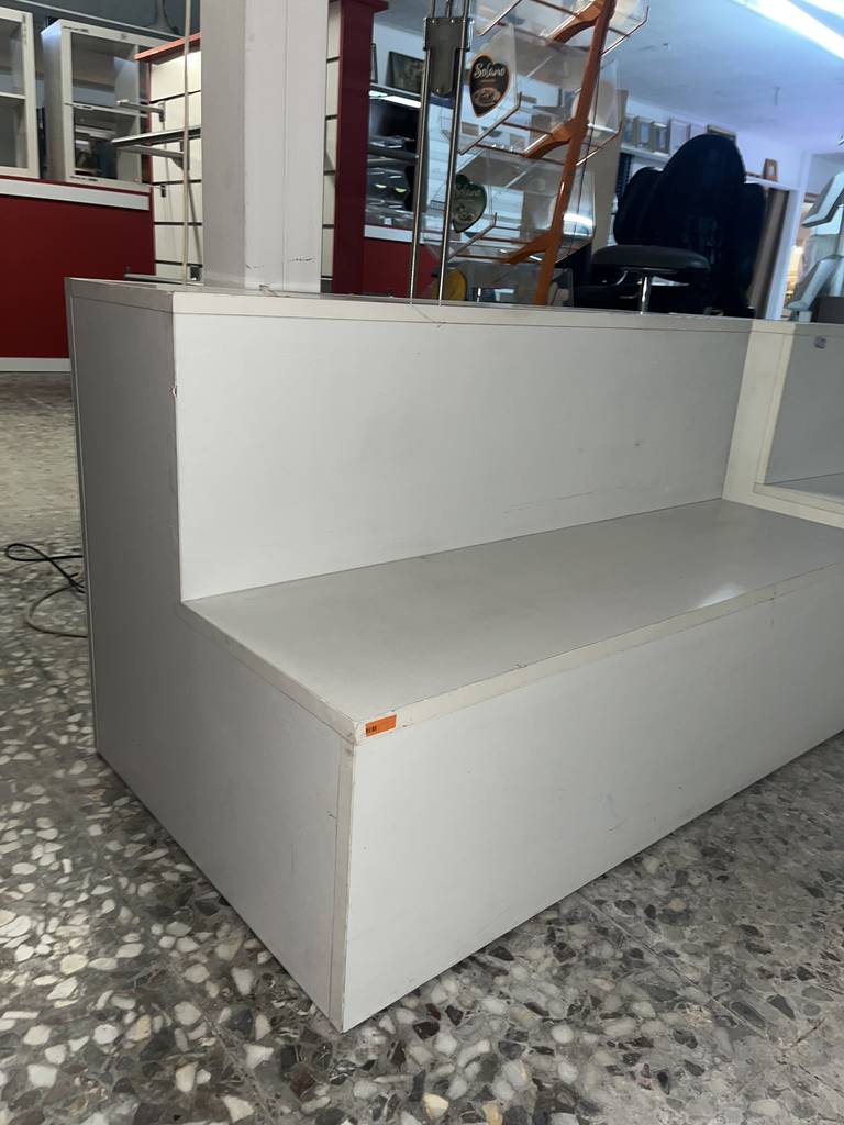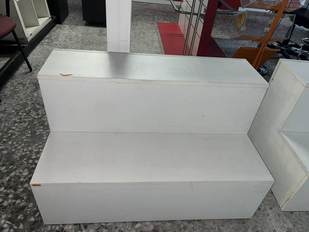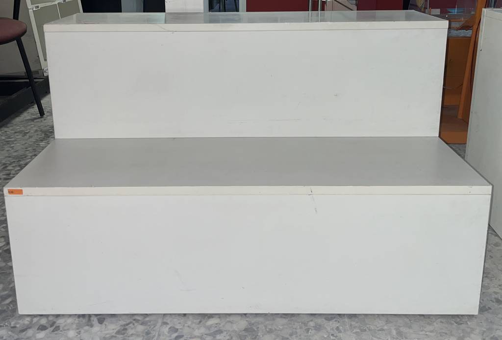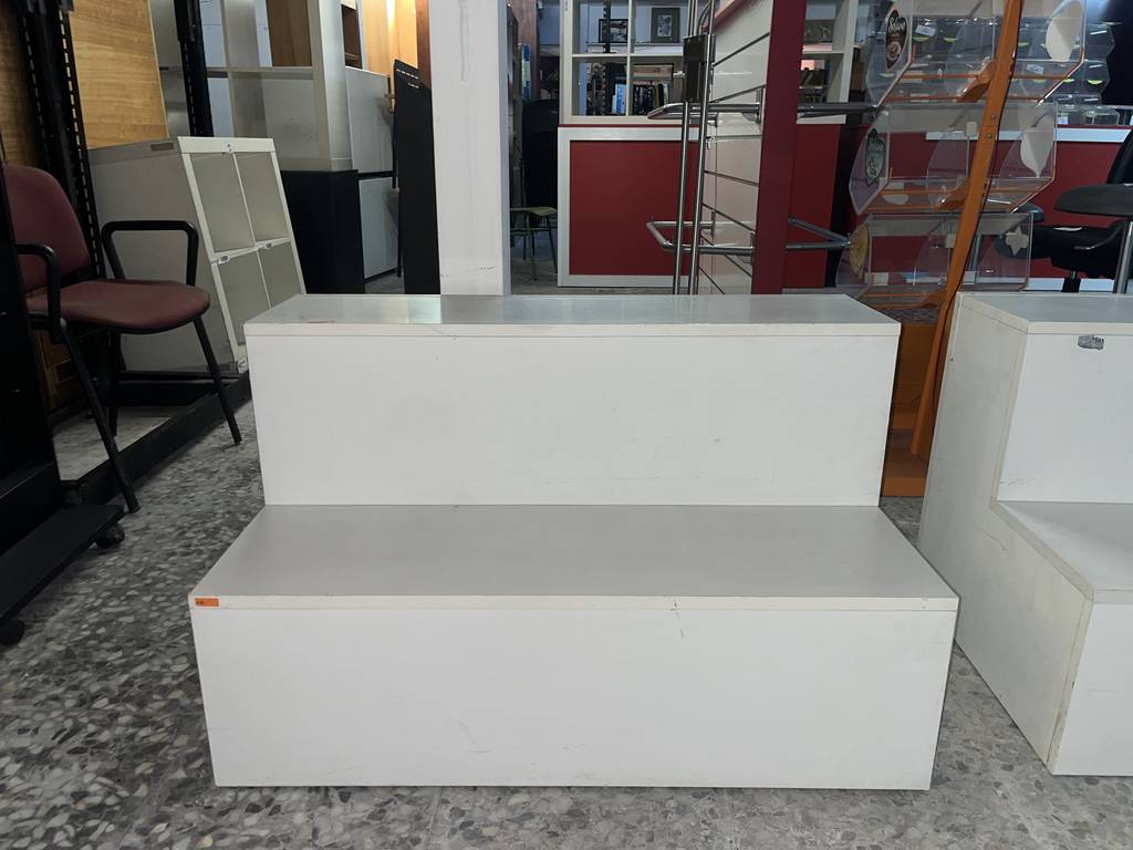 Podium de comercio en color blanco fabricado con madera de buena calidad y robusta. Se compone de dos escalones ideales para exponer productos haciéndolos resaltar de forma ordenada y atractiva para los clientes. Como podemos observar en las fotografías presenta un ligero desgaste, aunque cumple su función correctamente y está listo para ser colocado.
