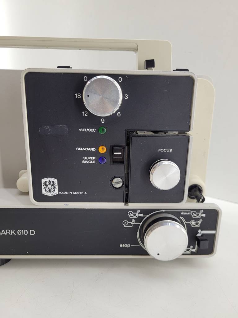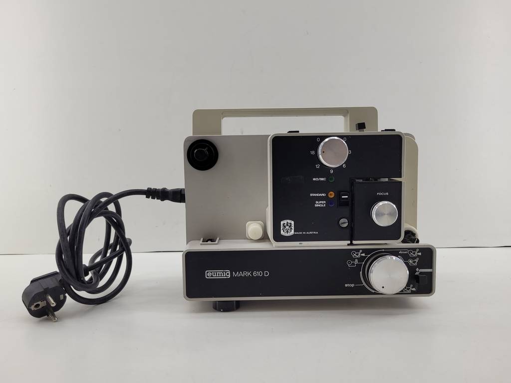 Proyector de la reconocida marca Eumig Mark de tamaño mediano. Se trata de un proyector que tiene una buena resolución y sirve para poder proyectar tanto películas como series en una pared de grandes dimensiones del hogar. Es un proyector ideal para tenerlo en el hogar si te gusta ver las cosas a lo grande. Como se puede observar en las fotografías se encuentra en buenas condiciones.