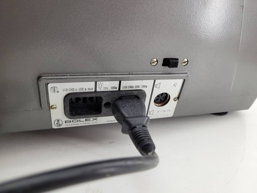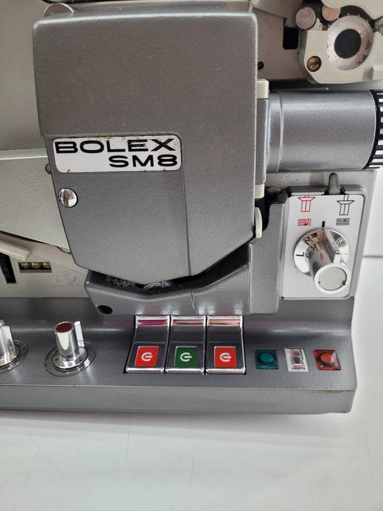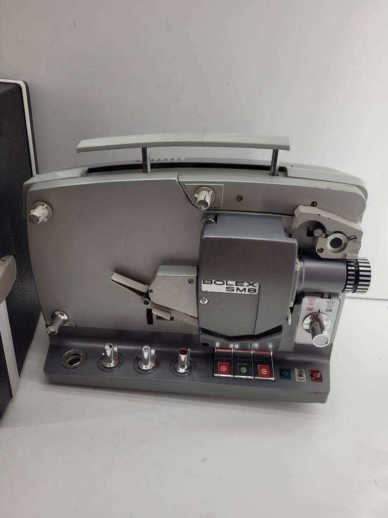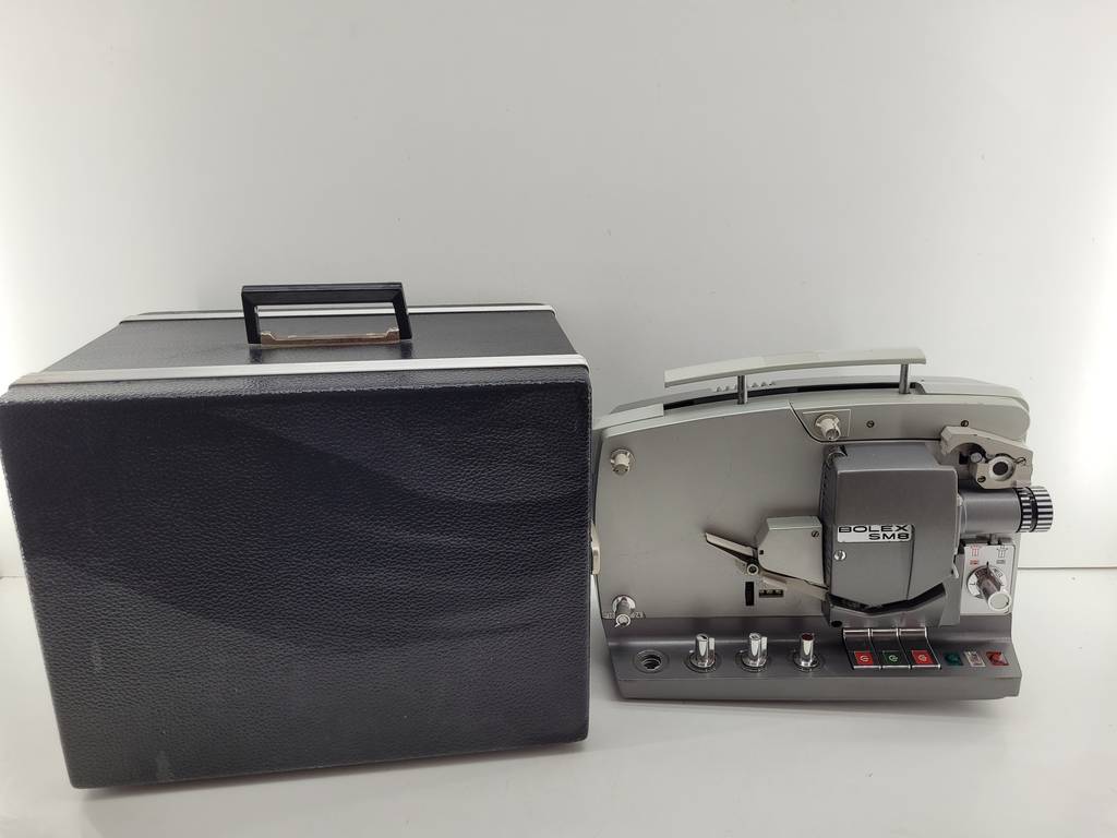 Proyector de la marca Bolex modelo sm8 súper 8 de ocho milímetros que viene en su maletín original. Se trata de un proyector Bolex de súper ocho que se utilizaba mucho en los años ochenta del pasado siglo veinte. Es un proyector al que le falta el cable que lo une al altavoz y va en su maletín original. Como se puede observar en las fotografías se encuentra en buenas condiciones.