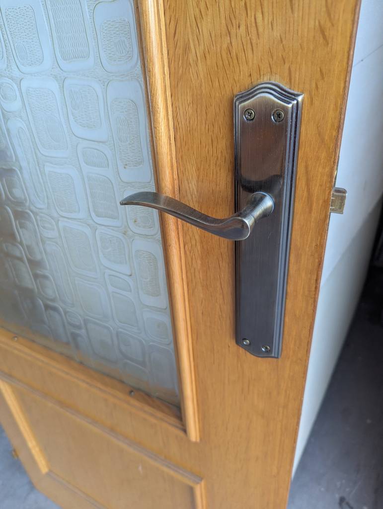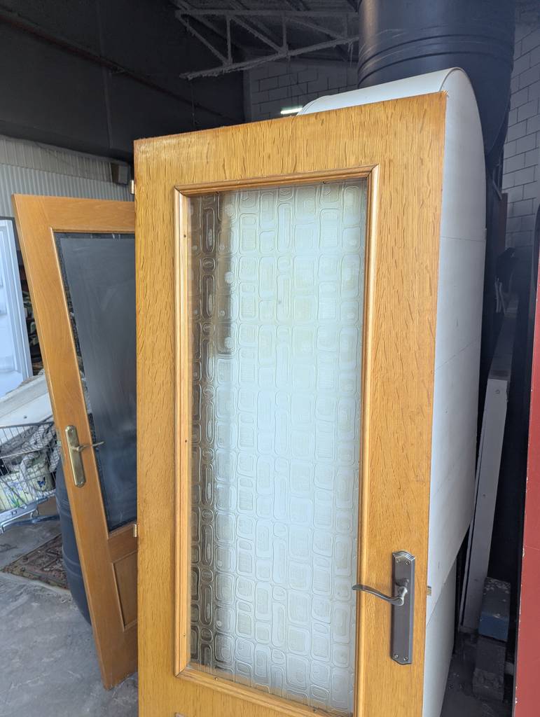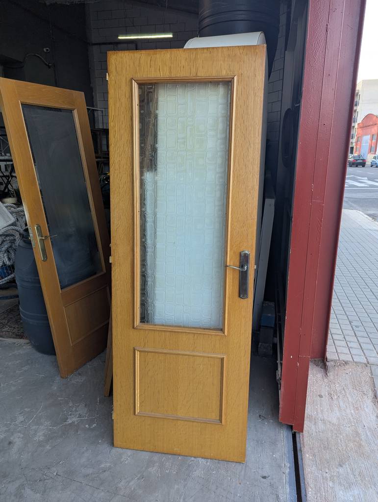 Puerta con una estructura fabricada en madera de buena calidad y robusta y con un cristal superior rectangular con formas que la hacen resaltar. También incluye un tirador metálico. Se trata de una puerta ideal para sustituir una antigua o para una obra o reforma nueva. Como podemos observar en las fotografías se encuentra en buenas condiciones.