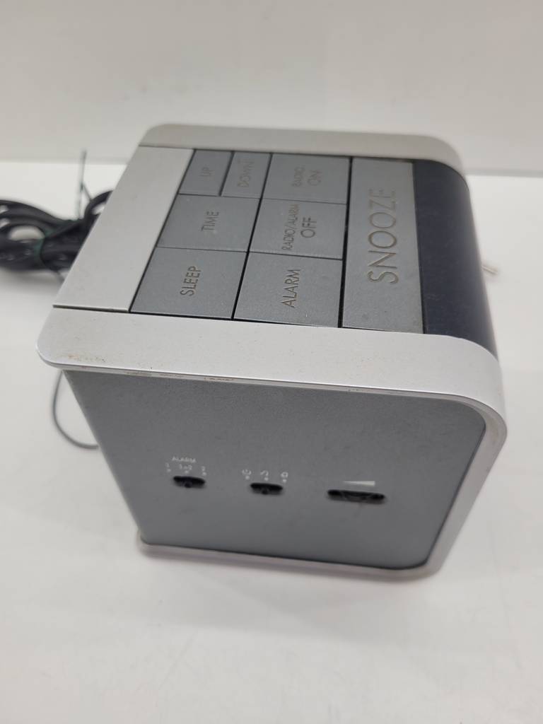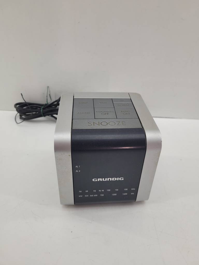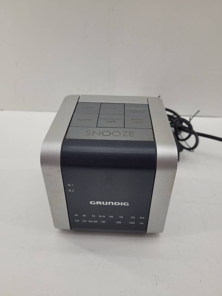 Radio despertador de la reconocida marca de electrodomésticos Grundig de color gris. Se trata de una radio despertador que cuenta con varios botones para programarla, encenderla y apagarla. Es una radio ideal para tenerla encima de una mesita en un dormitorio individual o de matrimonio. Como se puede observar en las fotografías se encuentra en buenas condiciones.