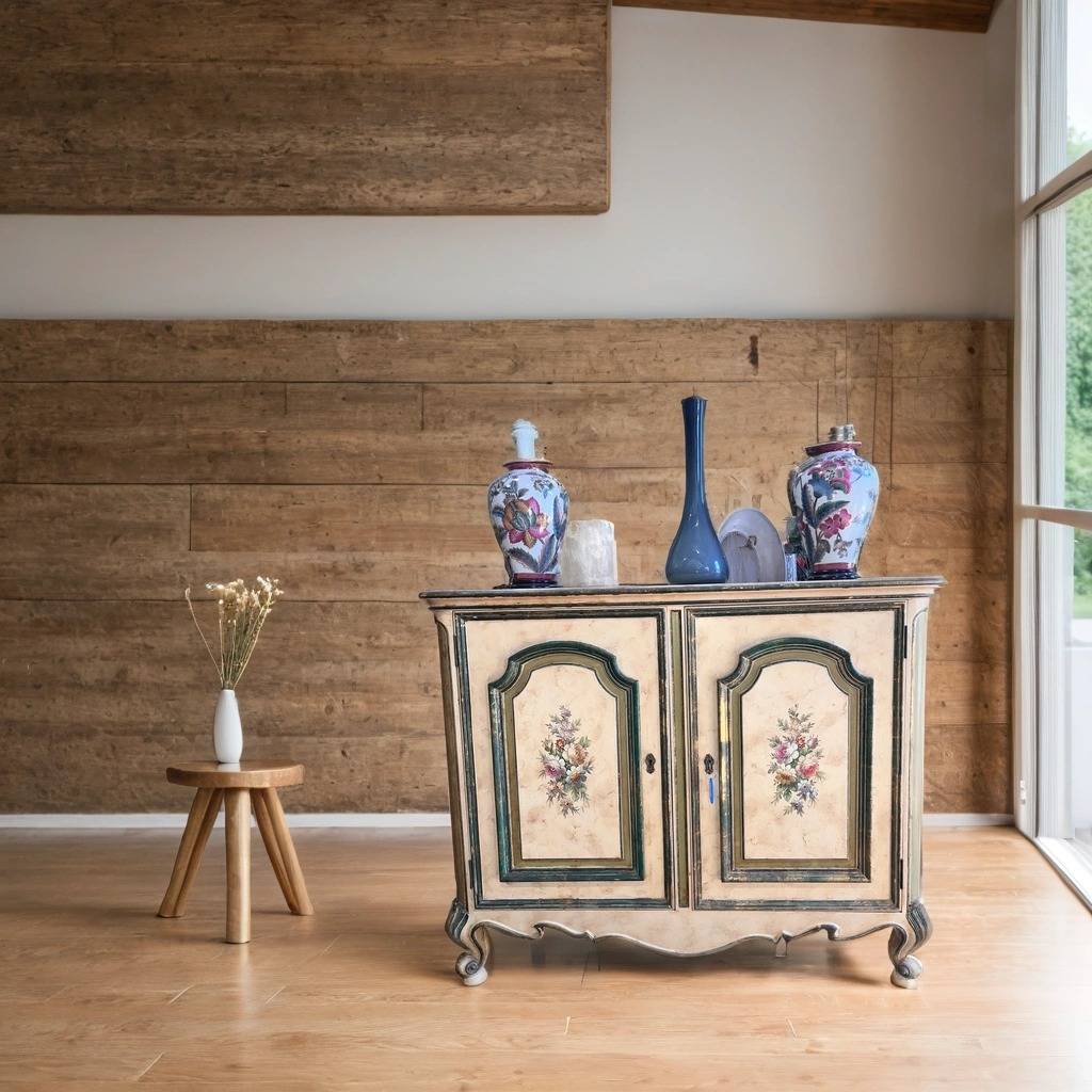 Recibidor de estilo clásico fabricado en madera de buena calidad de color crema con detalles de flores de colores. Se trata de un mueble recibidor que cuenta con dos puertas con cerraduras para poder abrirlo y cerrarlo con mayor seguridad. Es un mueble ideal para ponerlo en la entrada de un hogar. Como se puede observar en las fotografías se encuentra ligeramente deteriorado por el uso por lo que se recomienda restaurar.