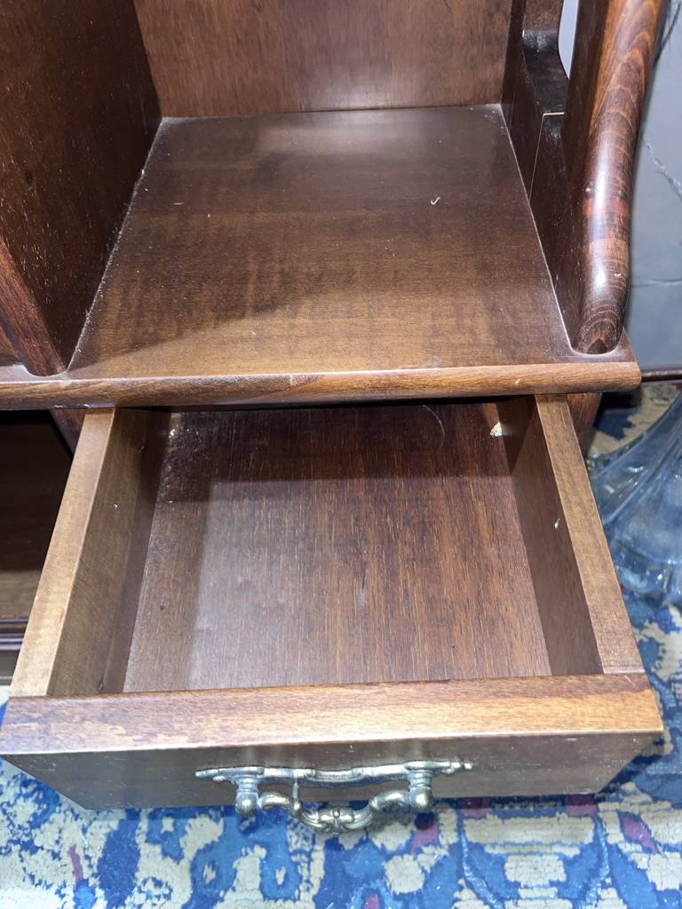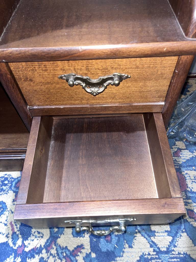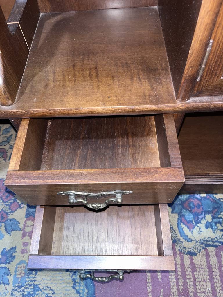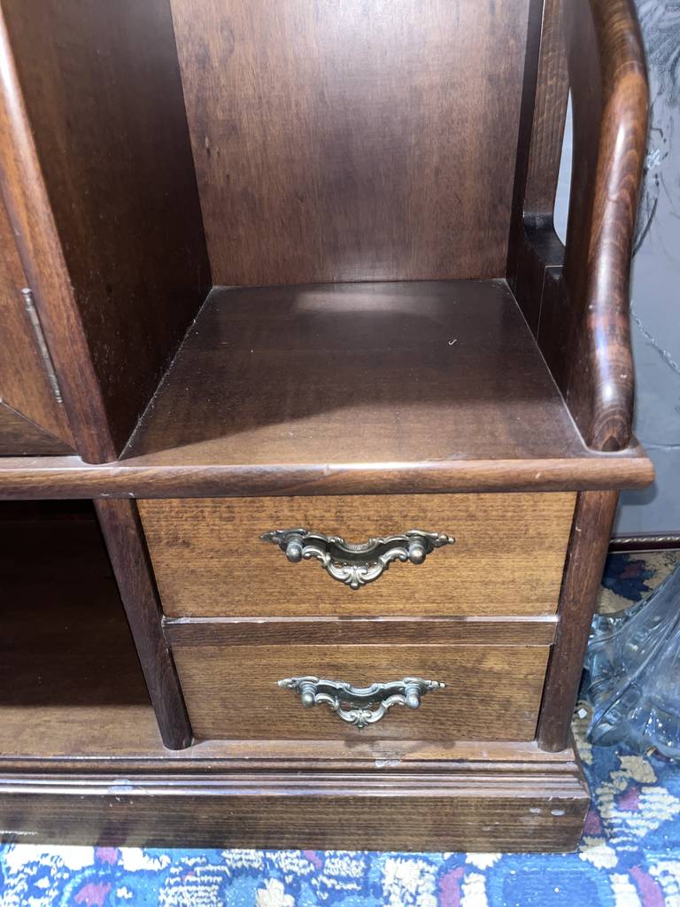 Mueble recibidor de estilo clásico fabricado en madera de buena calidad de color marrón oscuro. Se trata de un mueble recibidor que consta de cuatro pequeños cajones con tiradores metálicos, dos puertas centrales y dos habitáculos para colocar figuras. Es un recibidor perfecto para la entrada de un hogar. Como se puede observar en las fotografías se encuentra en buenas condiciones.