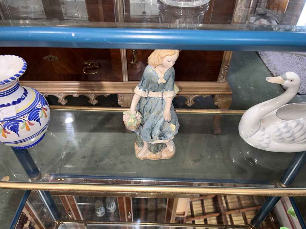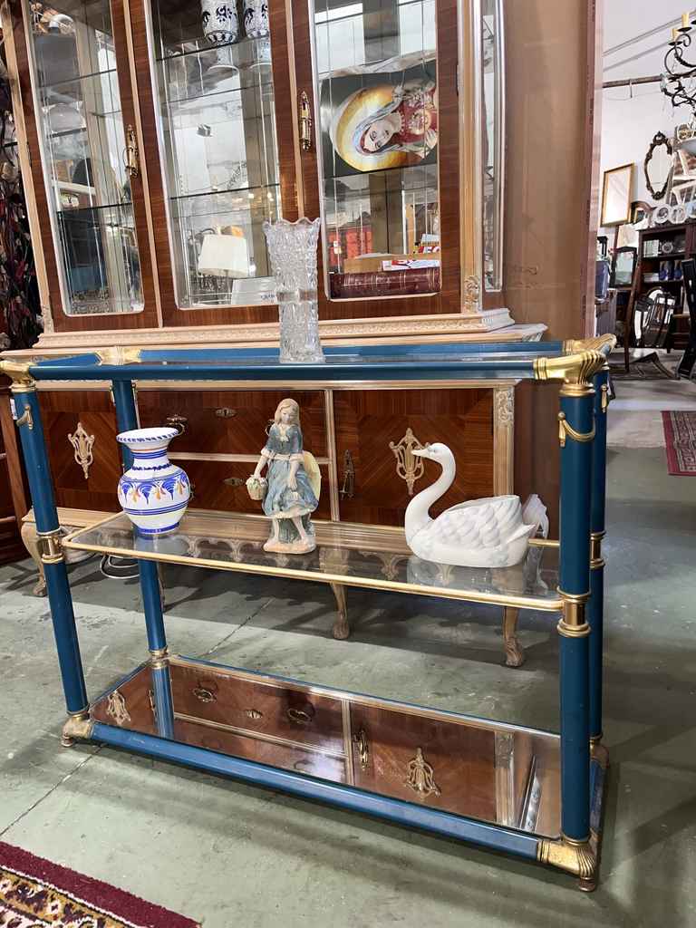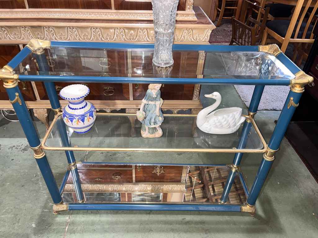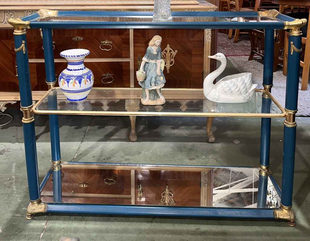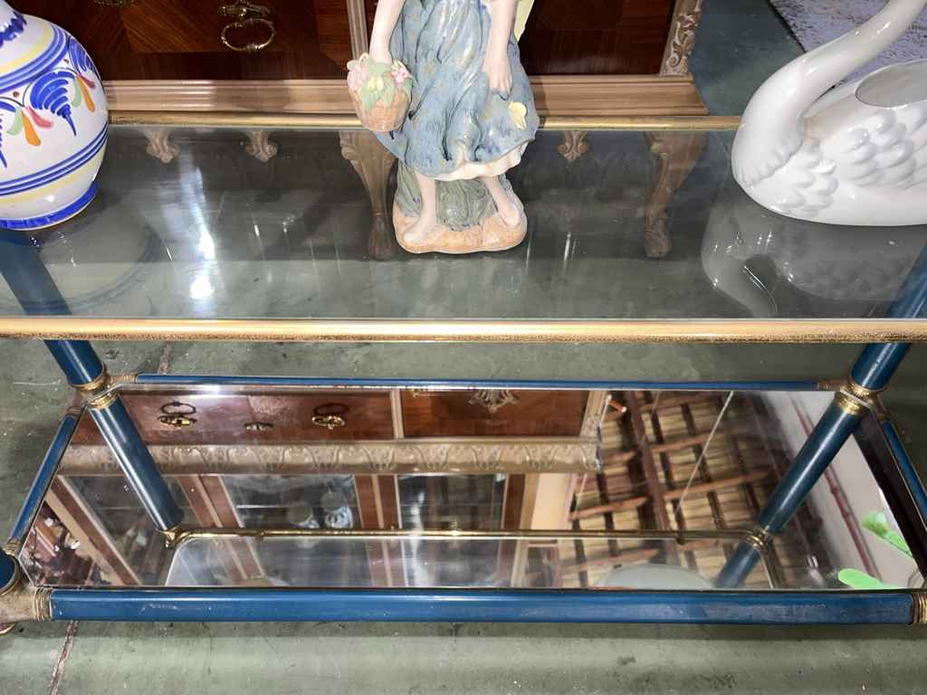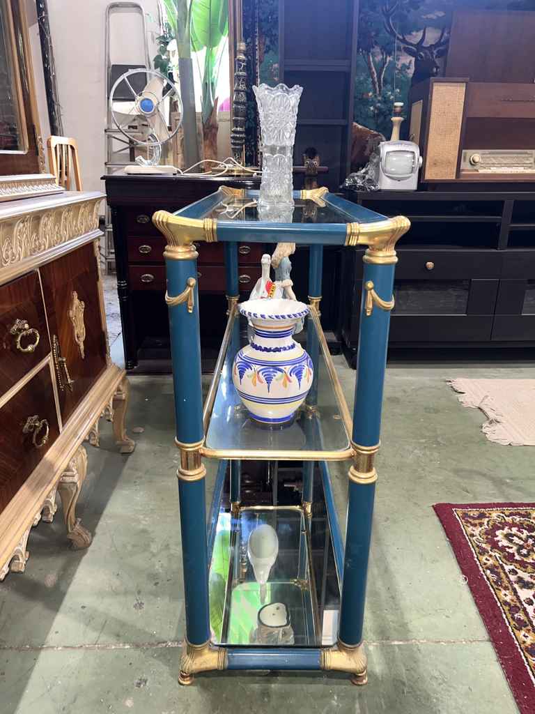 Mueble recibidor fabricado en cristal de buena calidad de color azul con toques dorados. Se trata de un mueble recibidor que cuenta con tres alturas y tiene una forma rectangular con cuatro columnas que lo sujetan. Es un mueble ideal para colocarlo tanto a la entrada de un hogar como en un salón comedor. Como se puede observar en las fotografías se encuentra en buenas condiciones.