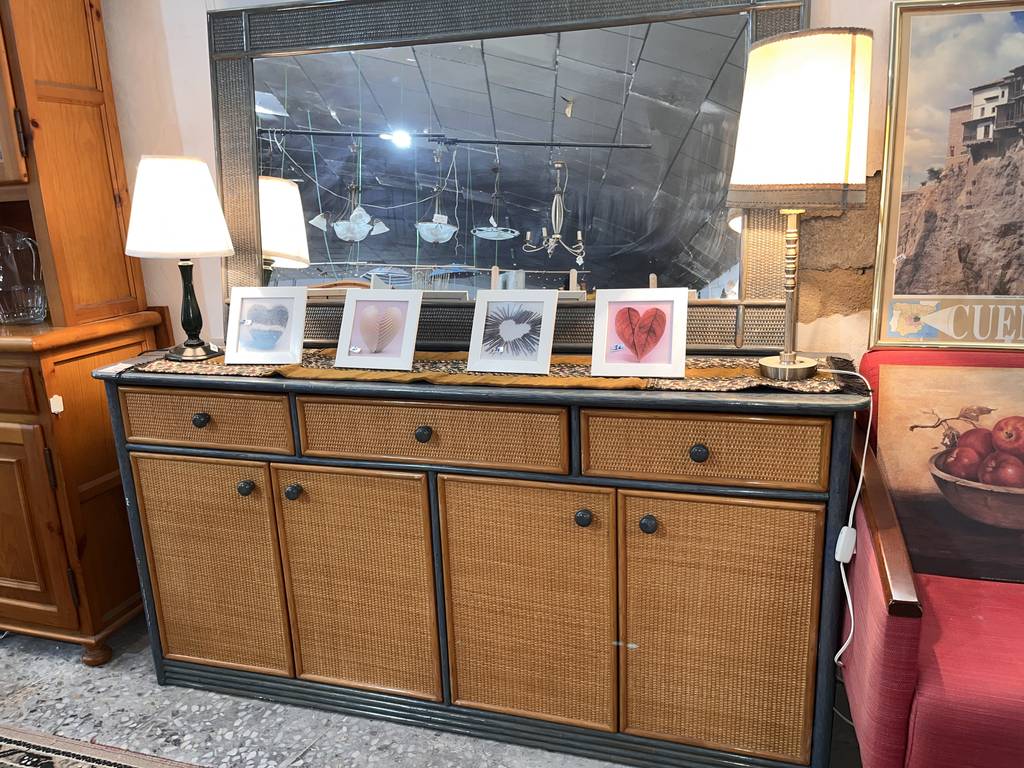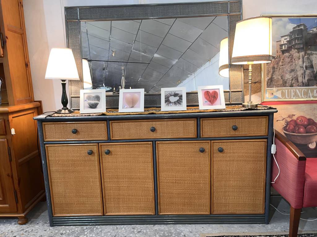 Conjunto formado por un mueble recibidor amplio que va acompañado de un espejo. Se trata de un recibidor de color marrón claro y gris que tiene cuatro puertas y tres cajones con tiradores redondos para facilitar su apertura. El recibidor va a conjunto de un espejo de grandes dimensiones con una forma rectangular y un marco grueso. Es un conjunto perfecto para ponerlo en la entrada de un hogar. Como se ve en las imágenes está en buen estado.