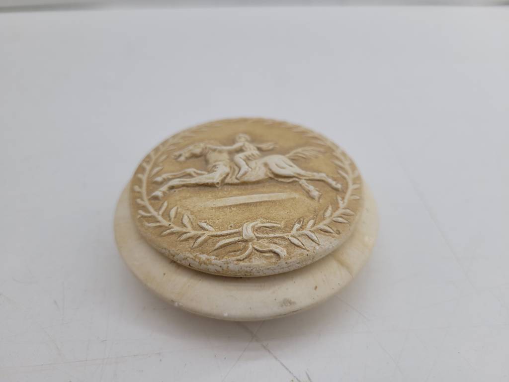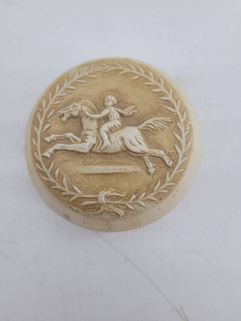 Recipiente de hueso con una tapa con motivos de Grecia muy bonita y original en la que podemos observar una persona montada a caballo y está rodeada por dos ramas entrelazadas en sus puntas. Es ideal para colocar en un salón comedor o un recibidor y en su interior almacenar pequeños enseres. Como podemos observar en las fotografías presenta desperfectos.