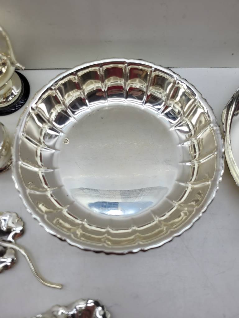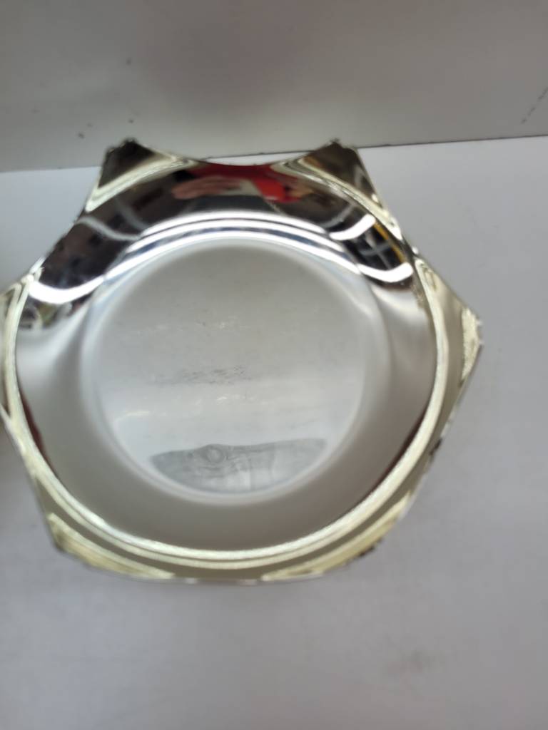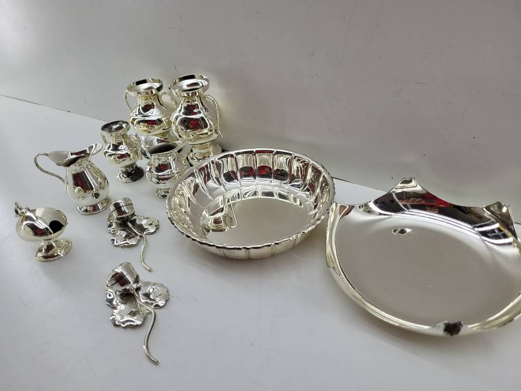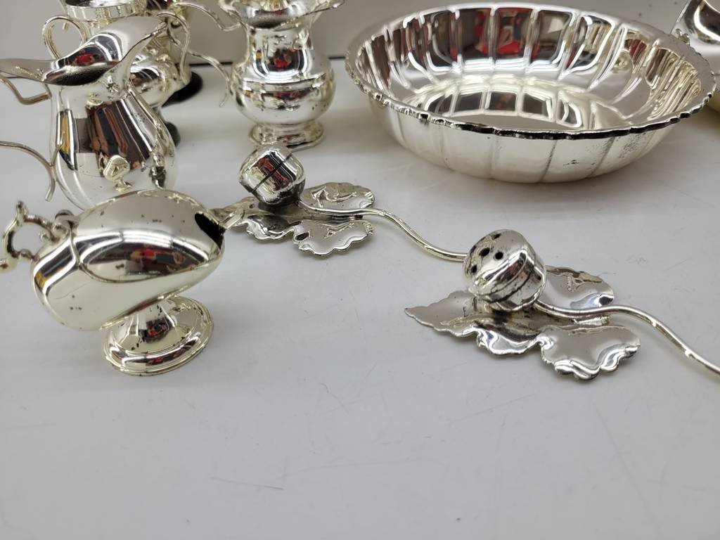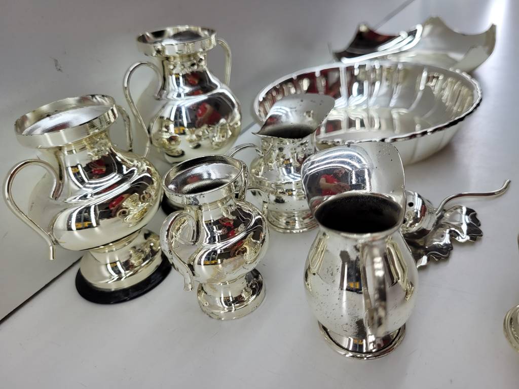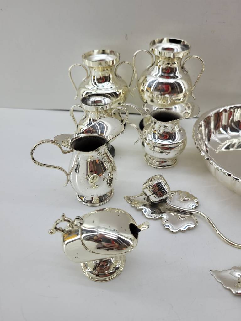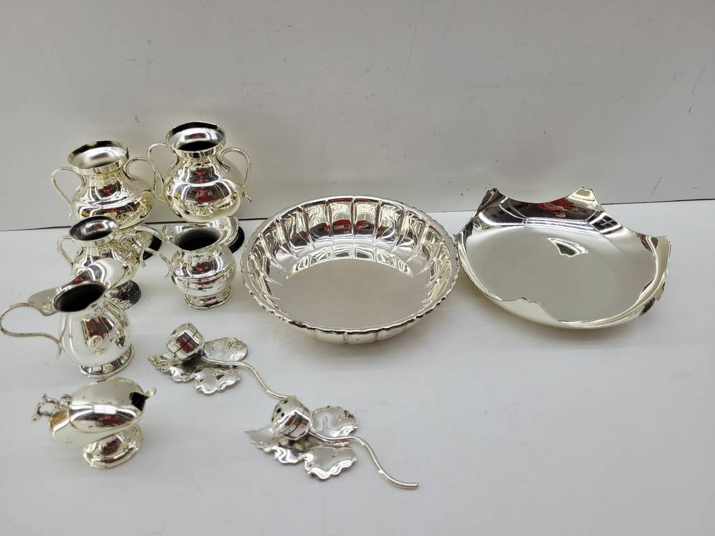 Juego de vasijas y múltiples recipientes en color plateado brillante. Los recipientes son ideales para servir salsas o bebidas, así como también un azucarero. Son unas piezas que le aportarán elegancia a nuestras celebraciones con ese plateado brillante y pulido. Como podemos observar en las fotografías algunas piezas tienen ligeros desperfectos pero en general todas las piezas se encuentran en buen estado.