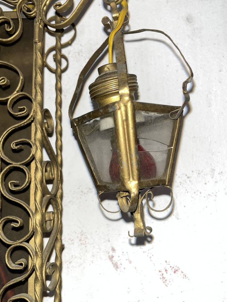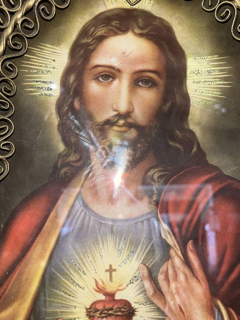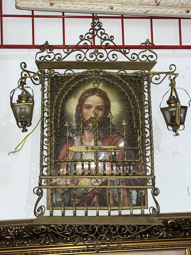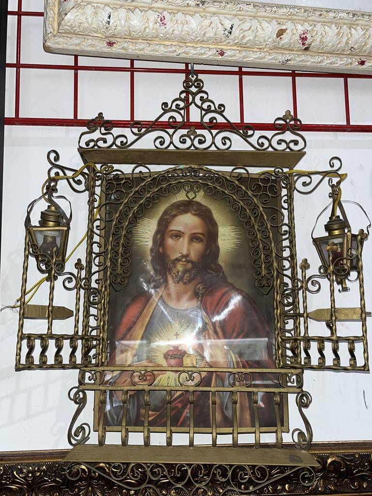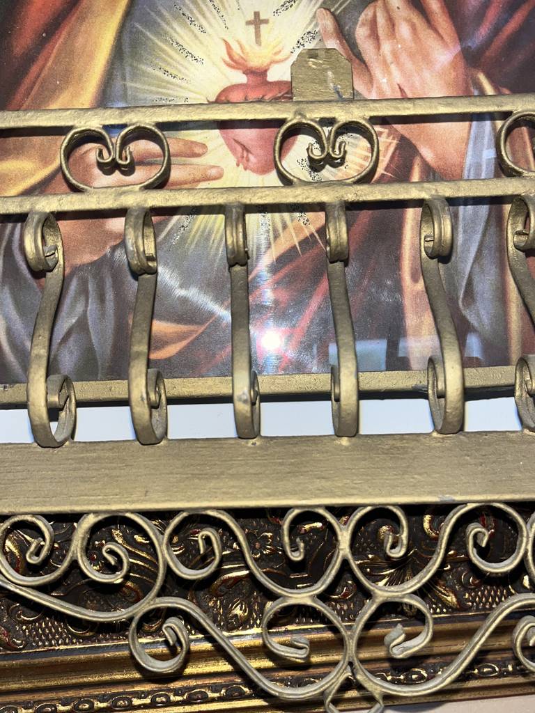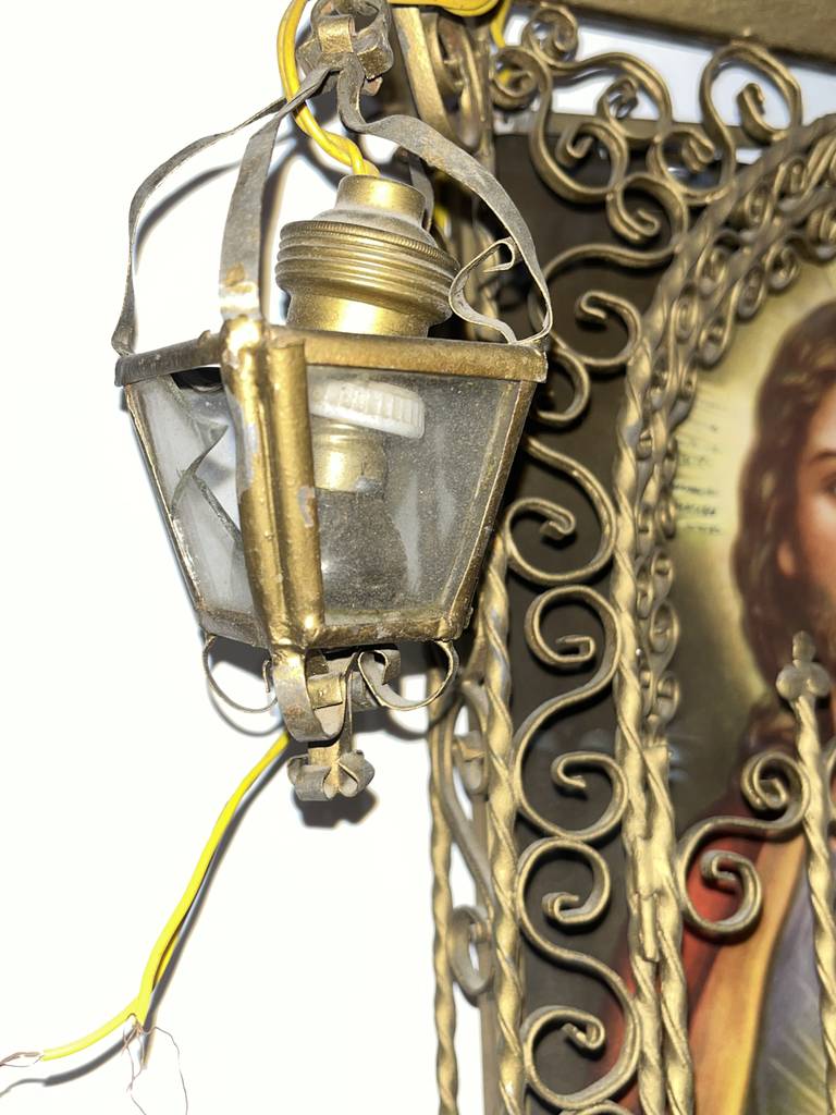 Relicario realizado en forja de buena calidad con la figura de Jesús con el Sagrado Corazón. Se trata de una excepcional pieza para amantes o coleccionistas de este tipo de productos cristianos. Es ideal para colocar en cualquier estancia de nuestra casa aportándole un toque único y especial. Como podemos observar en las fotografías presenta ligeros desperfectos.