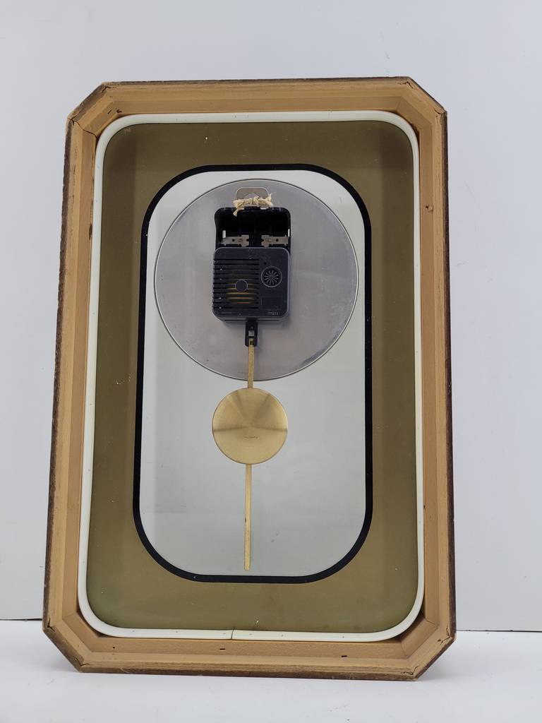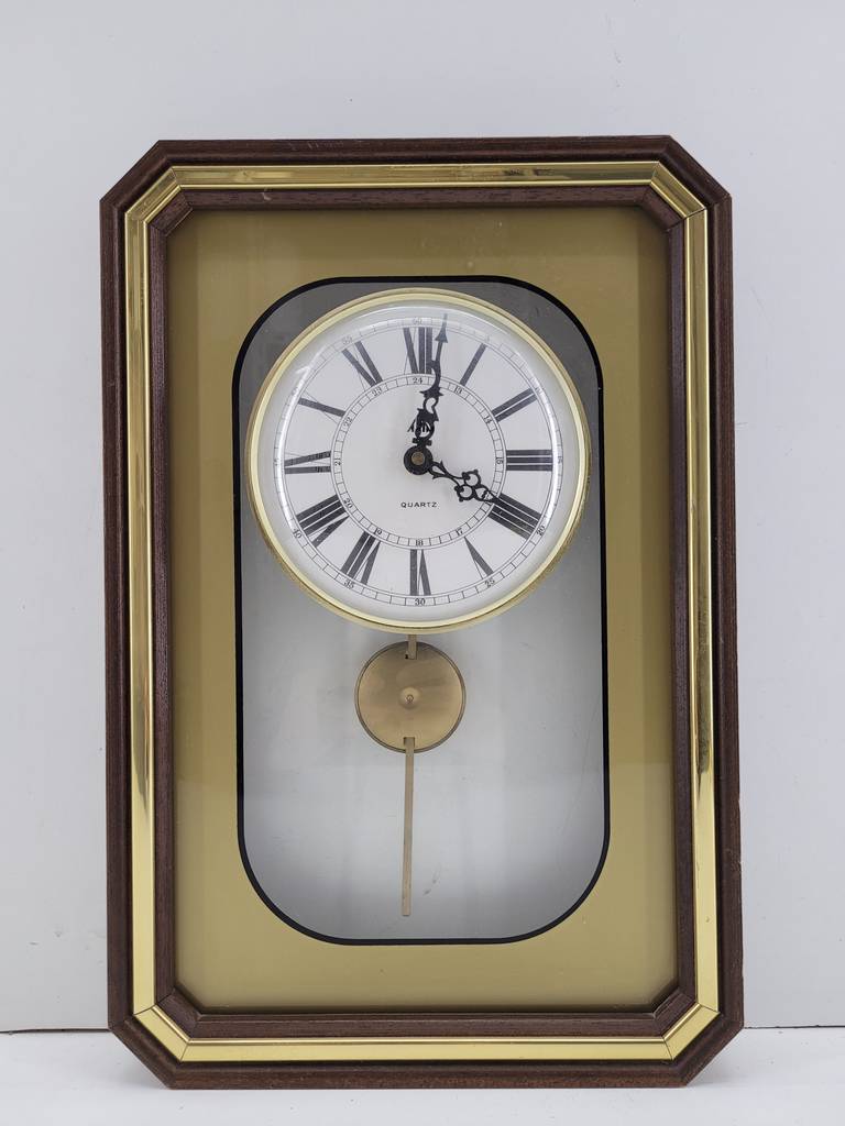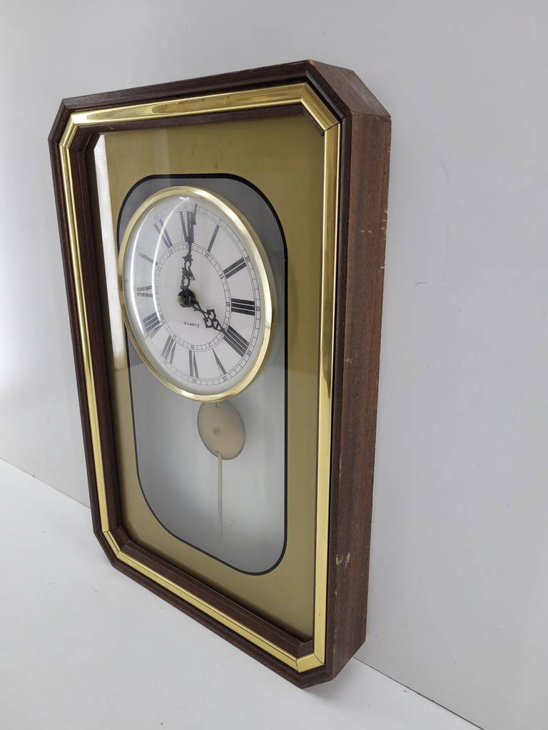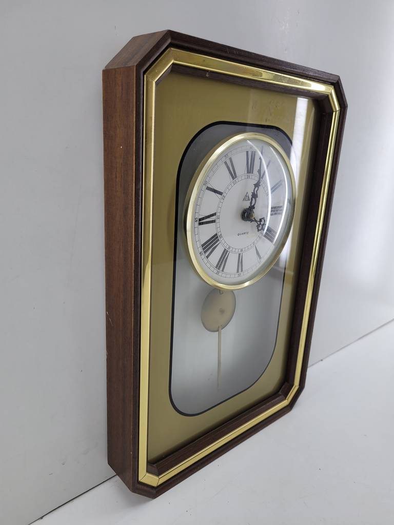Reloj de pared cuyo marco está fabricado en madera de buena calidad de color marrón oscuro y dorado. Se trata de un reloj de pared que tiene una forma rectangular y cuenta con una bonita esfera con los números en romano. Es un reloj ideal para colocarlo en la pared de un salón comedor. Como se puede observar en las fotografías se encuentra en buenas condiciones externas pero no funciona.