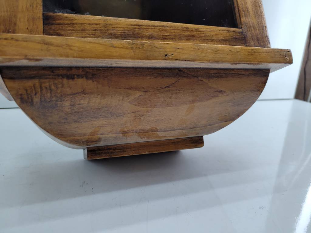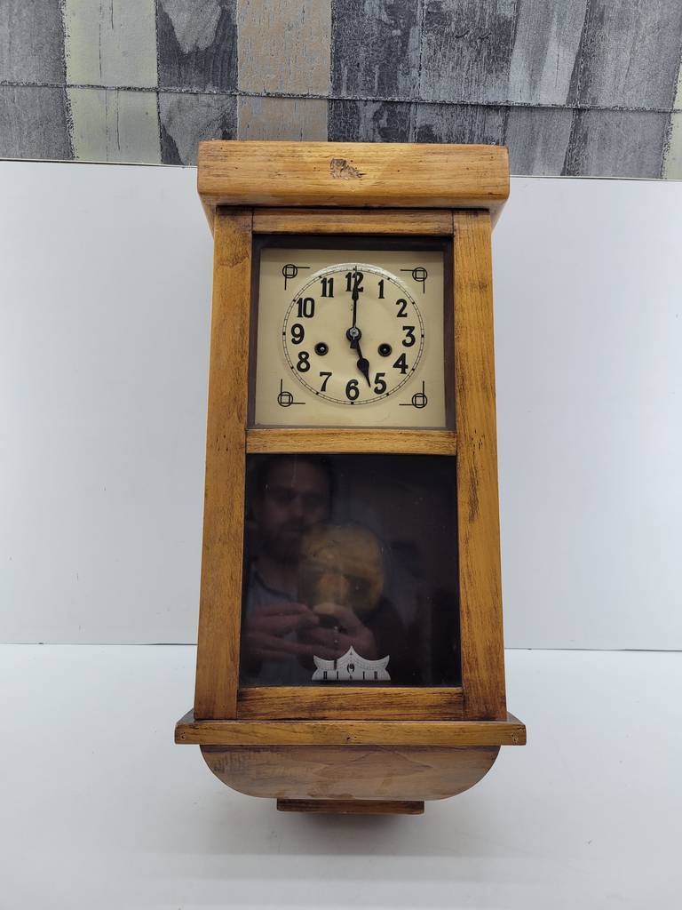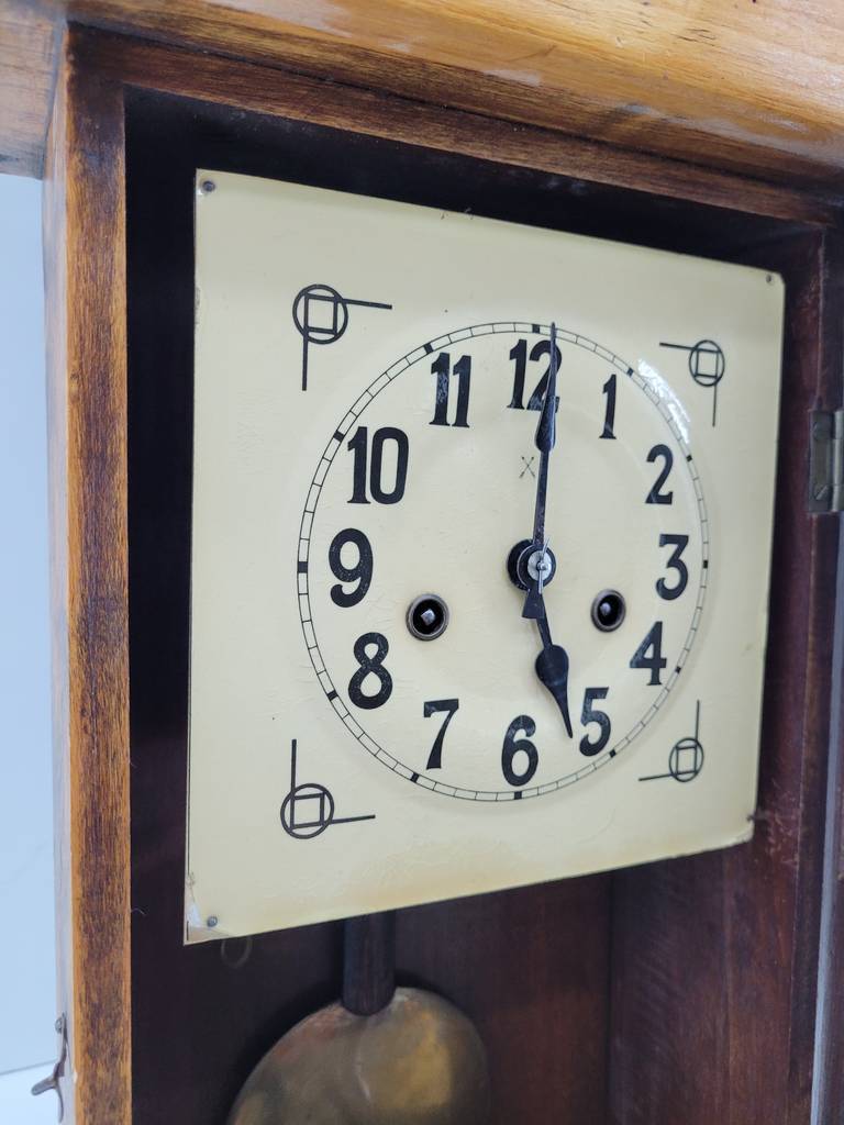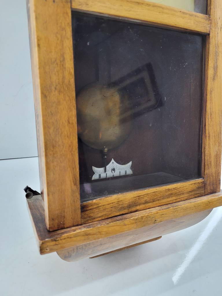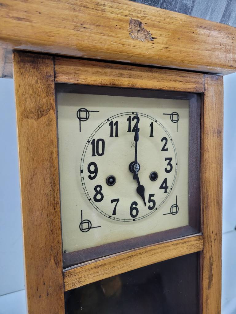 Reloj de pared de estilo rústico con una estructura fabricada con madera de buena calidad y robusta. Se compone de una esfera con las horas en la parte superior y de esta cuelga una cuerda con péndulo protegido por un cristal transparente. Es ideal para colocar en un salón comedor o cocina. Como podemos observar en las fotografías se encuentra en buenas condiciones.