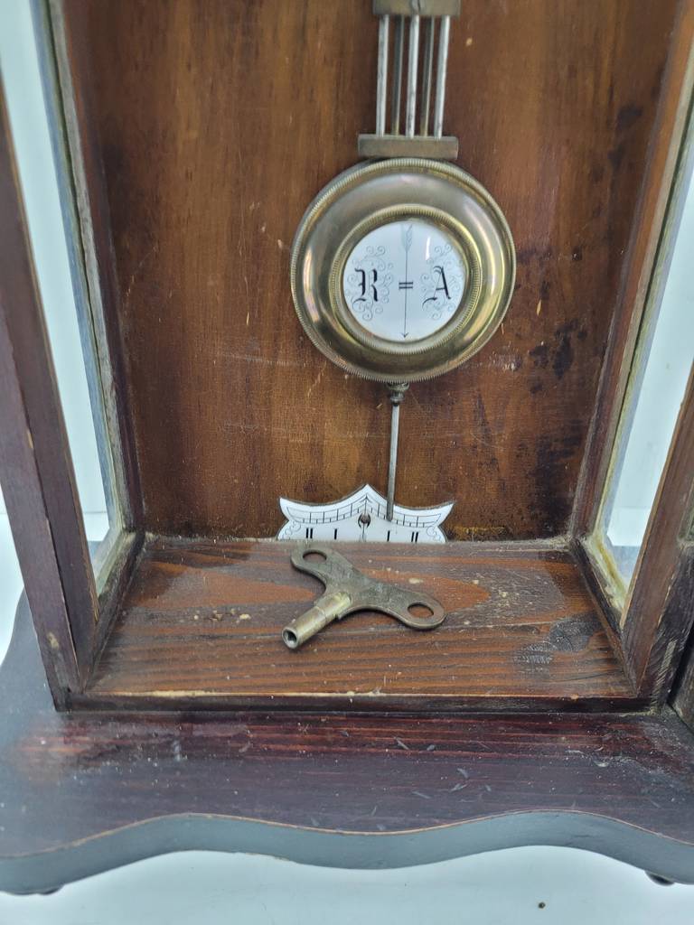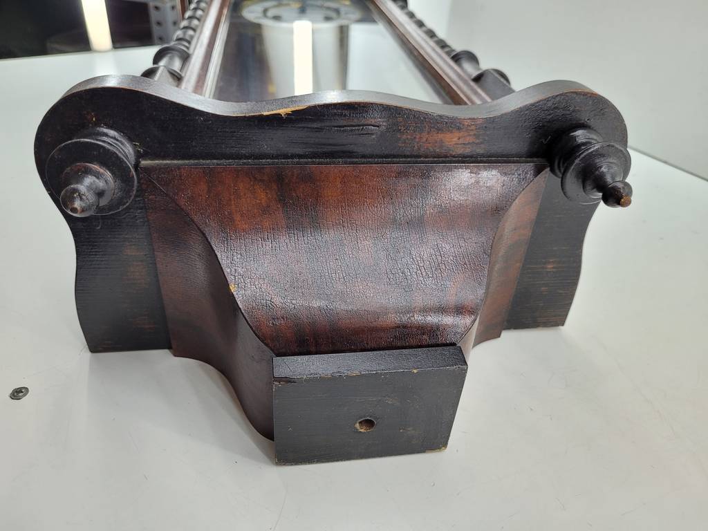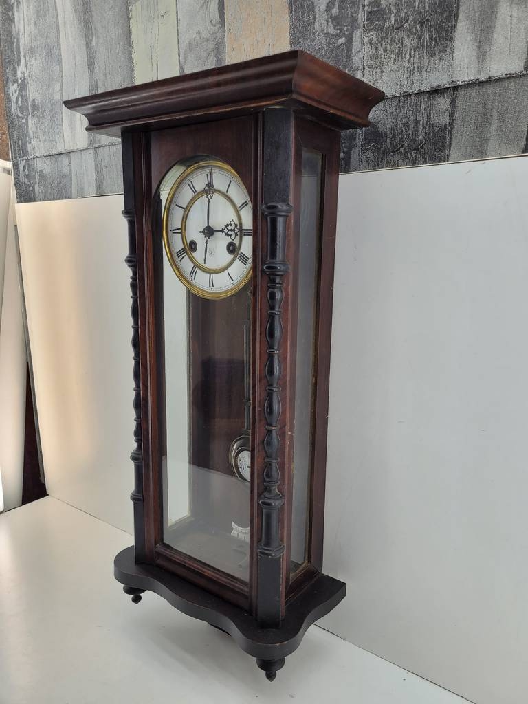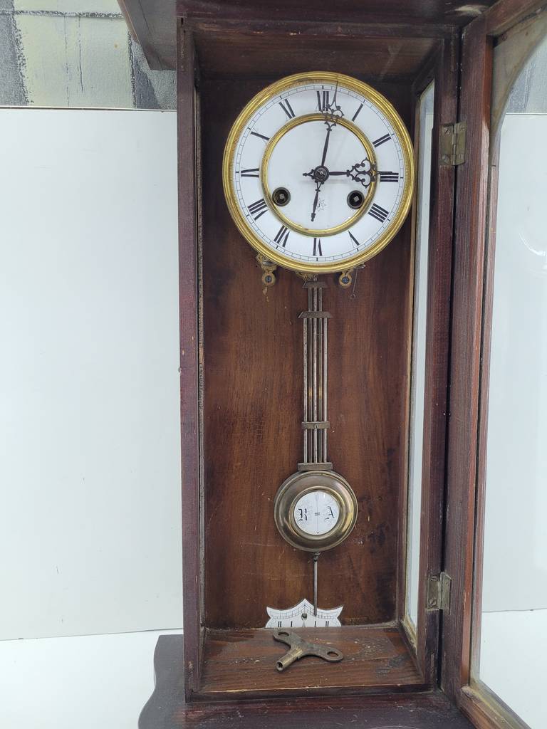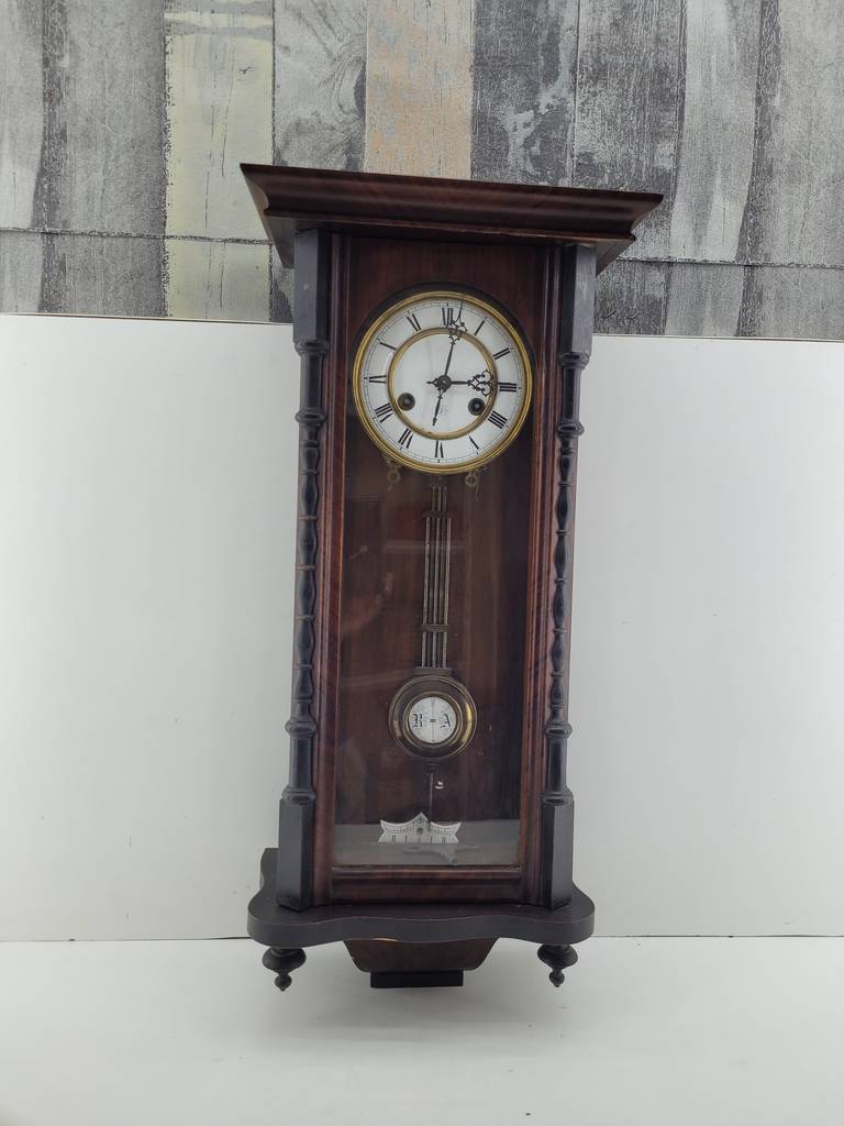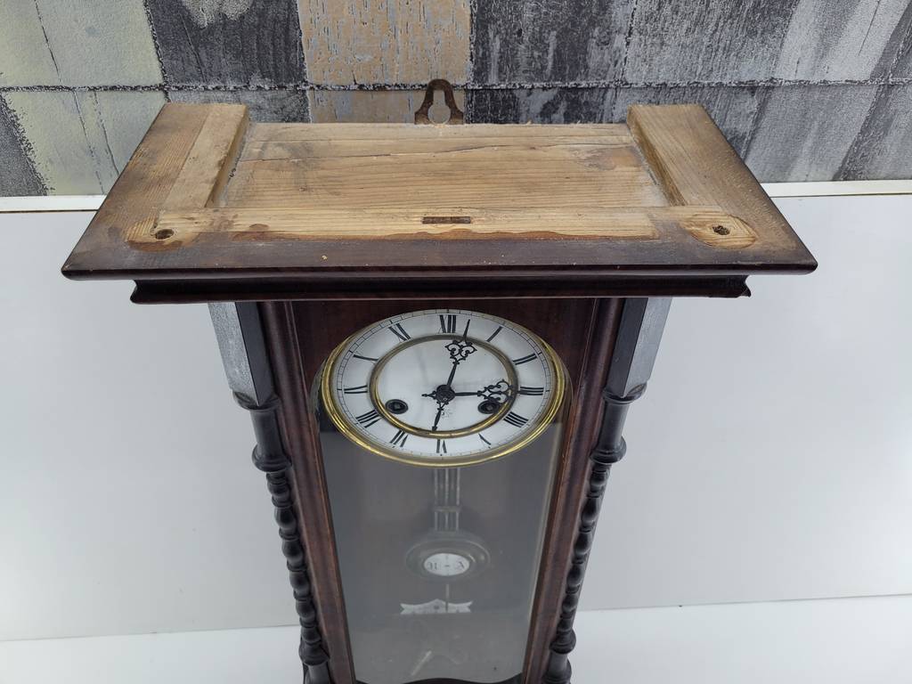 Reloj de pared antiguo fabricado en madera de buena calidad de color marrón oscuro. Se trata de un reloj de pared de estilo clásico que cuenta con una esfera de color dorado y resulta ideal para colocarlo en un salón comedor como objeto decorativo. Como se puede observar en las fotografías se encuentra en buenas condiciones externas pero no funciona.
