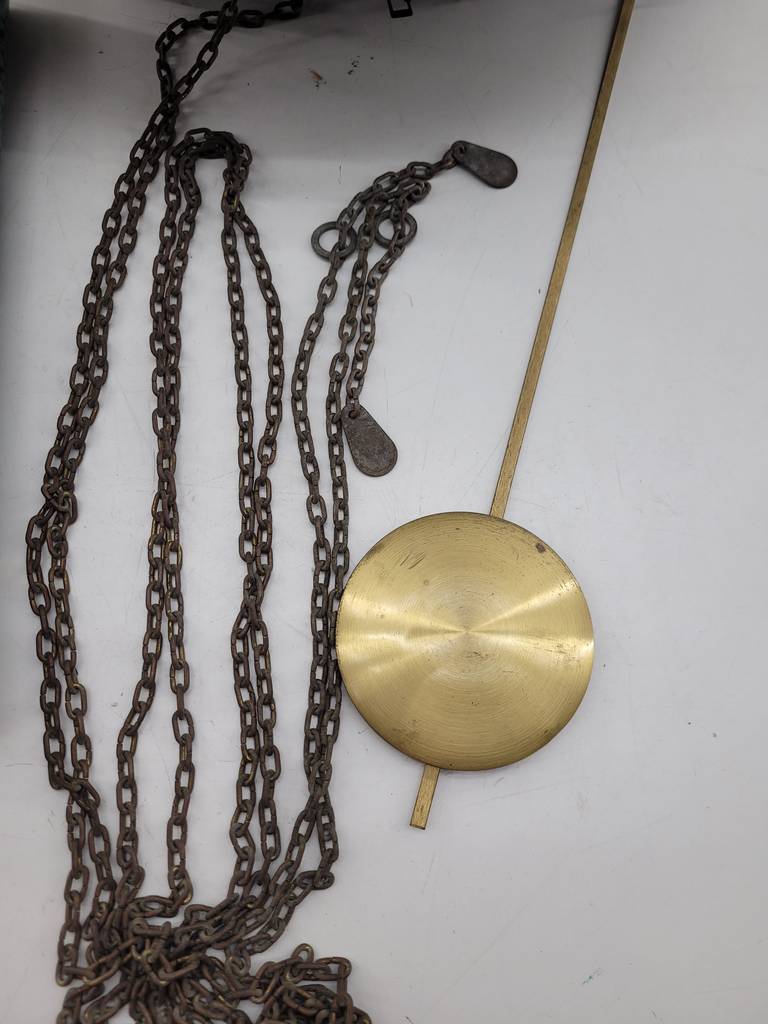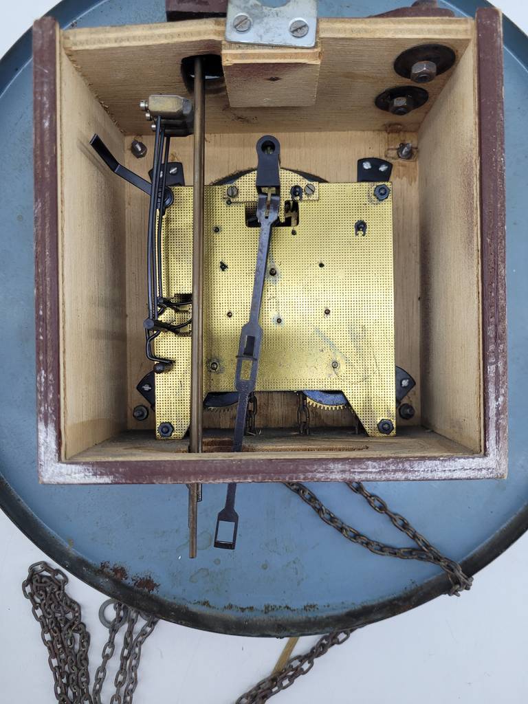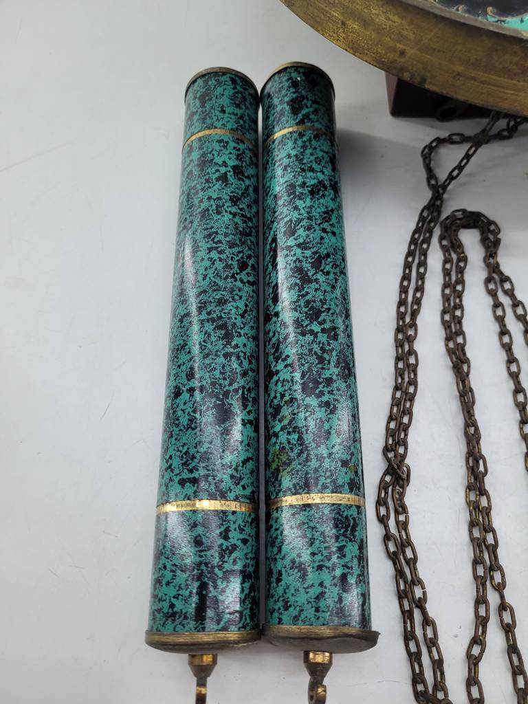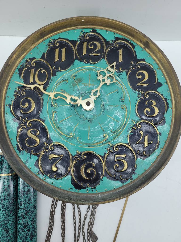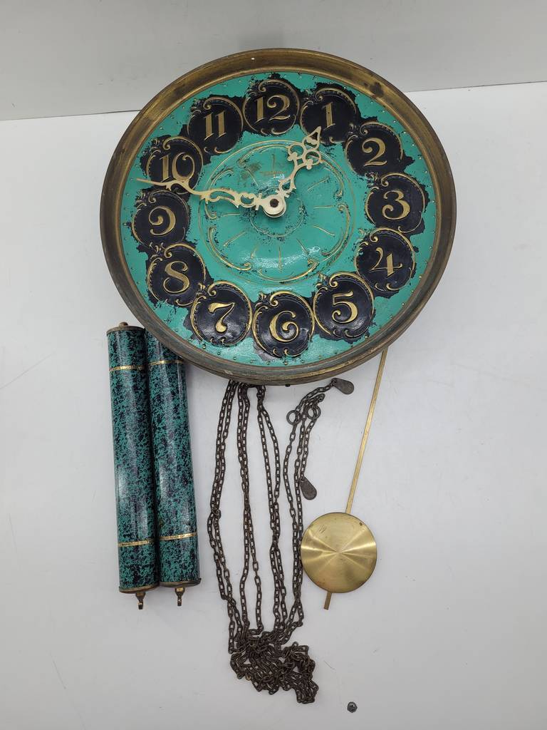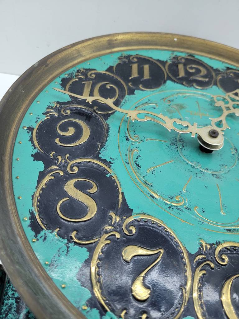 Reloj de pared de estilo clásico muy bonito y original con una base de color turquesa y con piezas de bronce y latón brillante que lo hacen resaltar aportandole un toque singular. Como podemos observar en las fotografías se encuentra en buenas condiciones. Es ideal para colocar en una pared como elemento decorativo puesto que no funciona.