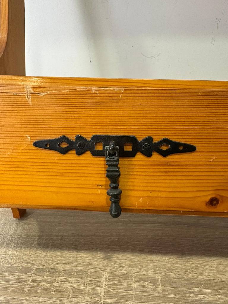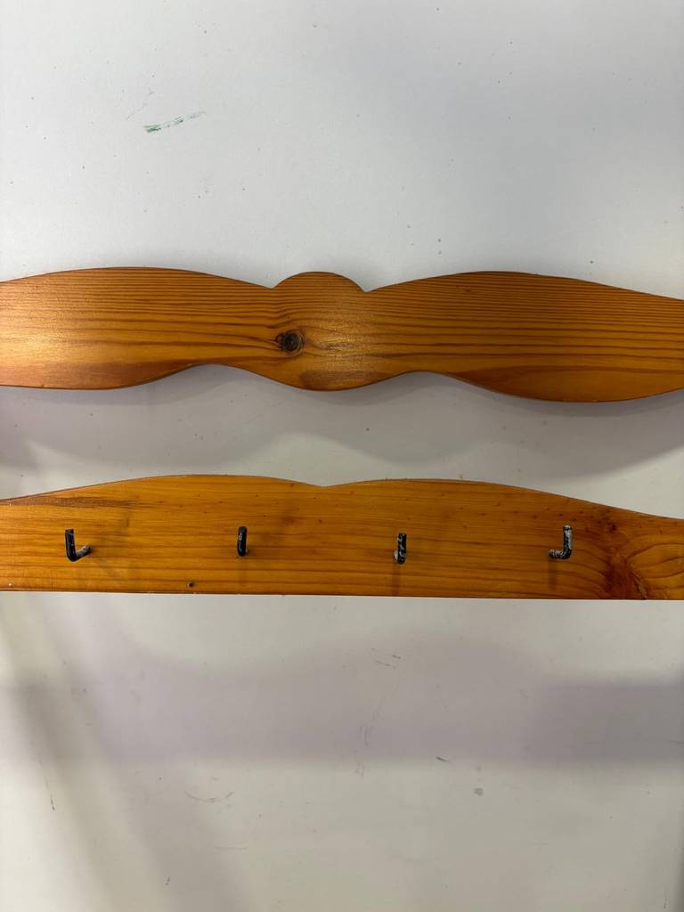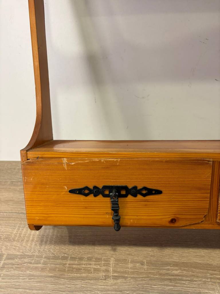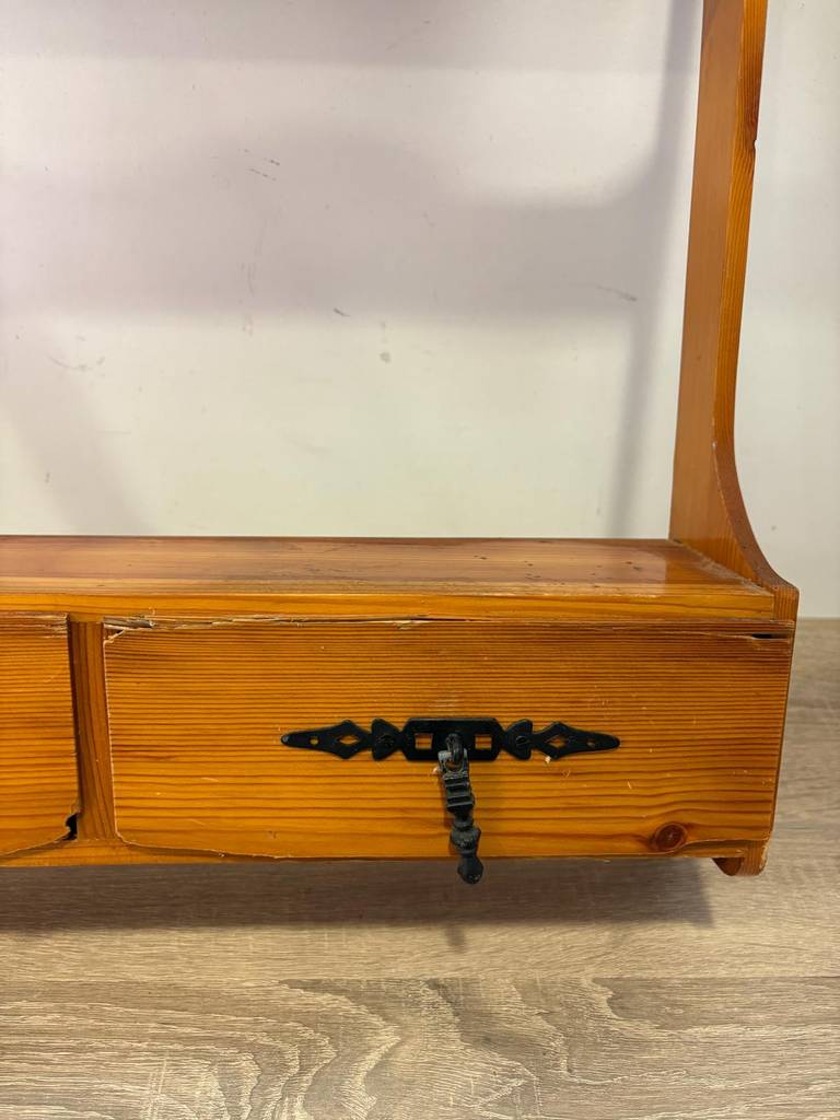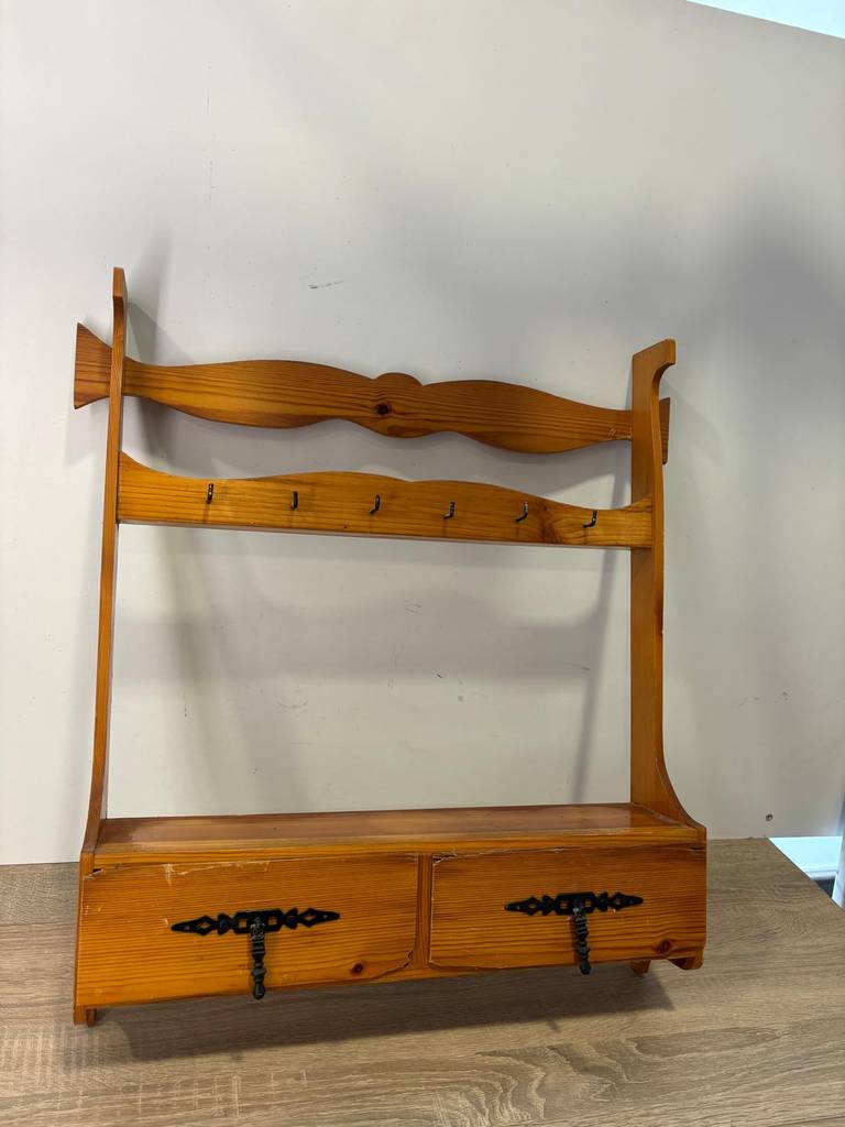 Repisa de estilo provenzal que ha sido fabricada con madera de buena calidad y robusta. Se compone de múltiples percheros pequeños en la parte superior y en la parte inferior un tablón de madera para colocar enseres y dos cajones con tiradores metálicos para abrirlos fácilmente. Como podemos observar en las fotografías presenta desperfectos.