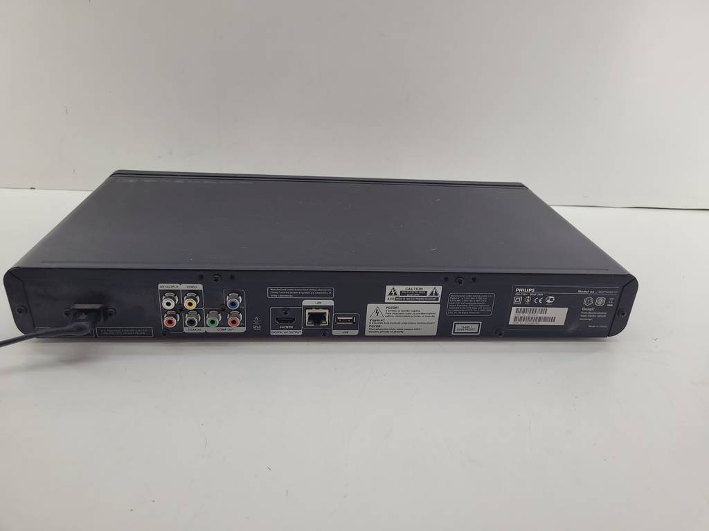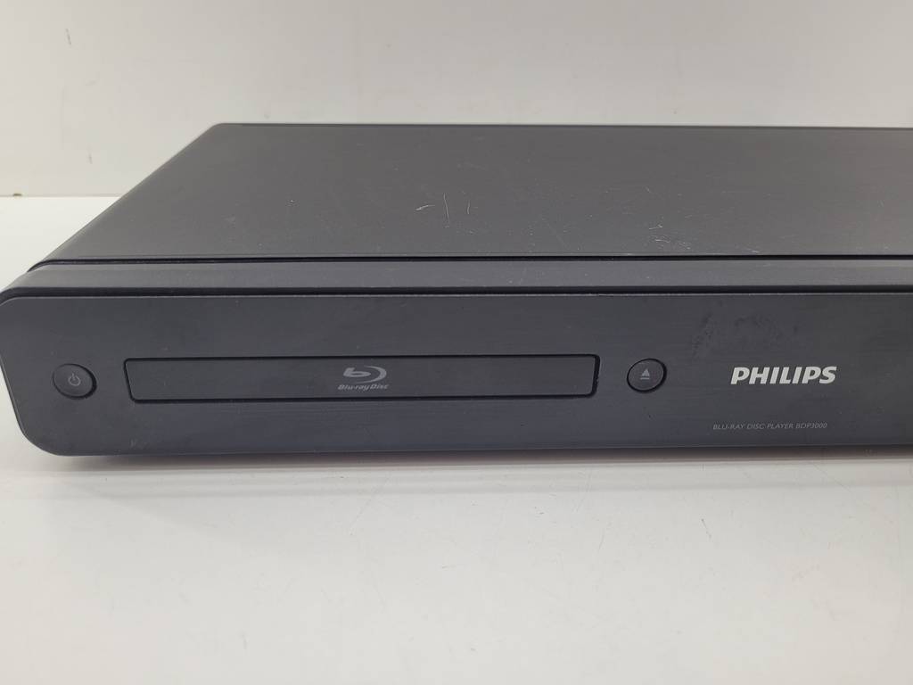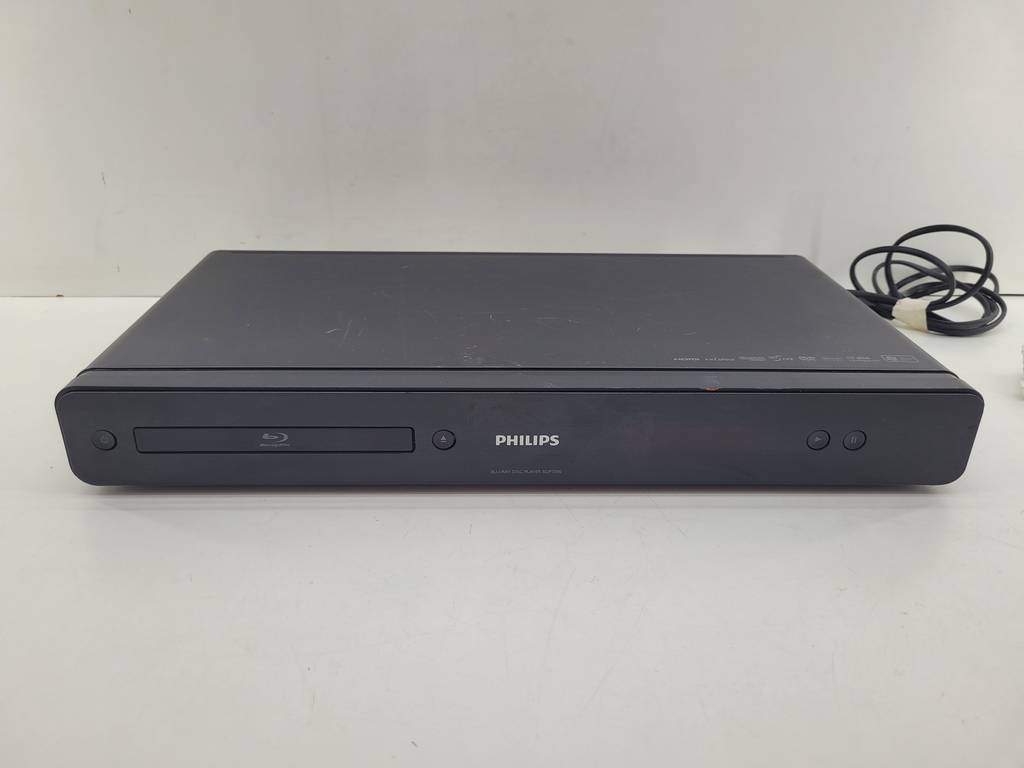 Reproductor de discos de blu-ray de la reconocida marca de electrodomésticos Philips de color negro. Se trata de un reproductor de blu-ray que resulta ideal para colocarlo encima de un mueble en un salón comedor para ver películas o series sentado en el sofá de manera cómoda. Como se puede observar en las fotografías se encuentra en buenas condiciones.