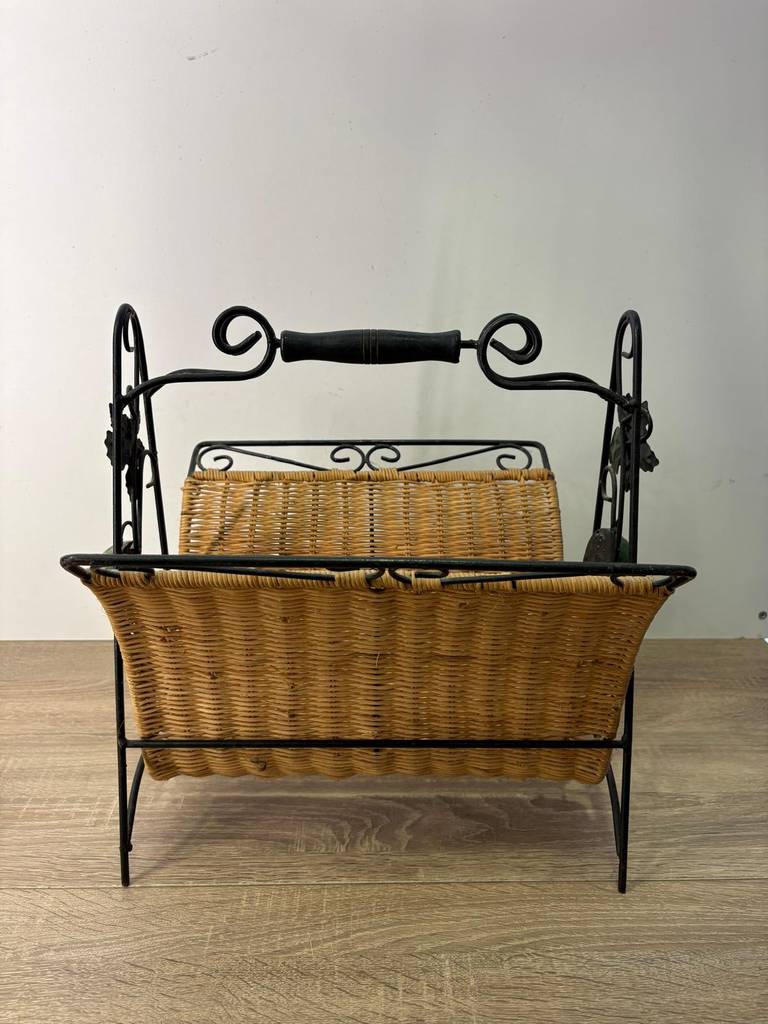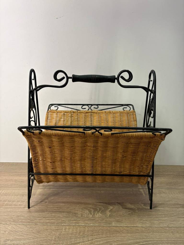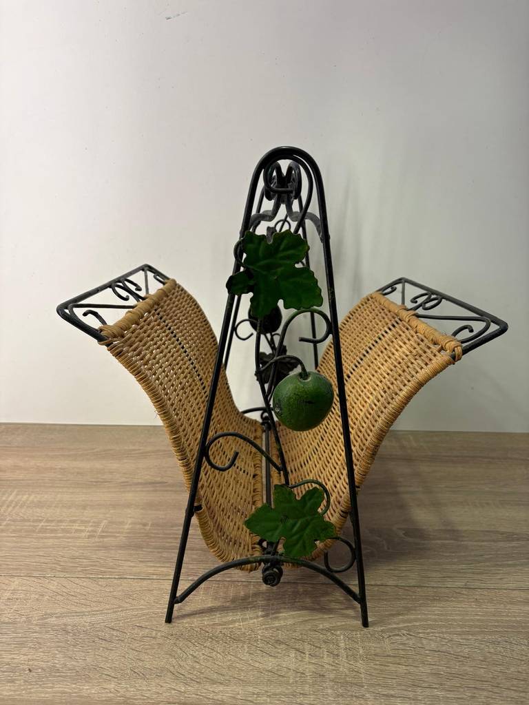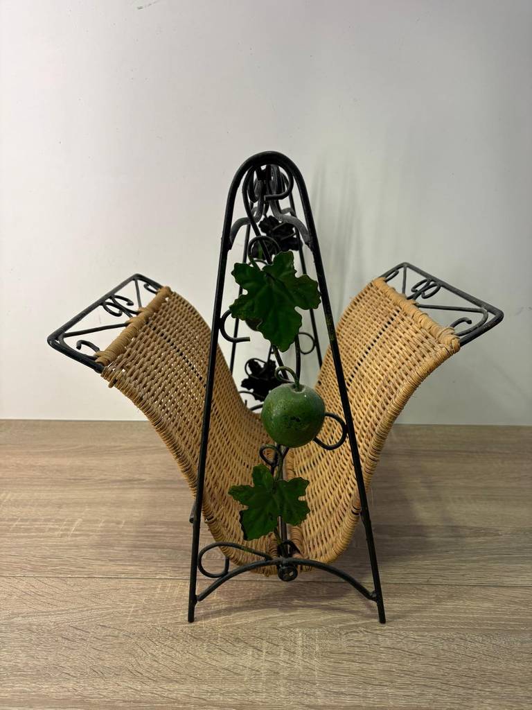 Revistero muy bonito y original con una estructura principal de metal de buena calidad y duradero, está rodeado sobre dos bases de mimbre abiertas a modo de libro que lo hace ideal para colocar gran cantidad de revistas o libros. Es ideal para colocar en un salón comedor o en la sala de espera de nuestro negocio. Como podemos observar en las fotografías se encuentra en buenas condiciones.