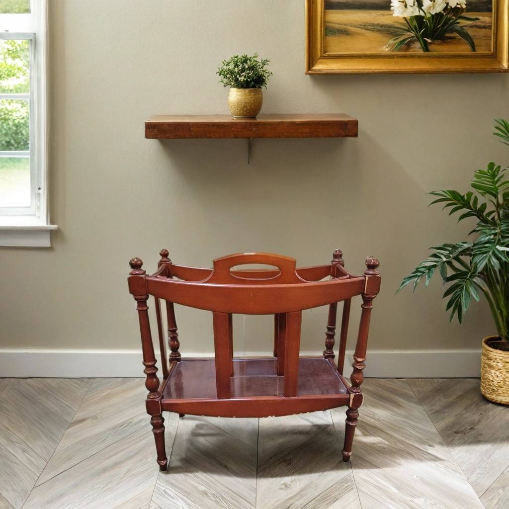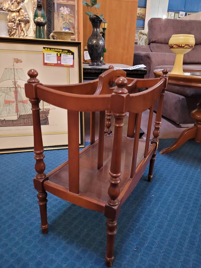 Revistero rústico hecho de madera de buena calidad y robusta color marrón. Está hecho de finas columnas de madera tallada que le dan un toque muy original y vintage. Dispone de una asa en la parte superior para poder cogerlo y moverlo de sitio con facilidad. Se encuentra con ligeros rasguños como se puede ver en las imágenes. Es ideal para darle un toque clásico tanto al hogar como también a la oficina.