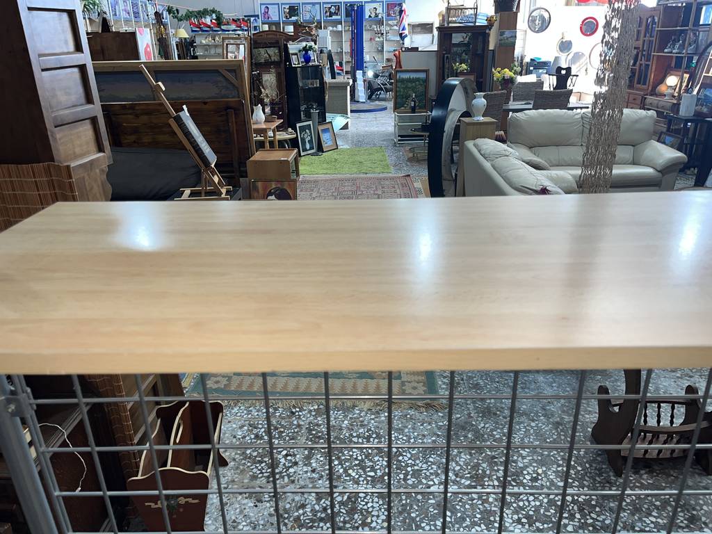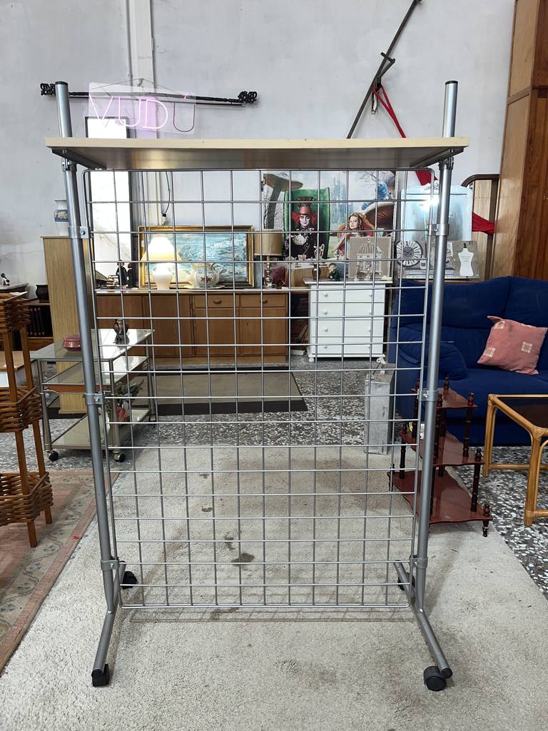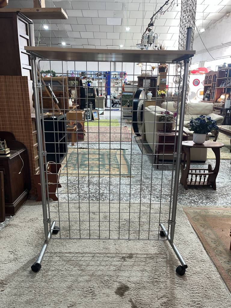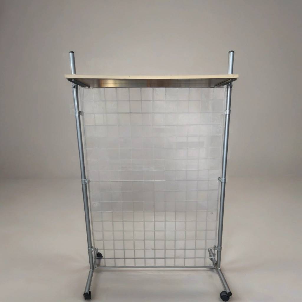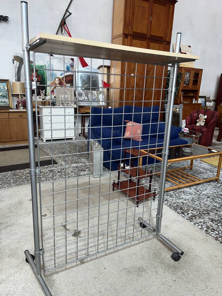 Separador para comercio o negocio que incorpora ruedas para moverlo muy fácilmente. Se compone de un tablón grueso de madera de buena calidad superior y de una estructura metálica de pequeños cuadros en la parte inferior. Como podemos observar en las fotografías se encuentra en buenas condiciones y listo para ser utilizado.