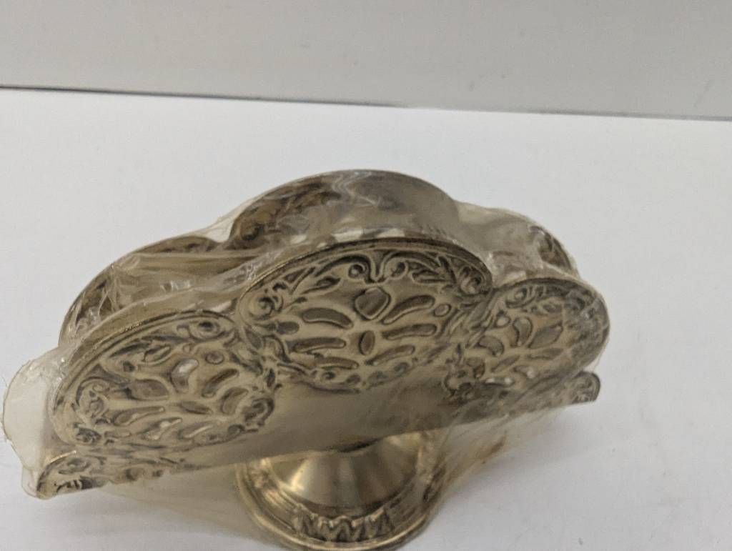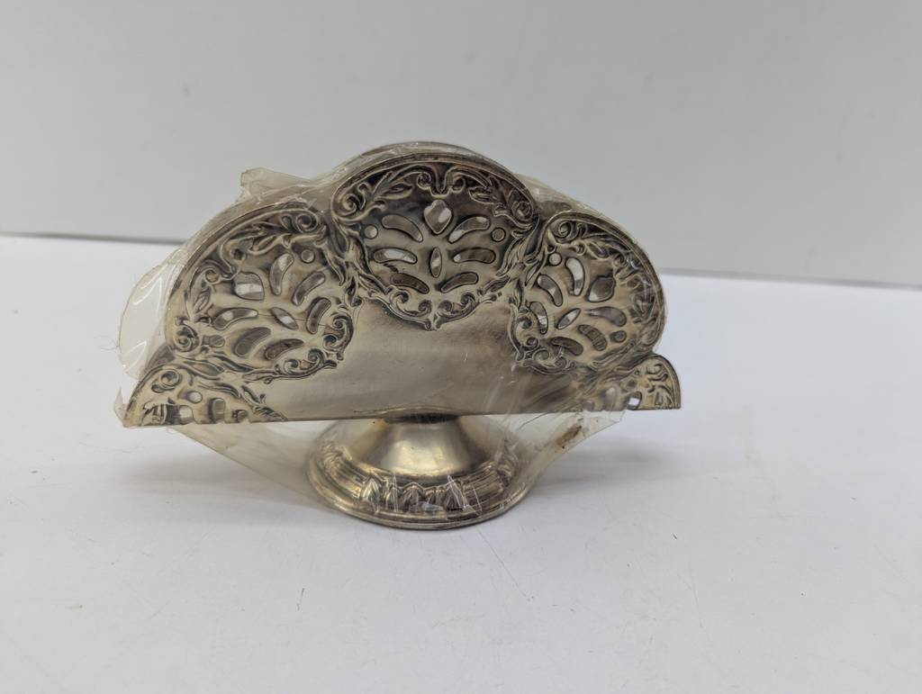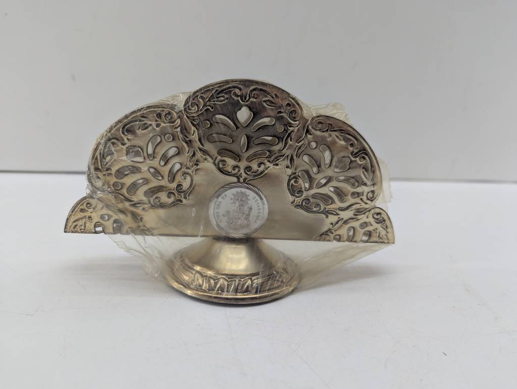 Servilletero decorativo muy bonito y elegante en color plateado brillante con unas formas y detalles realizados con precisión y detalle. Se trata de una pieza ideal para decorar en un salón comedor, por ejemplo. Como podemos observar en las fotografías se encuentra nuevo. Aprovecha esta oportunidad de llevarte un servilletero decorativo a un precio muy económico.