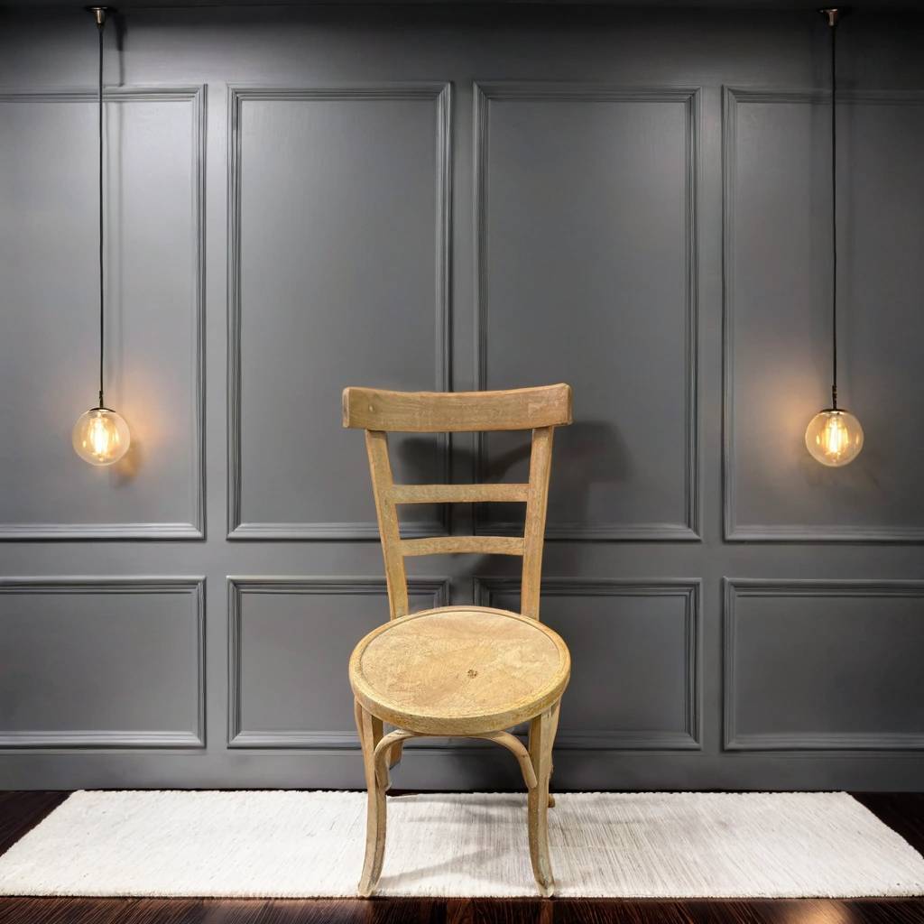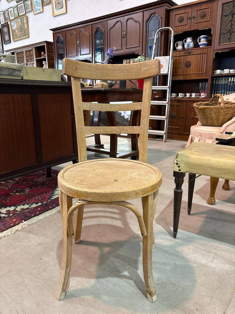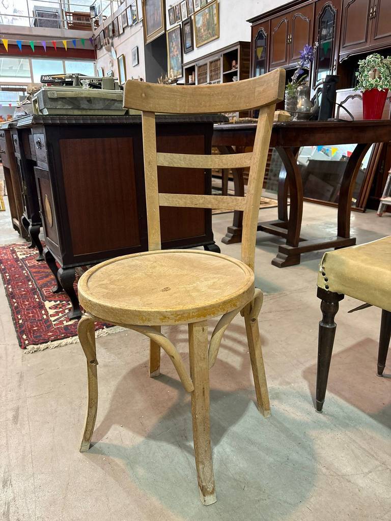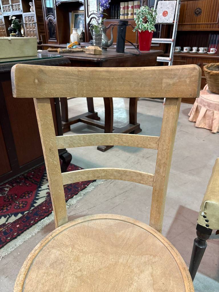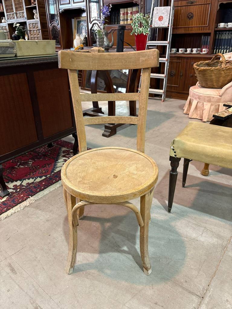 Silla de estilo clásico fabricada en madera de buena calidad de color marrón claro. Se trata de una silla que cuenta con cuatro patas robustas, un asiento redondo y un respaldo creado por la unión de varios listones de madera. Es una silla perfecta para colocarla en un salón comedor de estilo vintage. Como se puede observar en las fotografías se encuentra en buenas condiciones.