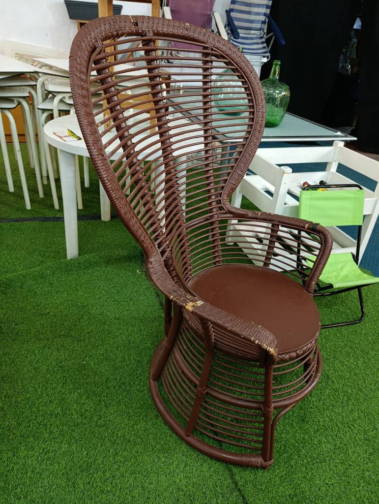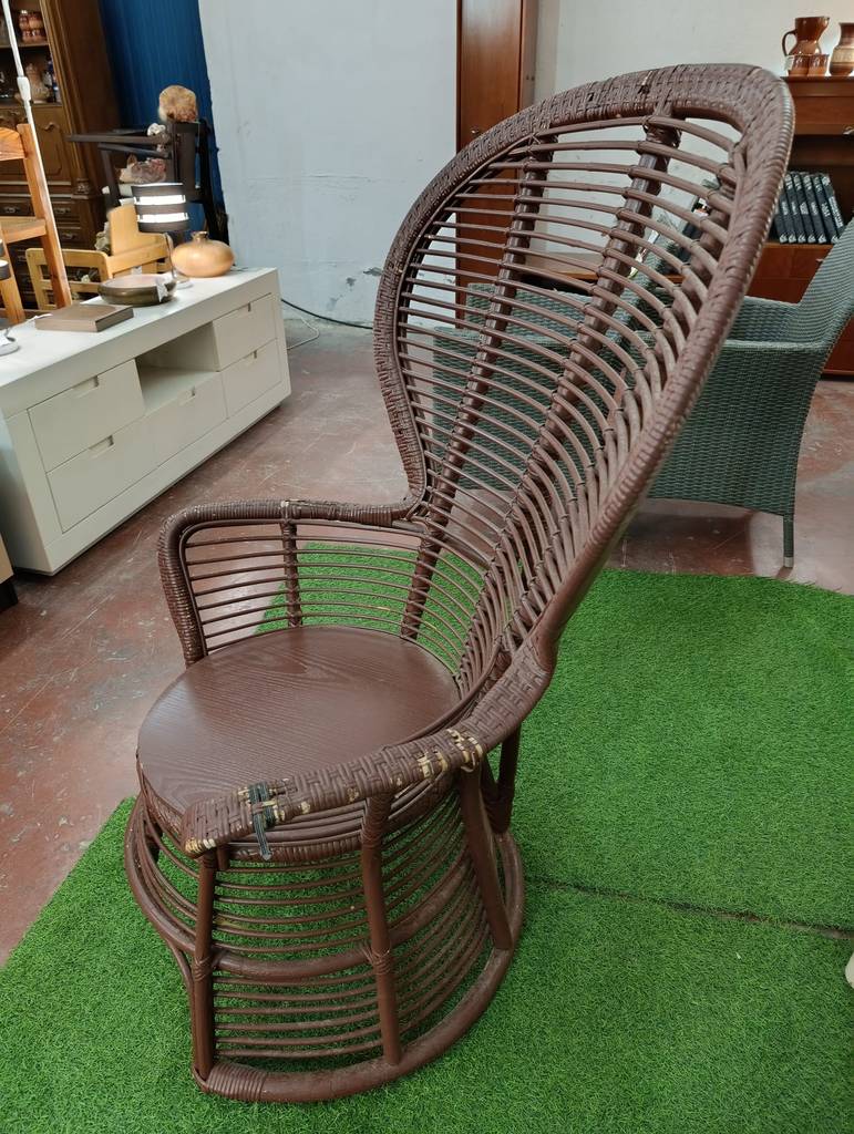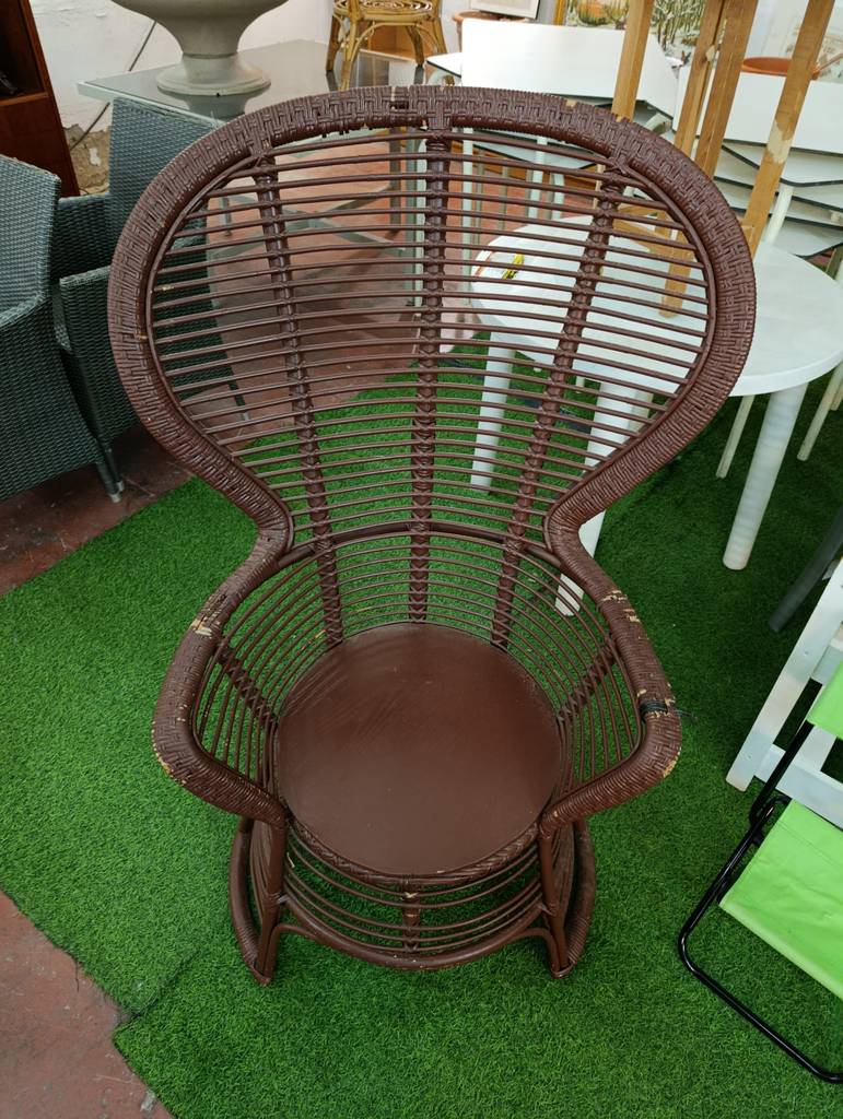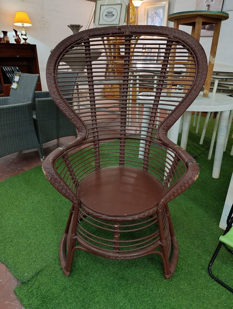 Silla muy bonita y elegante que ha sido fabricada con mimbre de buena calidad. De color marrón oscuro esta silla aporta un diseño único con respaldo y reposabrazos en una única pieza lo que la hará resaltar en nuestro jardín o porche, por ejemplo. Como podemos observar en las fotografías presenta desperfectos aunque cumple su función correctamente.