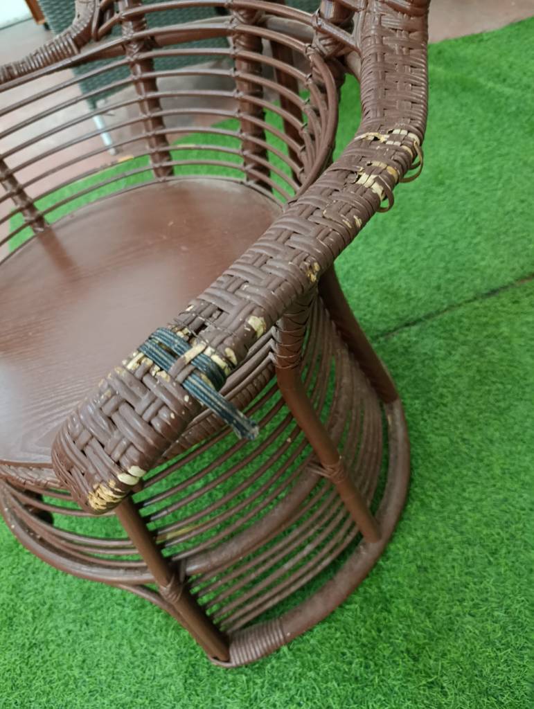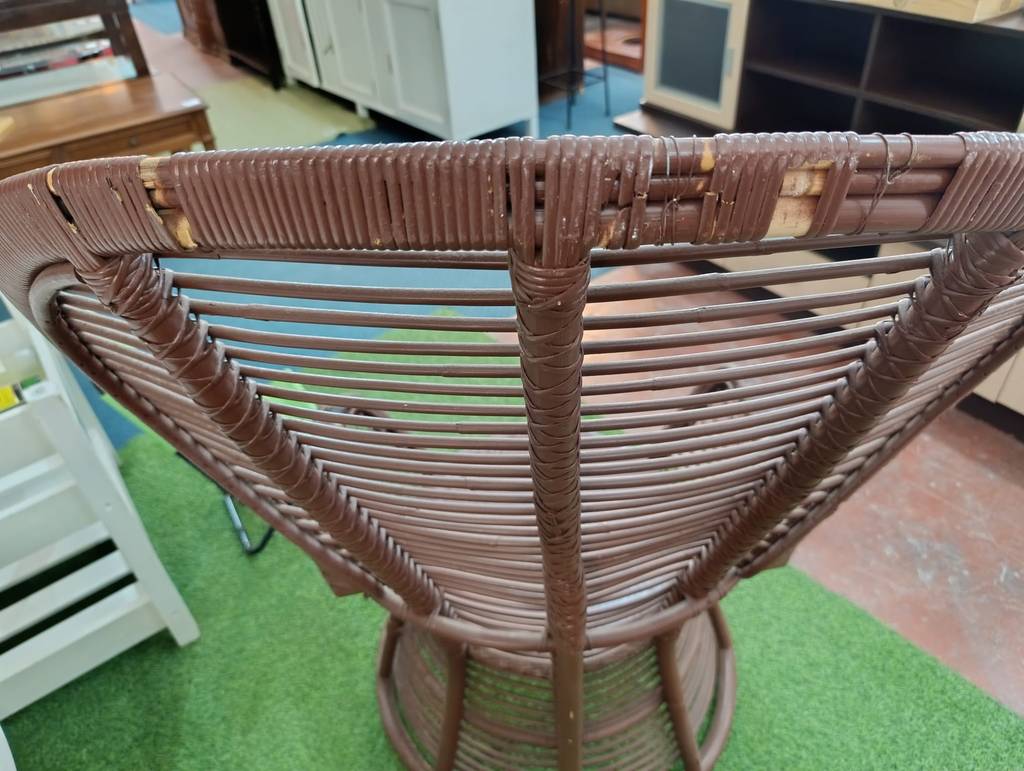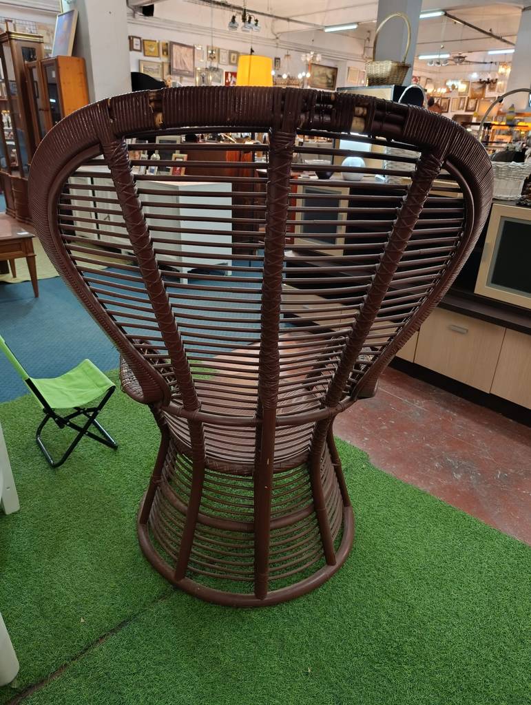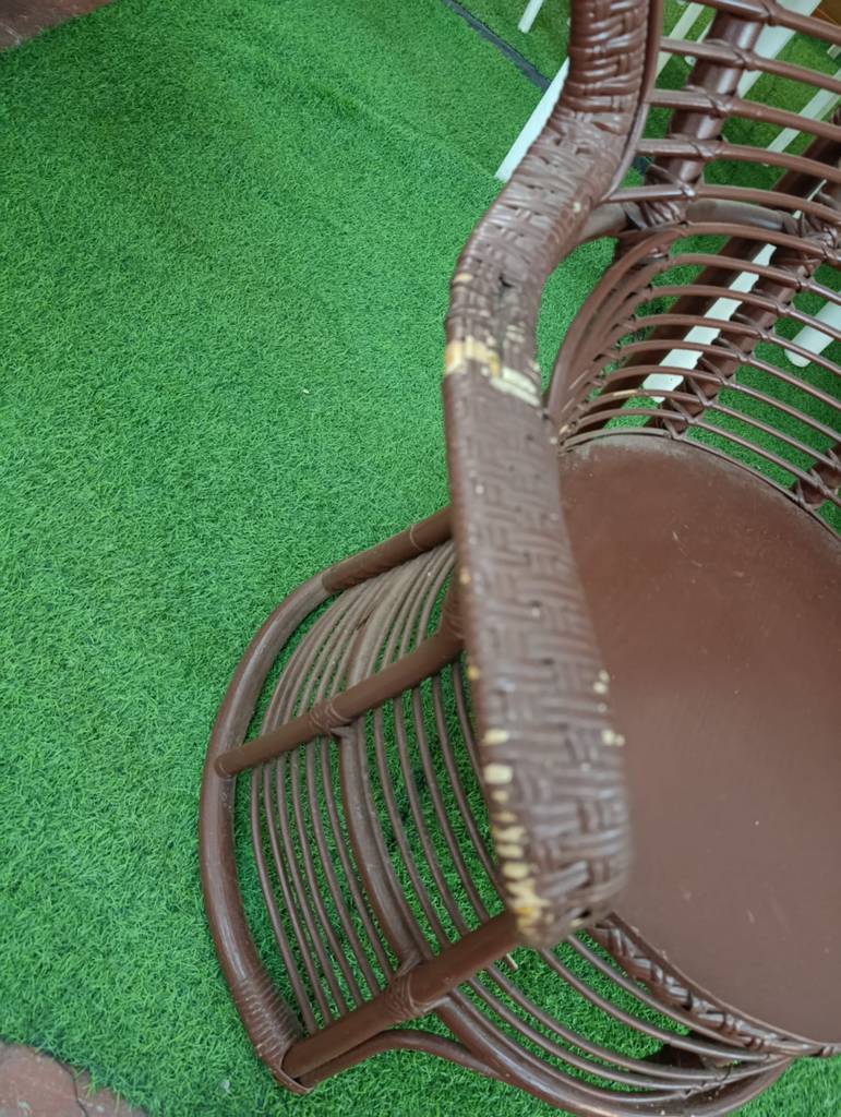 Silla muy bonita y elegante que ha sido fabricada con mimbre de buena calidad. De color marrón oscuro esta silla aporta un diseño único con respaldo y reposabrazos en una única pieza lo que la hará resaltar en nuestro jardín o porche, por ejemplo. Como podemos observar en las fotografías presenta desperfectos aunque cumple su función correctamente.