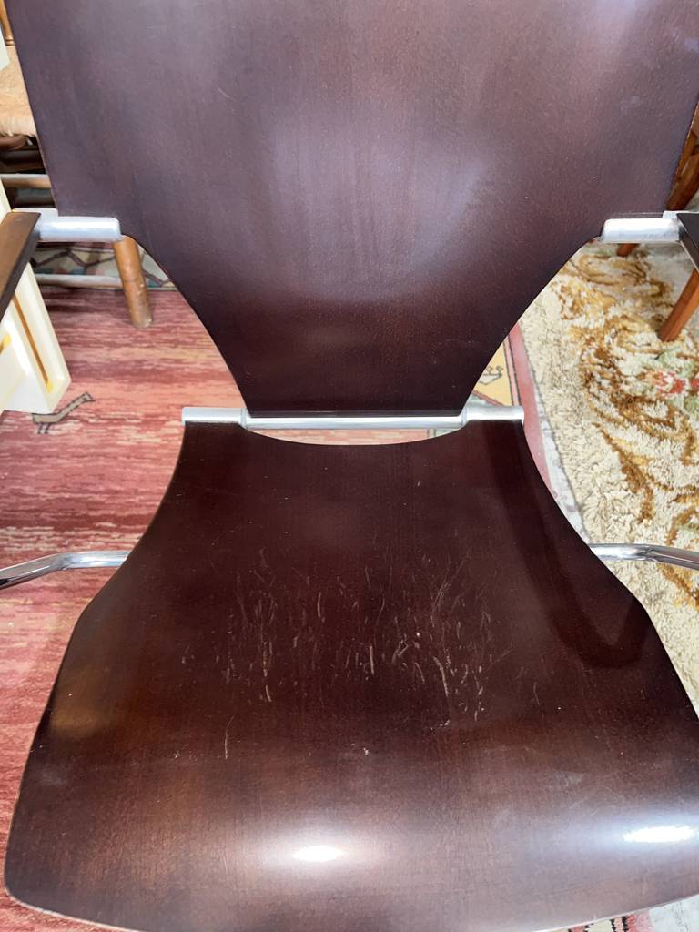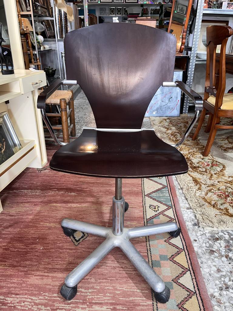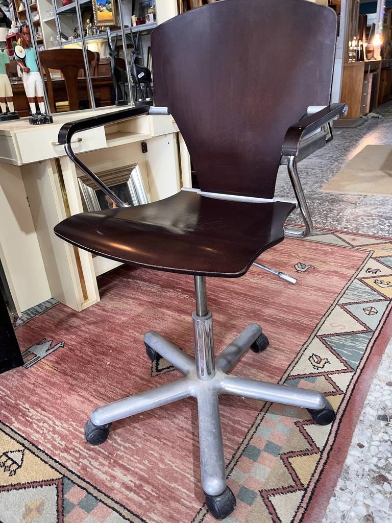 Silla de oficina cuyo asiento es de madera de buena calidad de color negro. Se trata de una silla de oficina que cuenta con dos prácticos reposabrazos y tiene cinco patas con ruedas para poder transportarla con mayor facilidad por cada estancia del hogar. Es una silla ideal para tenerla tanto en un negocio como en un estudio del hogar. Como se puede observar en las fotografías se encuentra en buenas condiciones.
