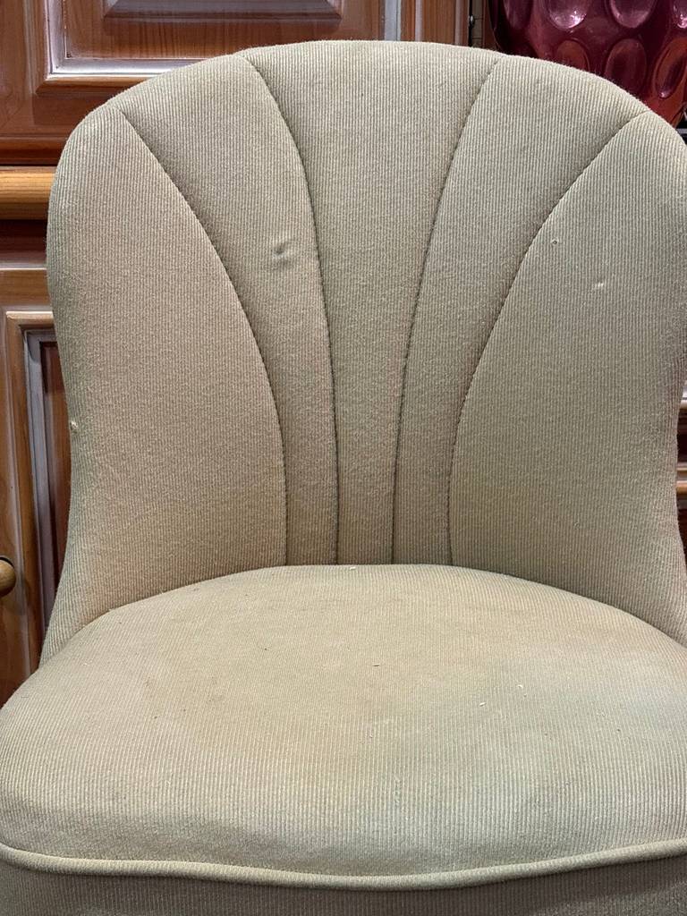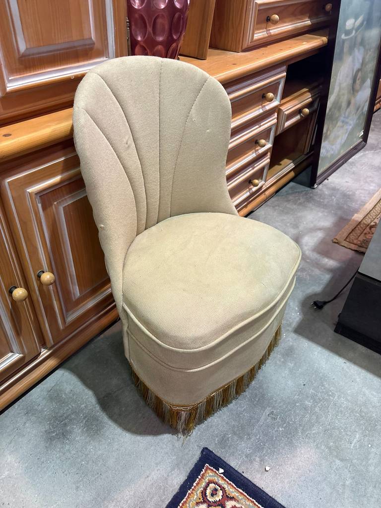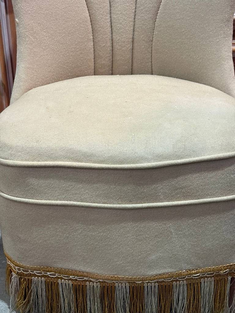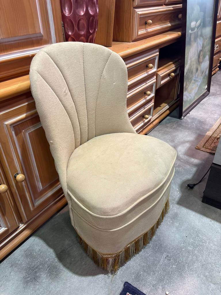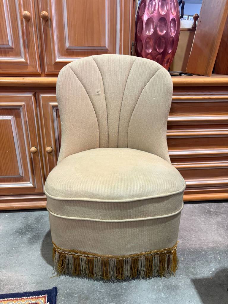 Silla descalzadora fabricada con materiales de buena calidad de color crema con flecos en la parte inferior de color plateado y dorado. Se trata de una silla o sillón descalzador que cuenta con un cómodo asiento y un práctico respaldo. Es una silla ideal para colocarla en un dormitorio individual o de matrimonio. Como se puede observar en las fotografías se encuentra en buenas condiciones.