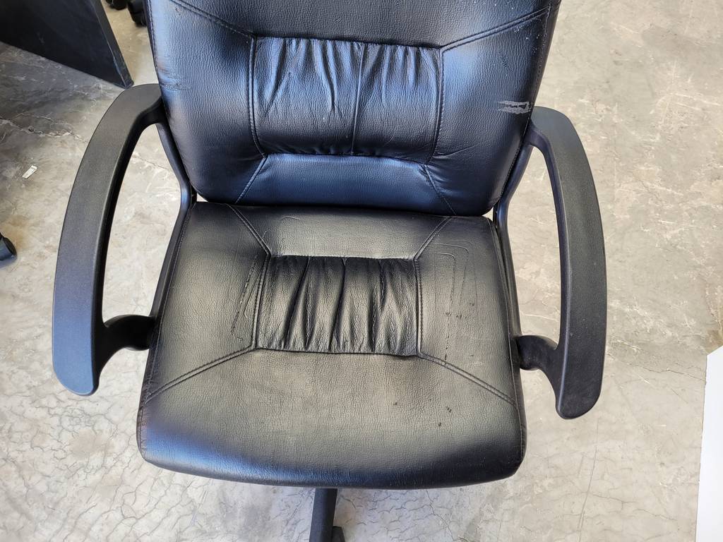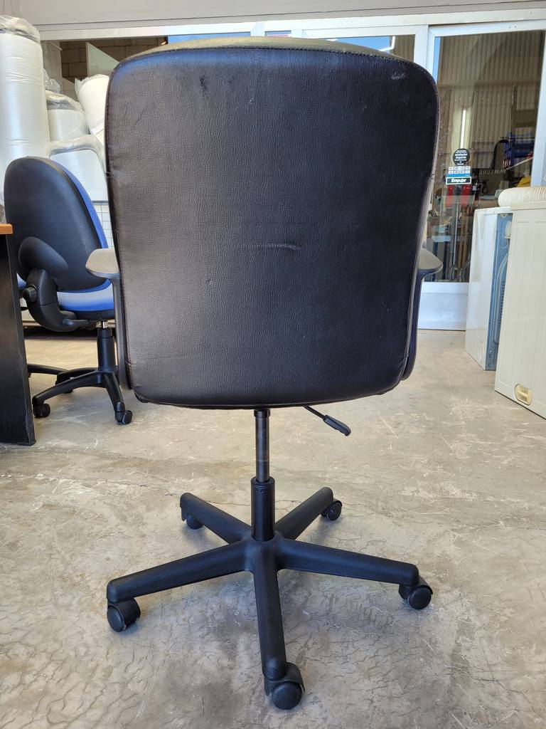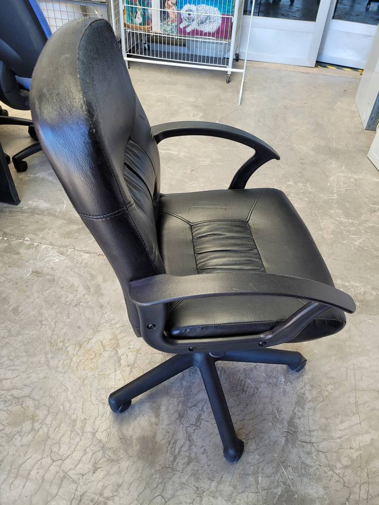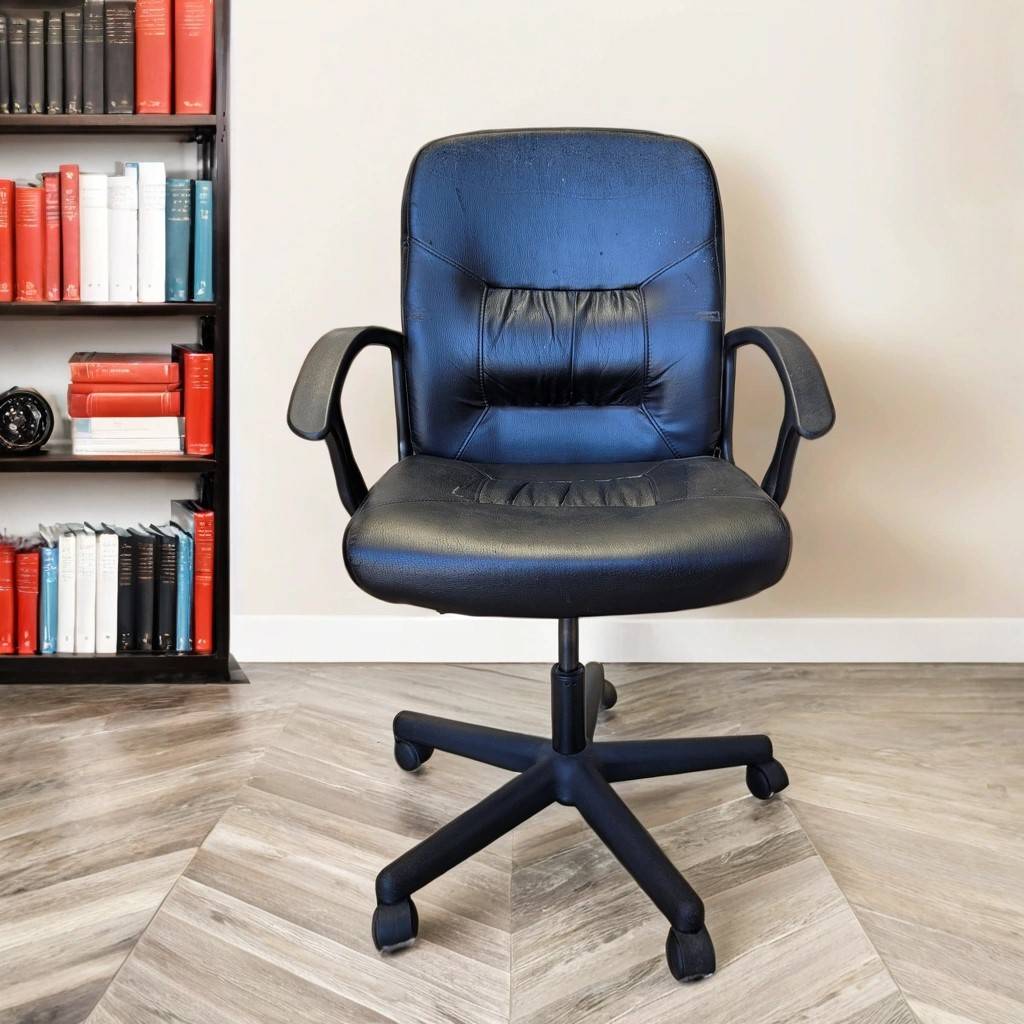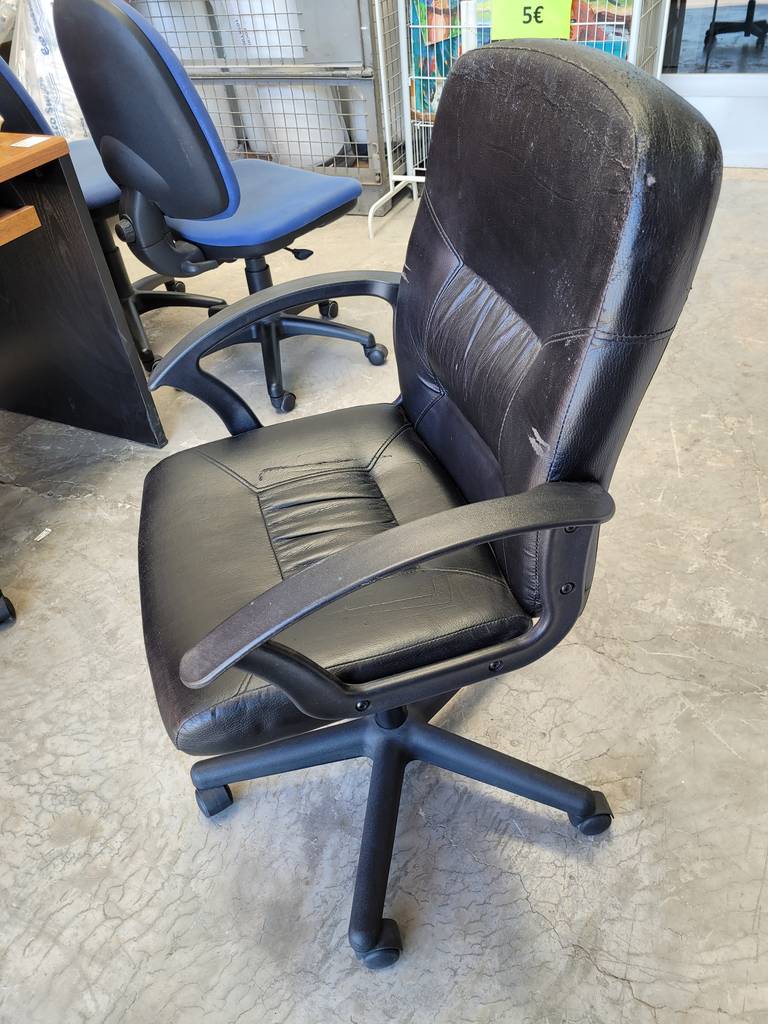 Silla giratoria fabricada con materiales de buena calidad de color negro. Se trata de una silla giratoria que cuenta con cinco ruedas para poder moverla por las estancias con mayor facilidad. Es una silla ideal para ponerla en un estudio junto a un escritorio. Como se puede observar en las fotografías la silla presenta ligeros desperfectos ocasionados por el paso del tiempo que no afectan a su funcionalidad.