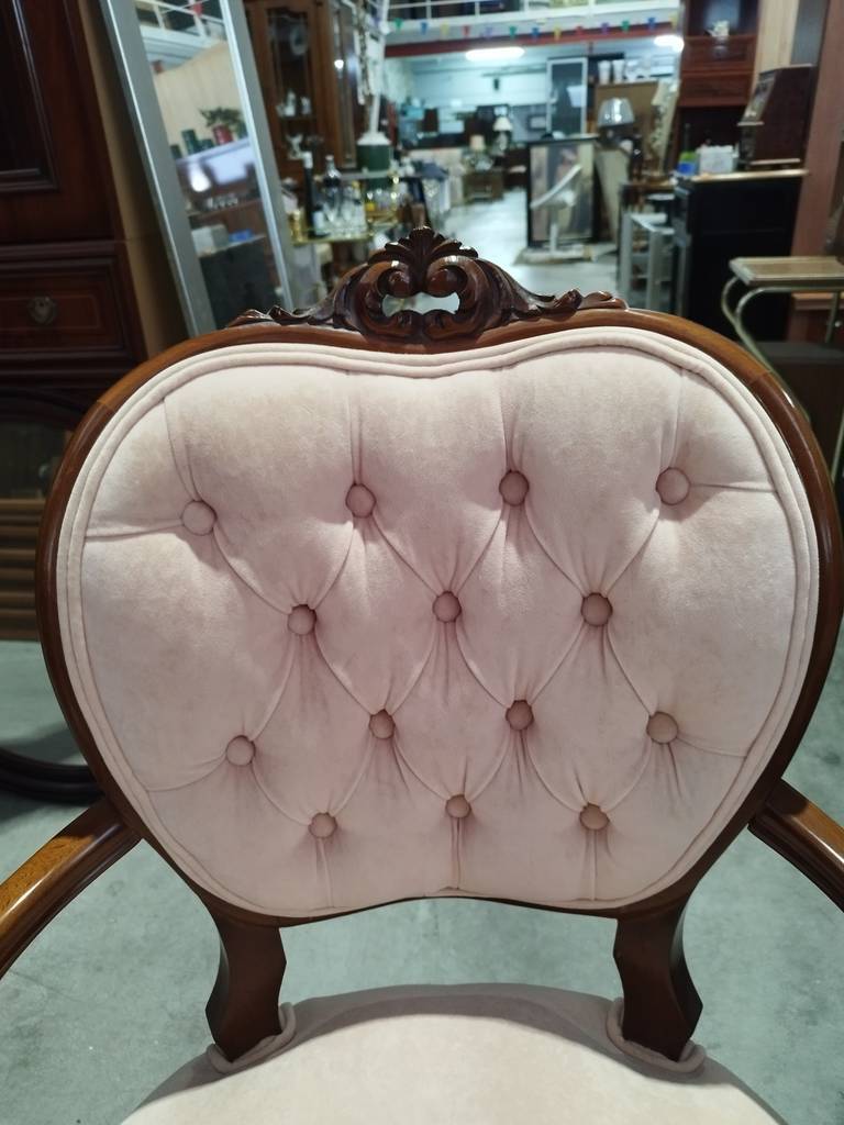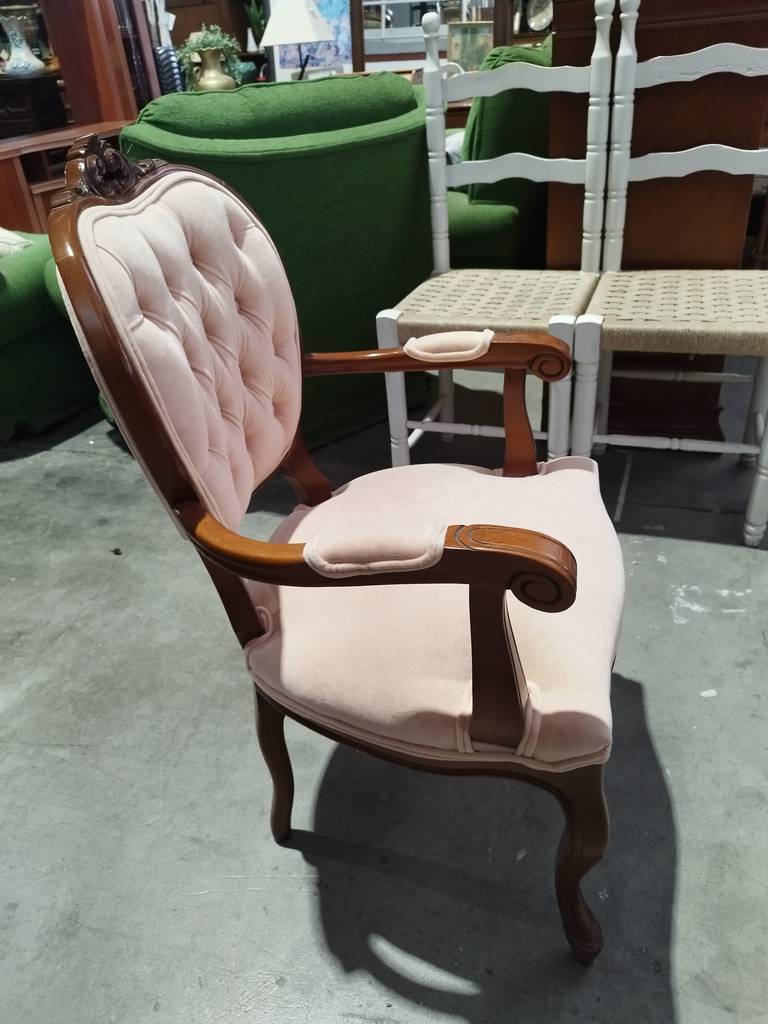 Silla Isabelina en color rosa con un diseño muy bonito y elegante que la hace resaltar. Con una estructura de madera de buena calidad y robusta esta silla tiene un asiento y respaldo así como dos coquetos reposabrazos realizados con una tela muy suave y agradable al tacto. Es ideal para colocar en un salón comedor. Como podemos observar en las fotografías se encuentra en buenas condiciones.