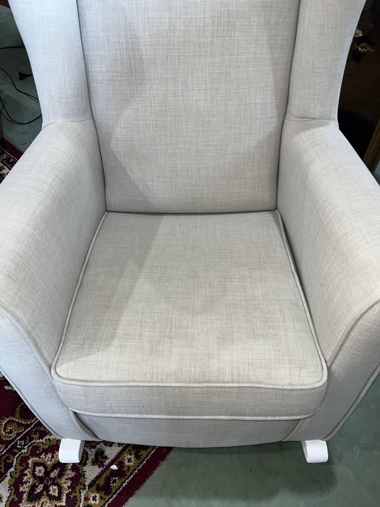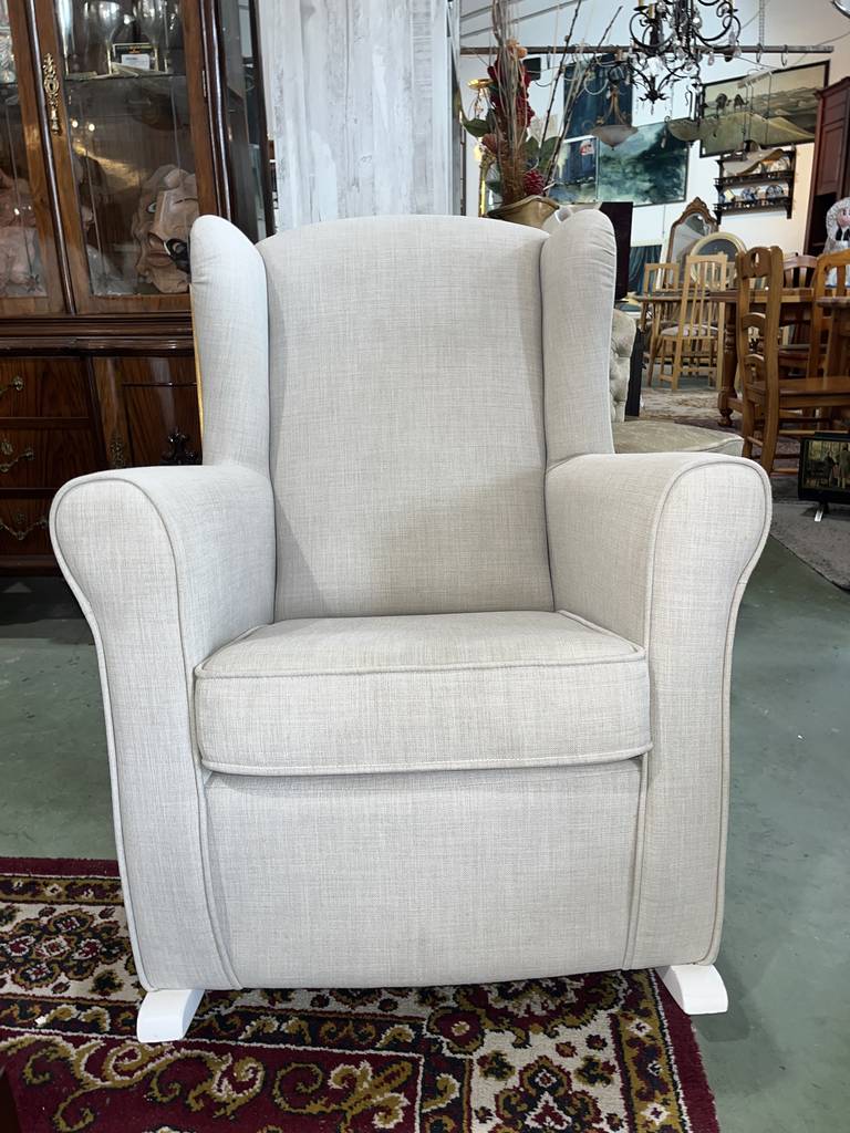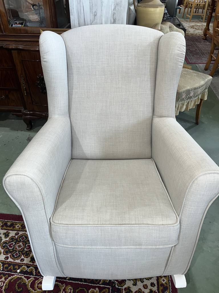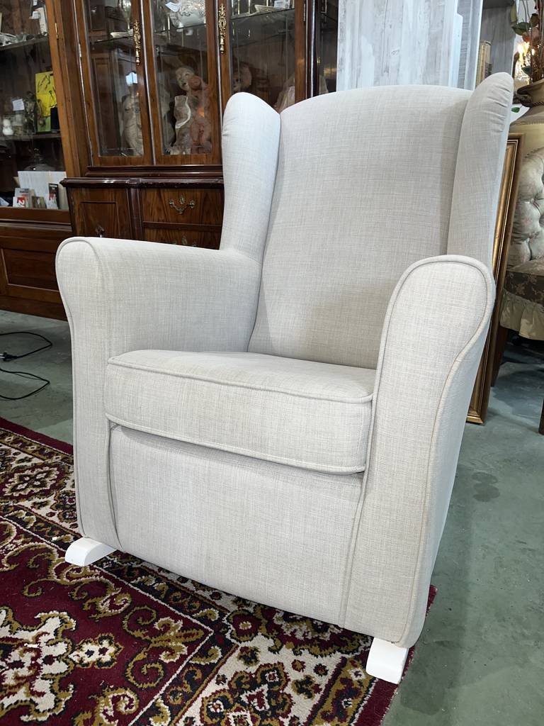 Sillón balancín fabricado con materiales de buena calidad de color gris claro. Se trata de un sillón balancín que cuenta con una base gracias a la que se puede balancear como una mecedora. Es un sillón perfecto para colocarlo en un salón comedor y relajarse sentado en él. Como se puede observar en las fotografías se encuentra en buenas condiciones.
