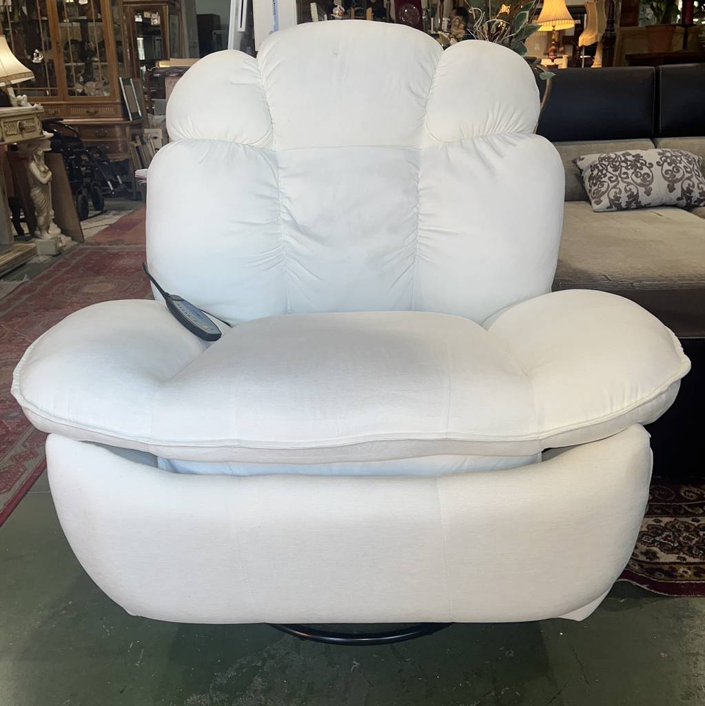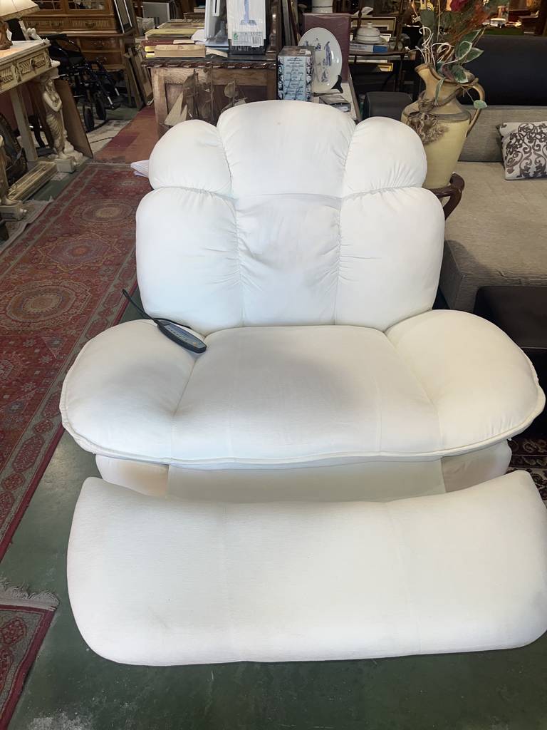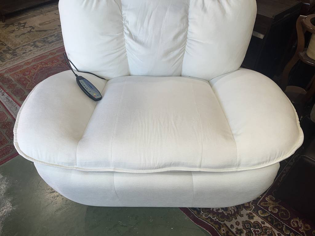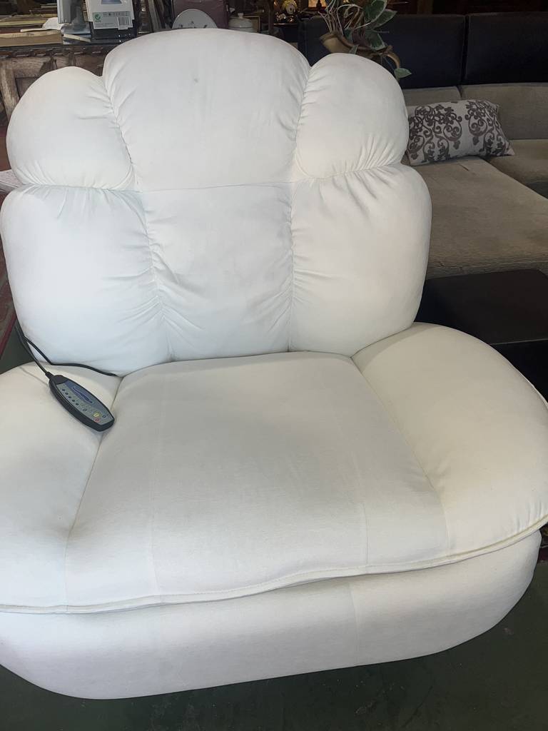 Sillón balancín en color blanco con masajeador incorporado. Se trata de un sillón muy cómodo con un asiento y respaldo cómodo y muy acolchado. Incorpora un mando lateral para masajearnos con diferentes configuraciones y potencias. También podemos reclinarlo de forma completa. Como podemos observar en las fotografías se encuentra en buenas condiciones. Aprovecha esta oportunidad de llevarte un sofá relax a un precio muy económico.