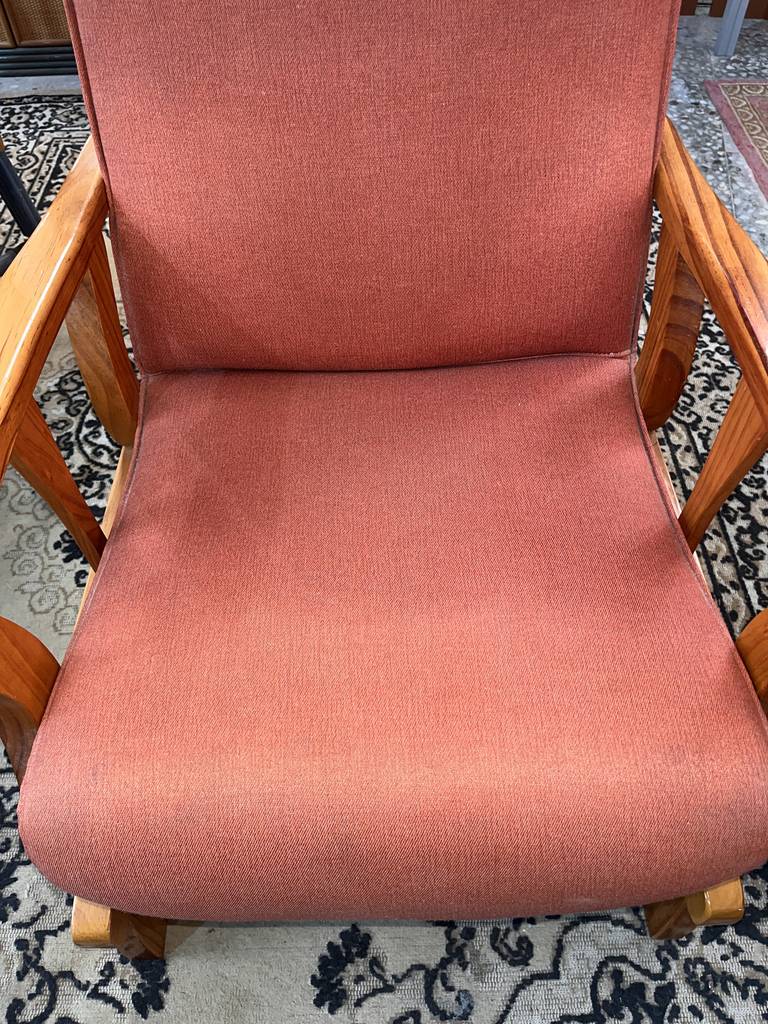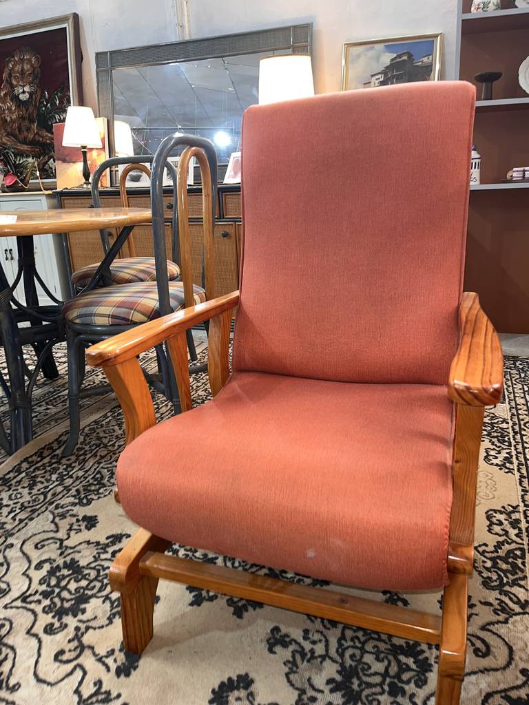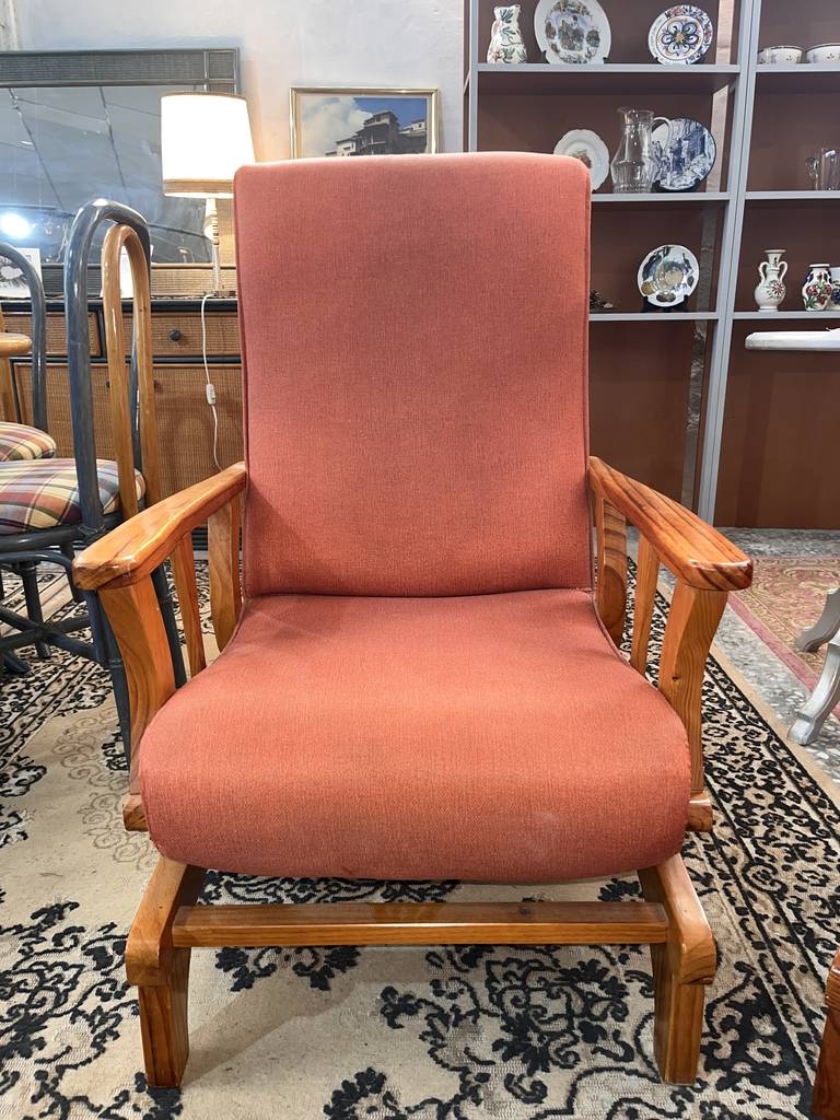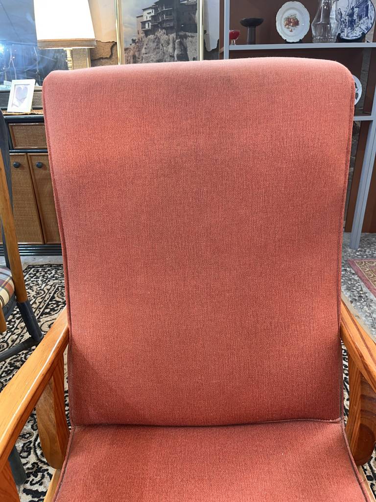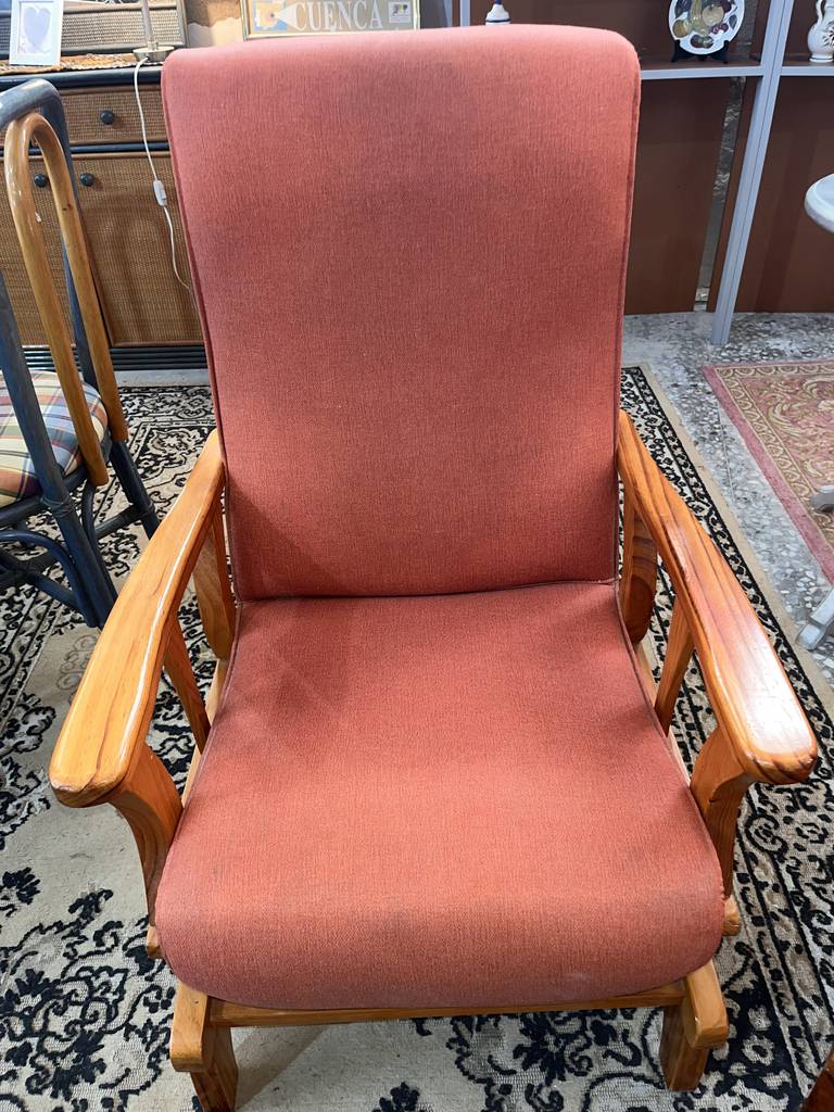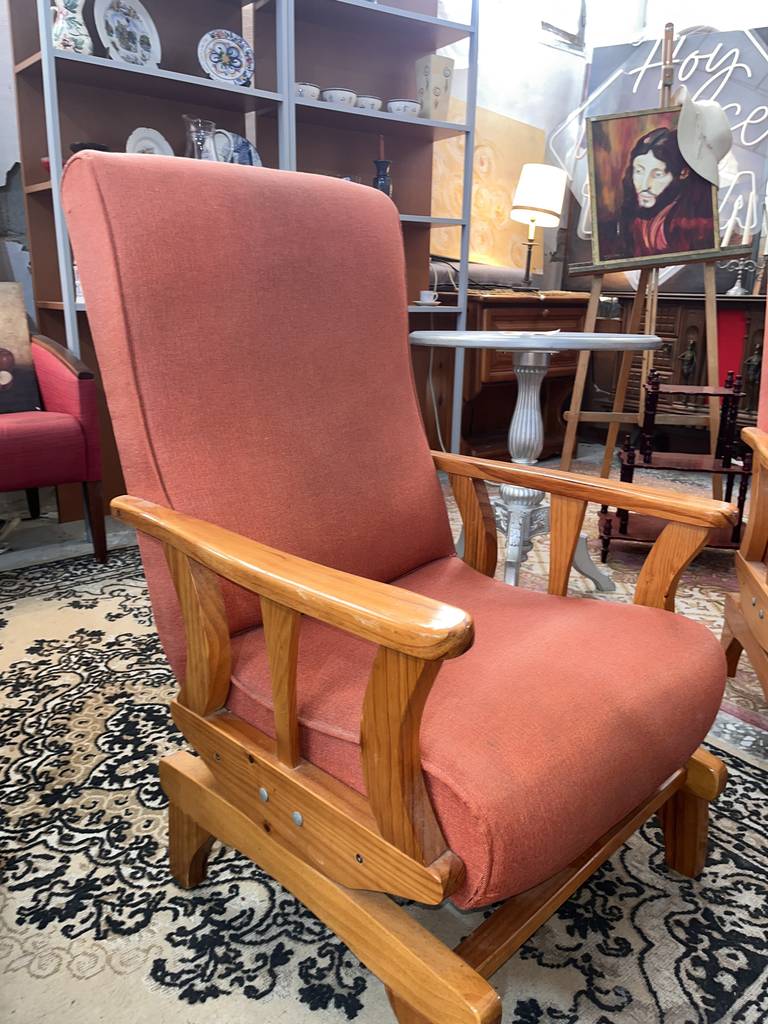 Sillón balancín tapizado con una tela de color anaranjado. Se trata de un sillón balancín cuya estructura está fabricada en madera de buena calidad de color marrón claro y cuenta con un asiento y un respaldo acolchados y confortables. Es un sillón perfecto para colocarlo en un salón comedor para ver la televisión sentado en él. Como se puede observar en las fotografías se encuentra en buenas condiciones.