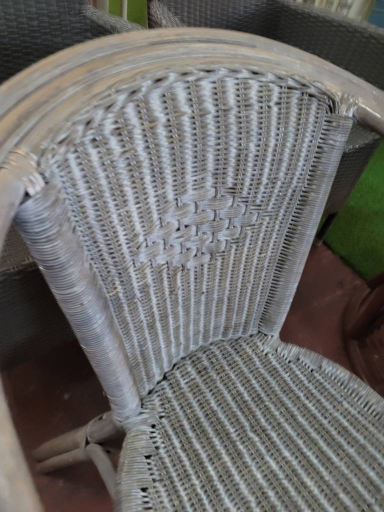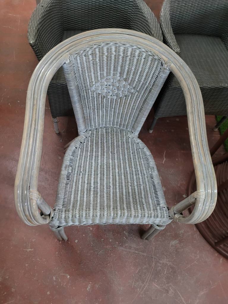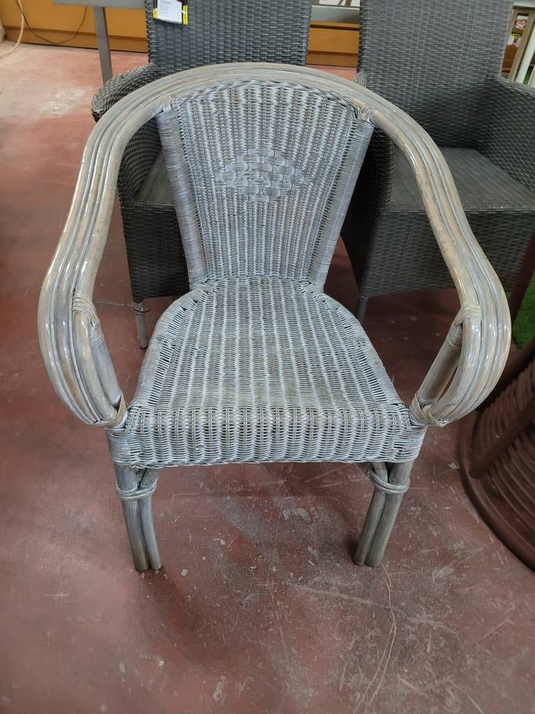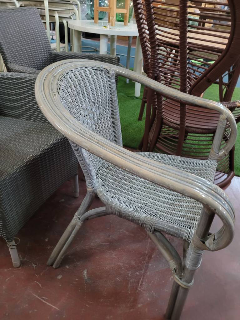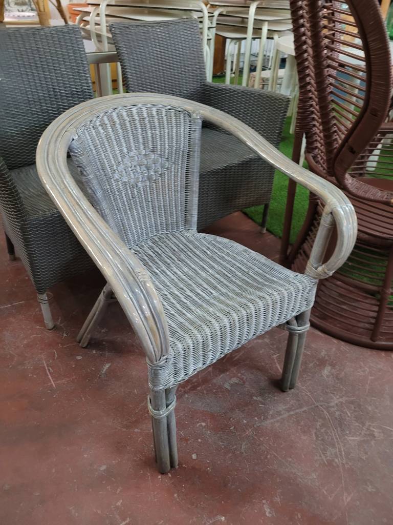 Sillón individual de médula de color gris. Se trata de un sillón que cuenta con cuatro patas robustas y tiene dos reposabrazos gruesos para apoyar los brazos de manera cómoda. Es una silla perfecta para tenerla tanto en una zona interior del hogar como en una zona exterior. Como se puede observar en las fotografías se encuentra en buenas condiciones para ser utilizada.