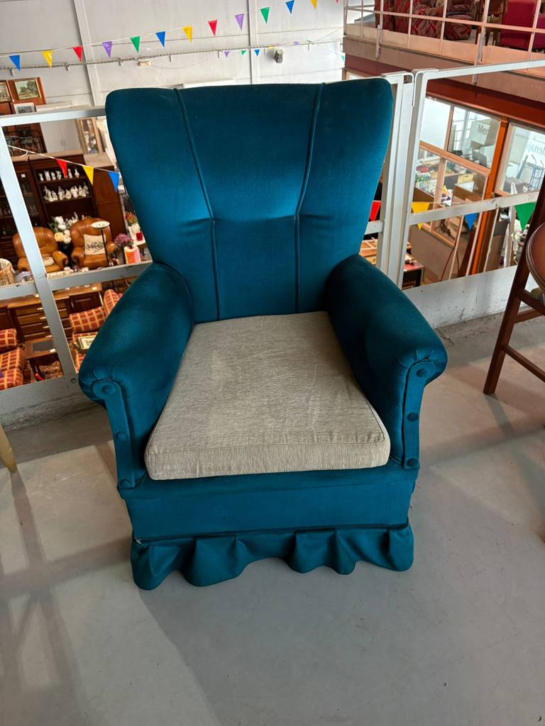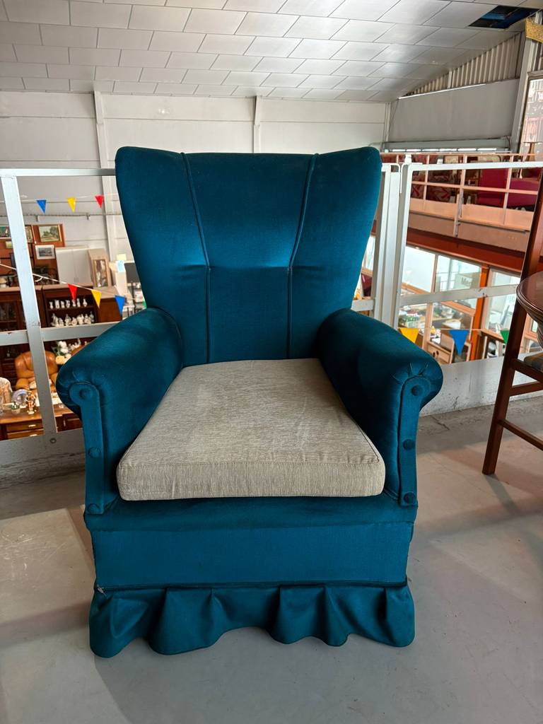 Sillón individual tapizado con una bonita y original tela de terciopelo de color azul oscuro. Se trata de un cómodo sillón individual que dispone de dos prácticos reposabrazos y un confortable respaldo. Es un sillón perfecto para ponerlo en un salón comedor de estilo clásico. Como se puede observar en las fotografías se encuentra en buenas condiciones.