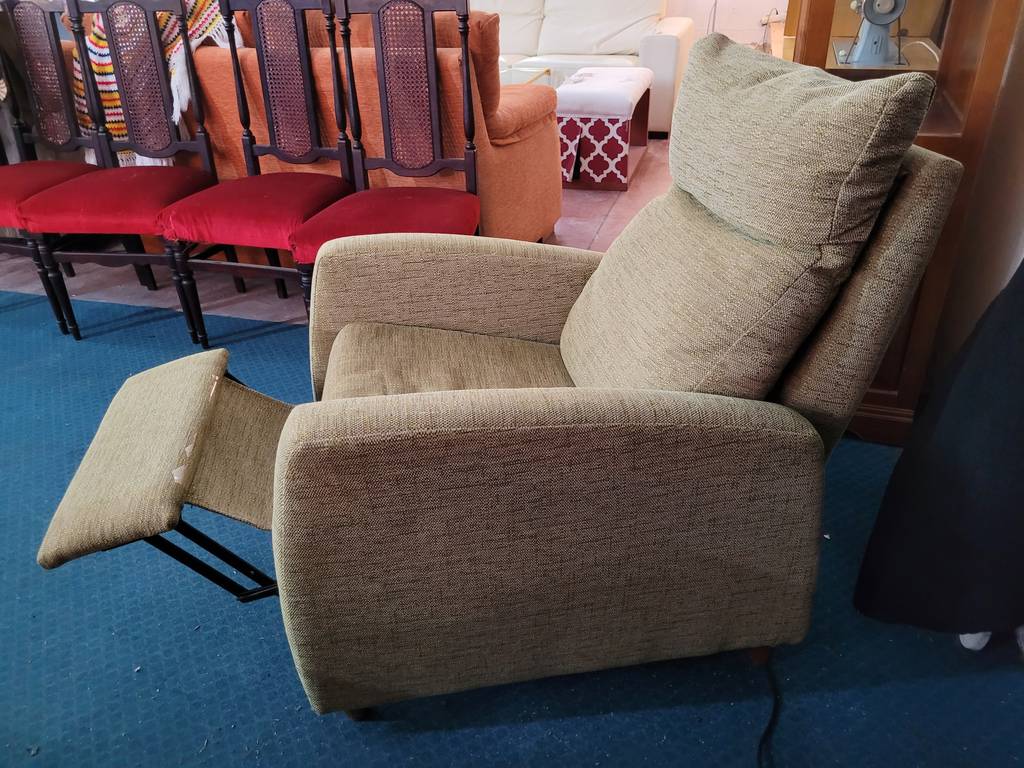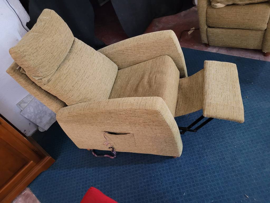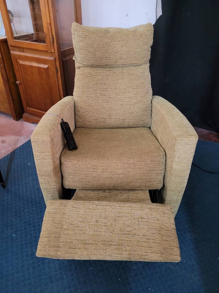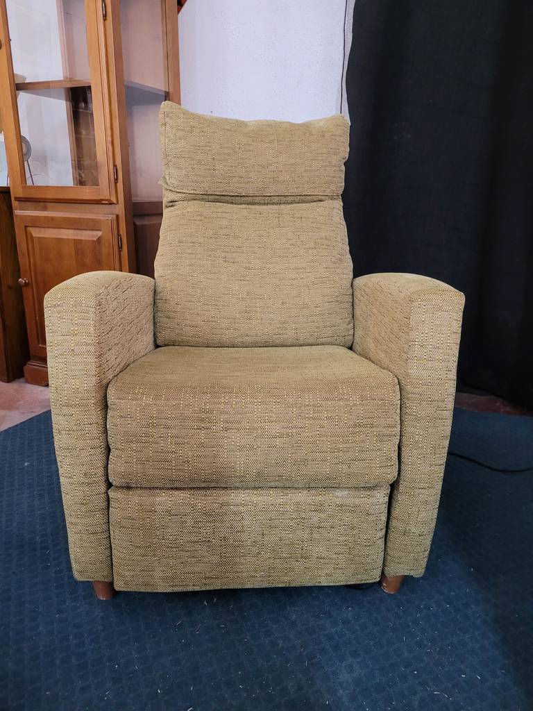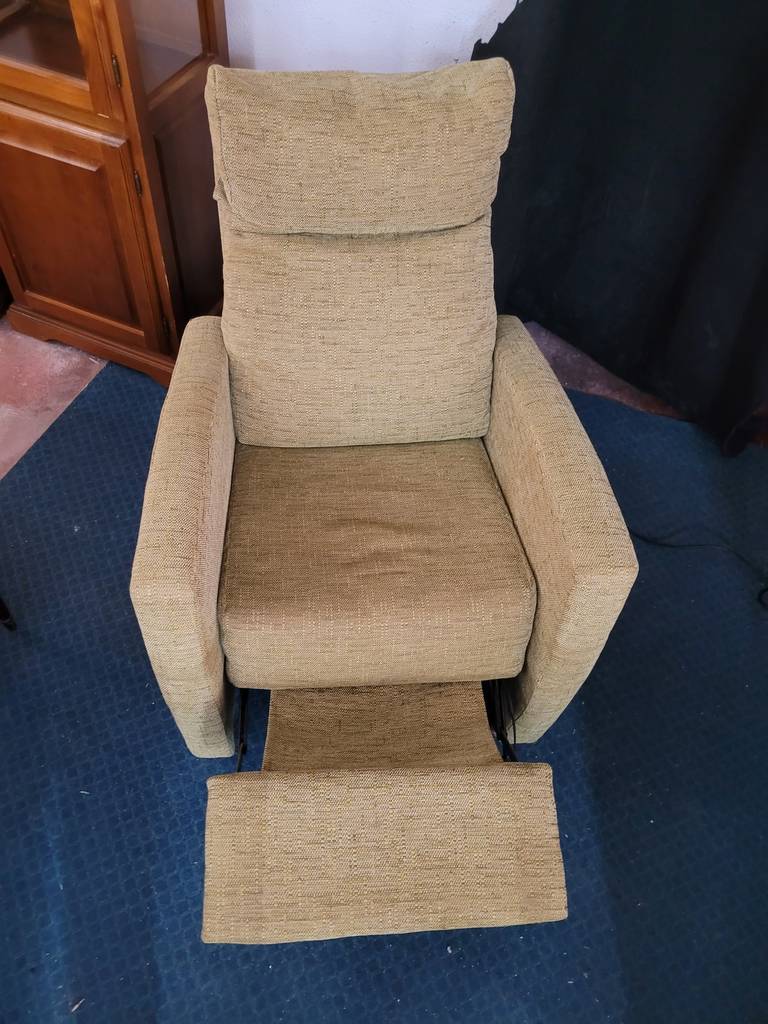 Sillón reclinable individual con mando de color marrón claro. Se trata de un cómodo sillón reclinable que cuenta con dos reposabrazos y una parte inferior que se eleva para poder apoyar los pies cómodamente. Es un sillón individual perfecto para ponerlo en un salón comedor. Como se puede observar en las fotografías se encuentra en buenas condiciones para ser utilizado.