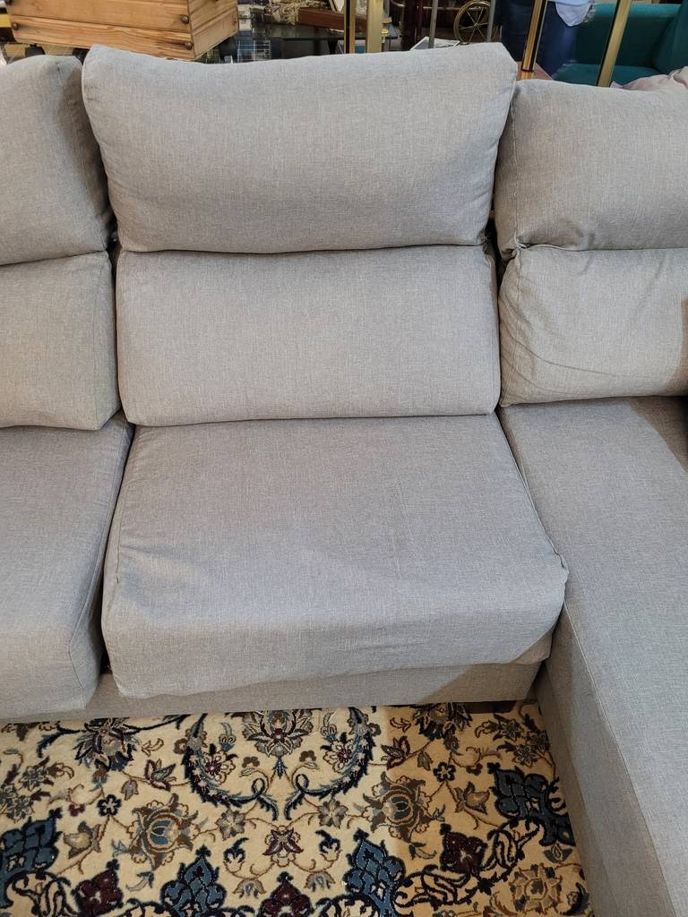 Sofá chaiselongue de grandes dimensiones tapizado con una tela de color gris. Se trata de un sofá de dos plazas grandes que tiene una tercera en forma de chaiselongue y resulta ideal para colocarlo en un salón comedor amplio. Como se puede observar en las fotografías al sofá le falta el soporte de un cabecero pero se puede usar sin problemas.