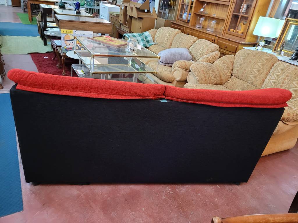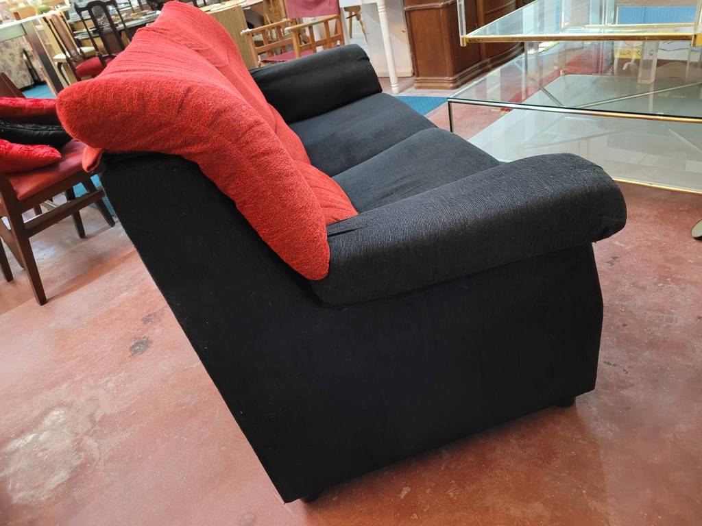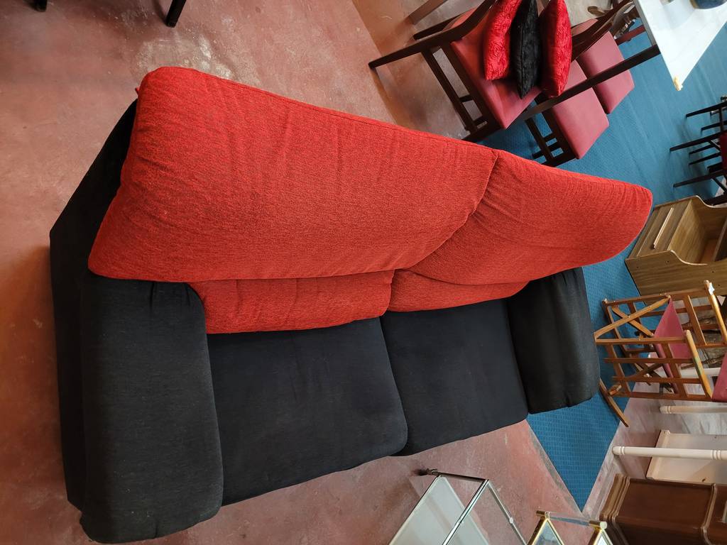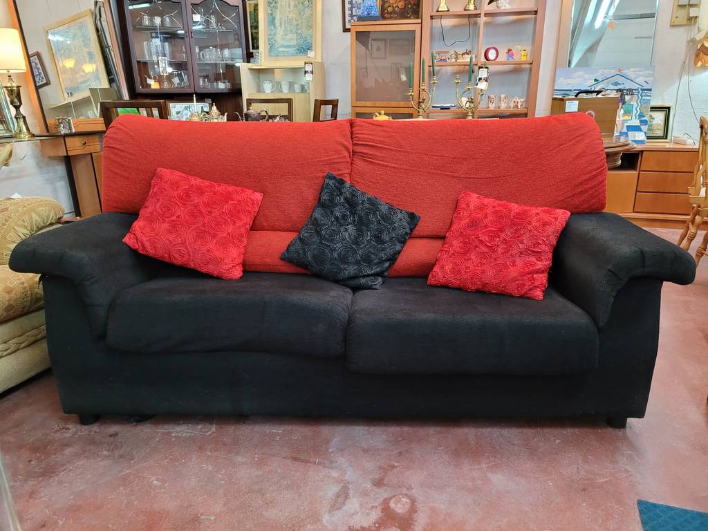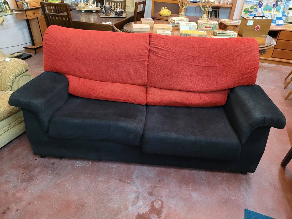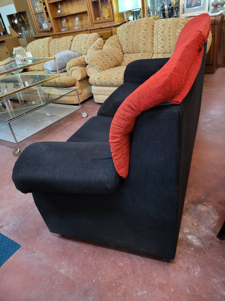 Sofá de dos amplias plazas y con una combinación de color negro y rojo que lo hace resaltar. Se trata de un sofá que dispone de asientos y respaldos cómodos y acolchados así como reposabrazos en los laterales para un mayor confort. Es ideal para colocar en un salón comedor. Como podemos observar en las fotografías le falta el cierre en el apoya brazos, pero en general se encuentra en buenas condiciones.