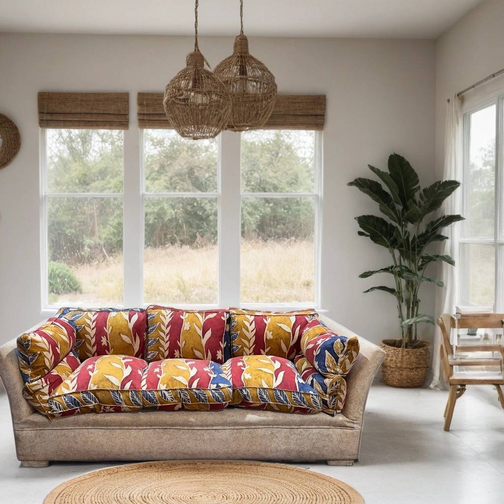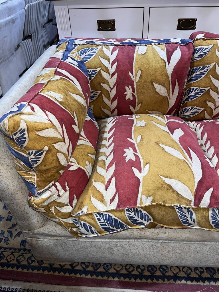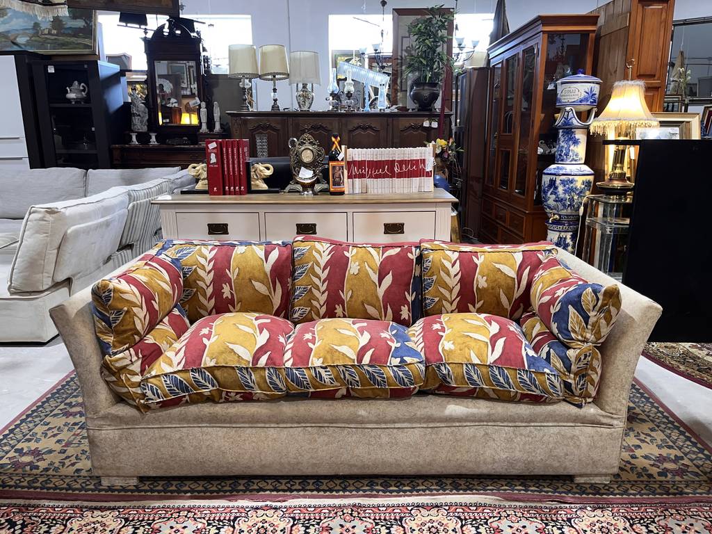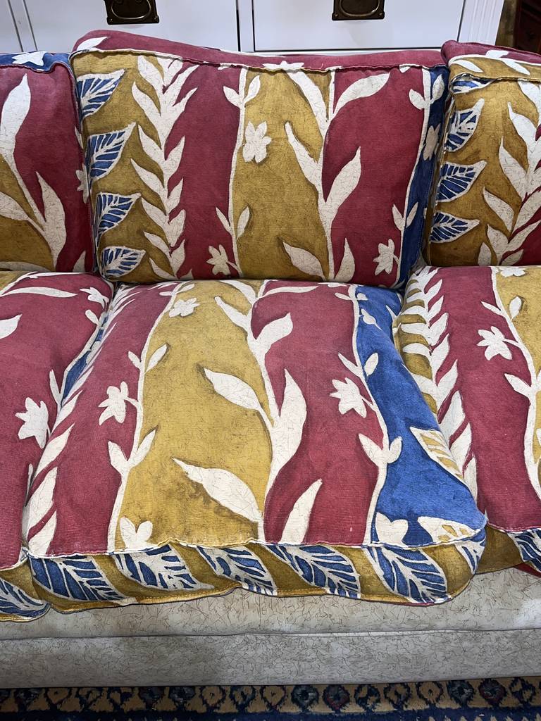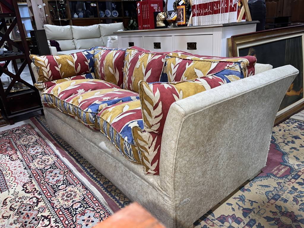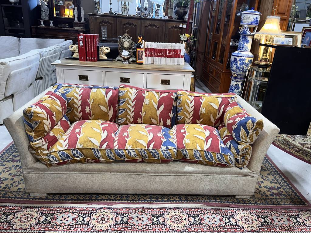 Sofá de tres amplias plazas cuya estructura es de color marrón claro y tiene unos asientos acolchados con estampados de varios colores. Se trata de un sofá de tres plazas que resulta ideal para colocarlo en un salón comedor de estilo moderno y actual para sentarse a ver cómodamente la televisión en él. Como se puede observar en las fotografías se encuentra en buenas condiciones.