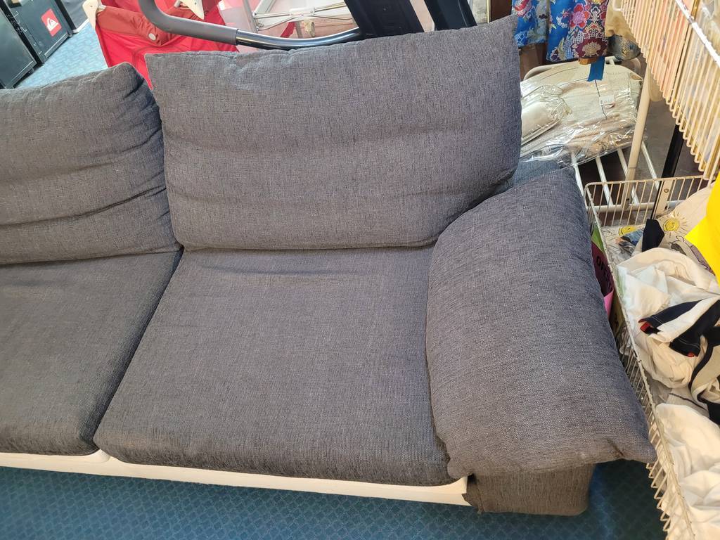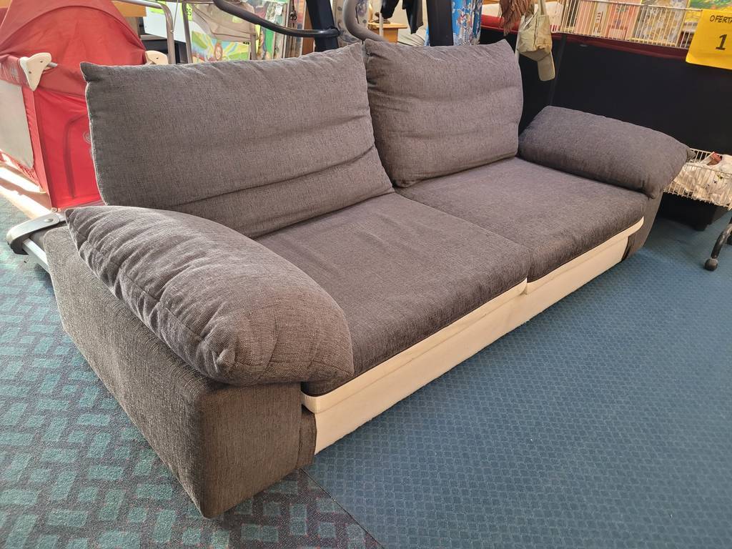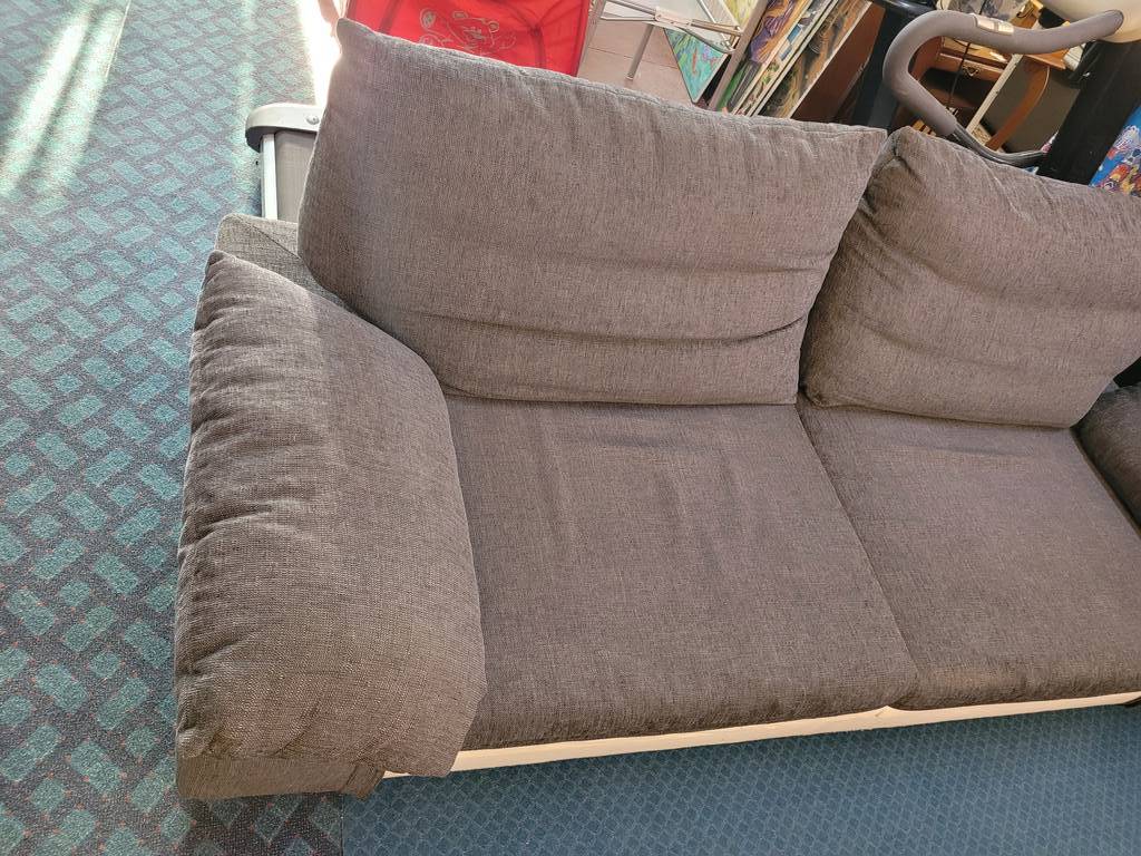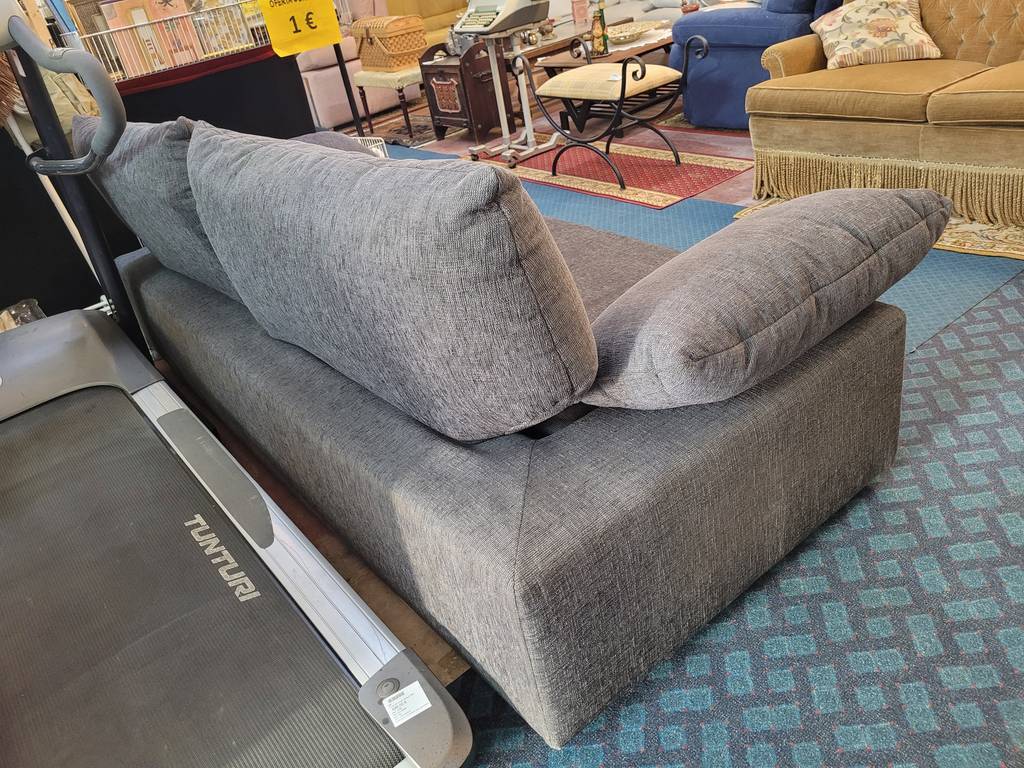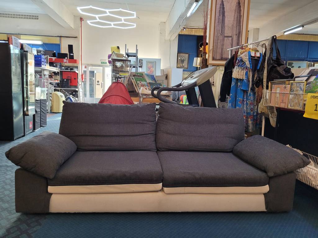 Sofá de tres amplias plazas con una tela tapizada de color gris oscuro. Se trata de un sofá grande con tres plazas que cuenta con dos cómodos reposabrazos, mullidos asientos y un respaldo confortable. Es un sofá perfecto para colocarlo en un salón comedor para ver la televisión sentado en él. Como se puede observar en las fotografías se encuentra en buenas condiciones.