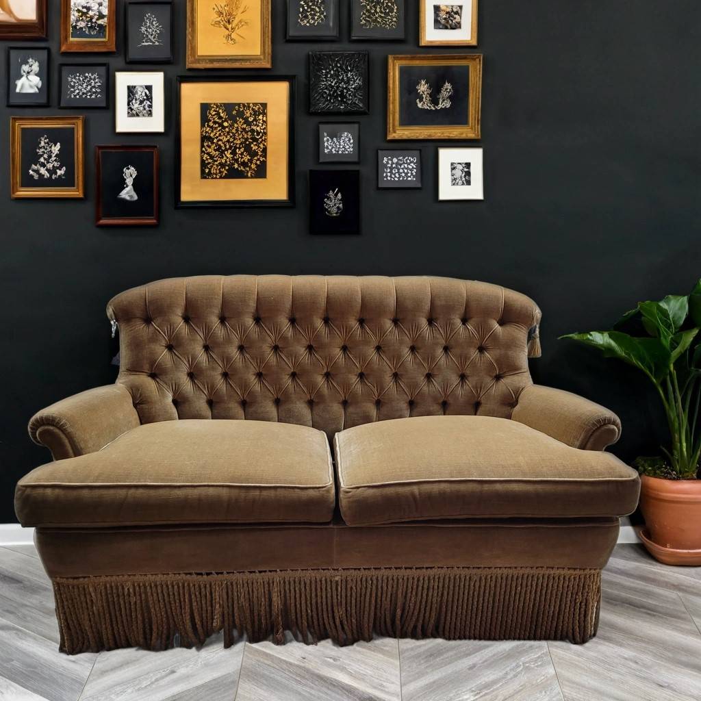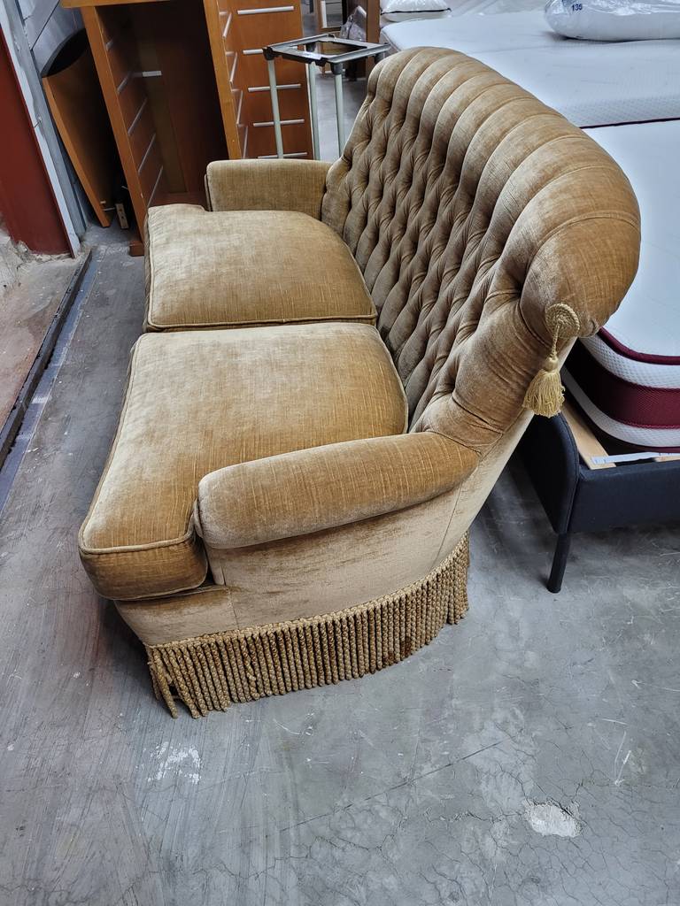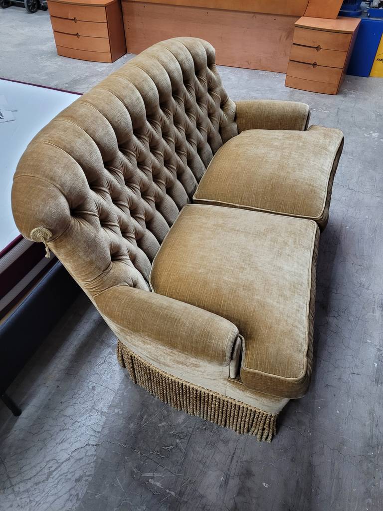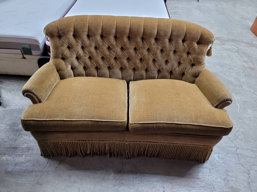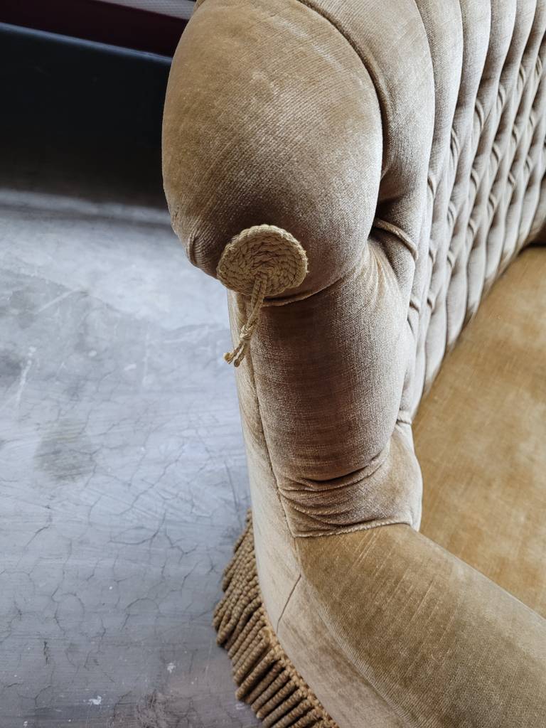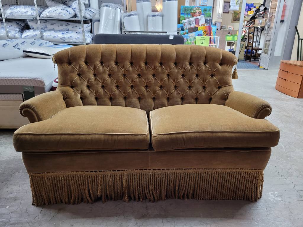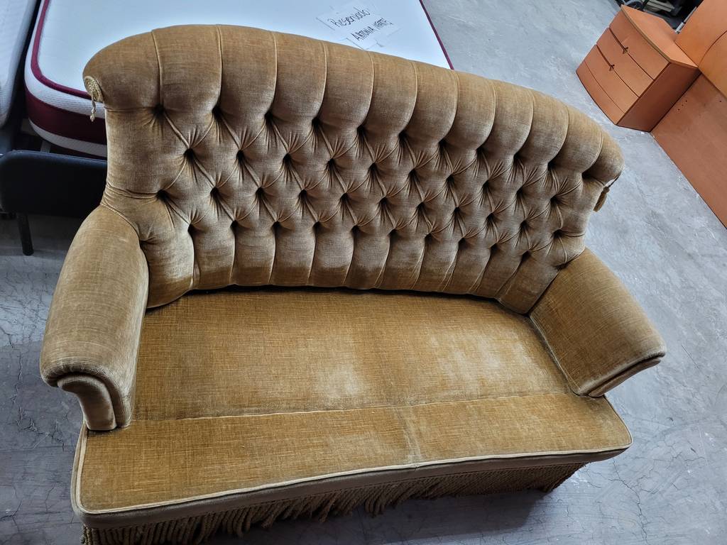 Sofá de estilo vintage que ha sido tapizado con un terciopelo elegante muy suave y agradable al tacto. Dispone de unos asientos y respaldos cómodos y acolchados asi como también reposabrazos laterales para un mayor confort. Es ideal para colocar en un salón comedor de tamaño medio o grande. Como podemos observar en las fotografías se encuentra en buen estado.